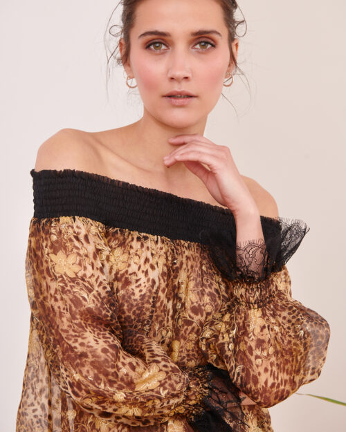 520,00 złPierwotna cena wynosiła: 520,00 zł.260,00 złAktualna cena wynosi: 260,00 zł.Efektowna bluzka z jedwabiu w ciepłych odcieniach brązu i złota, z subtelnym printem inspirowanym motywem panterki. Delikatna, lekko połyskująca tkanina nadaje całości elegancji i pięknie układa się na sylwetce. Szeroki, elastyczny dekolt pozwala nosić bluzkę opuszczoną na ramiona, podkreślając linię obojczyków i nadając stylizacji kobiecego charakteru. Długie rękawy zakończone marszczeniem i koronkowym wykończeniem dodają jej lekkości i dekoracyjnego akcentu.
