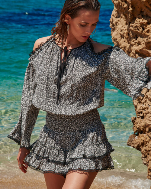 Delikatna, zwiewna tkanina z drobnym printem panterki pięknie układa się w ruchu. Luźna góra przechodzi w rozkloszowany dół z warstwowymi falbanami, które nadają całości dynamiki i sprawiają, że sukienka wygląda niezwykle kobieco.