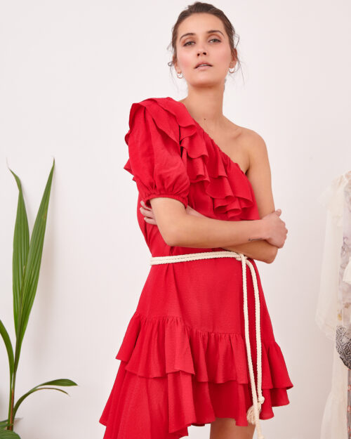 660,00 złPierwotna cena wynosiła: 660,00 zł.240,00 złAktualna cena wynosi: 240,00 zł.Kobieca, lekka sukienka w intensywnym czerwonym kolorze. Asymetryczny krój na jedno ramię z efektowną falbaną pięknie podkreśla linię ramion i dekoltu. Dół z podwójną falbaną układa się miękko w ruchu i dodaje sukience lekkości. Delikatna, fakturowana tkanina sprawia, że model wygląda bardzo świeżo i wakacyjnie.
