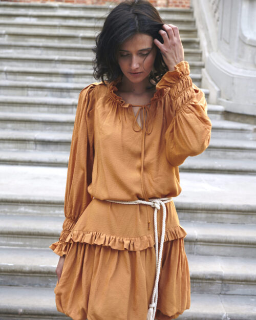 660,00 złPierwotna cena wynosiła: 660,00 zł.280,00 złAktualna cena wynosi: 280,00 zł.Sukienka mini w ciepłym, miodowym odcieniu. Uszyta z delikatnie fakturowanej tkaniny, która dobrze trzyma formę i podkreśla charakter fasonu. Luźna góra z dekoltem ozdobionym subtelną falbaną nadaje całości romantycznej lekkości. Długie rękawy z marszczeniem budują objętość. Dół w formie bombki tworzy wyrazistą linię i dodaje sukience dziewczęcego charakteru.