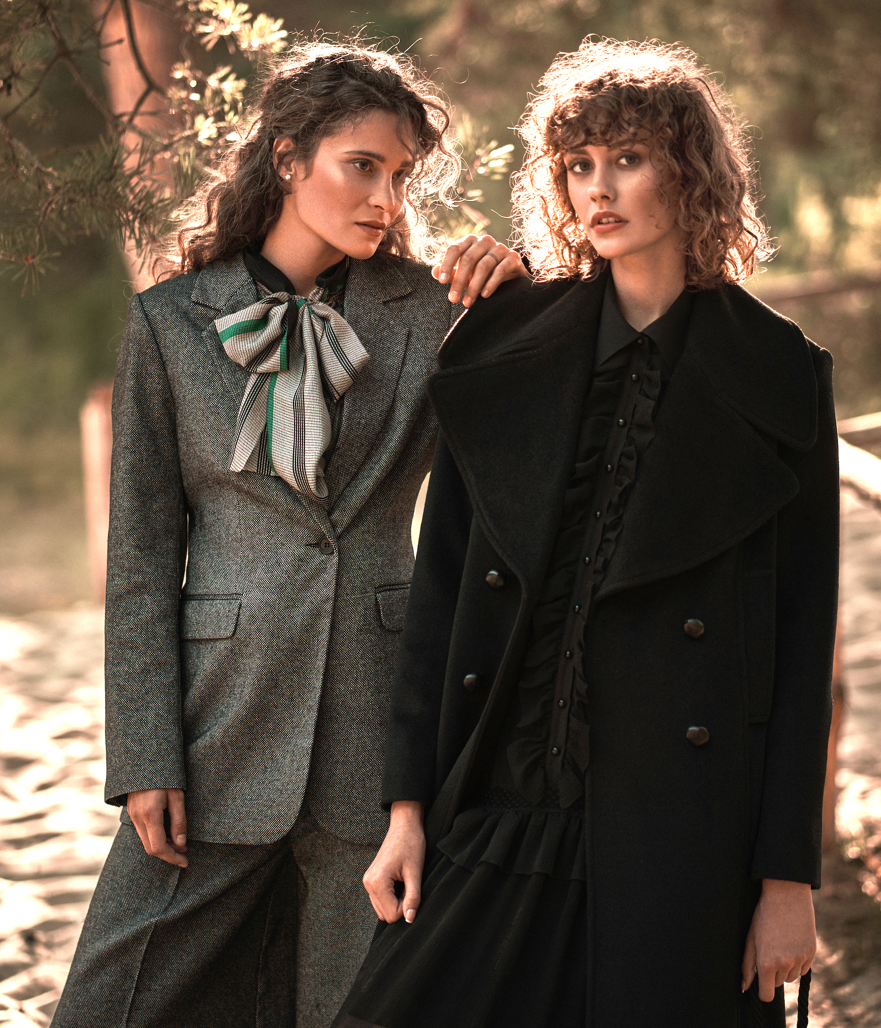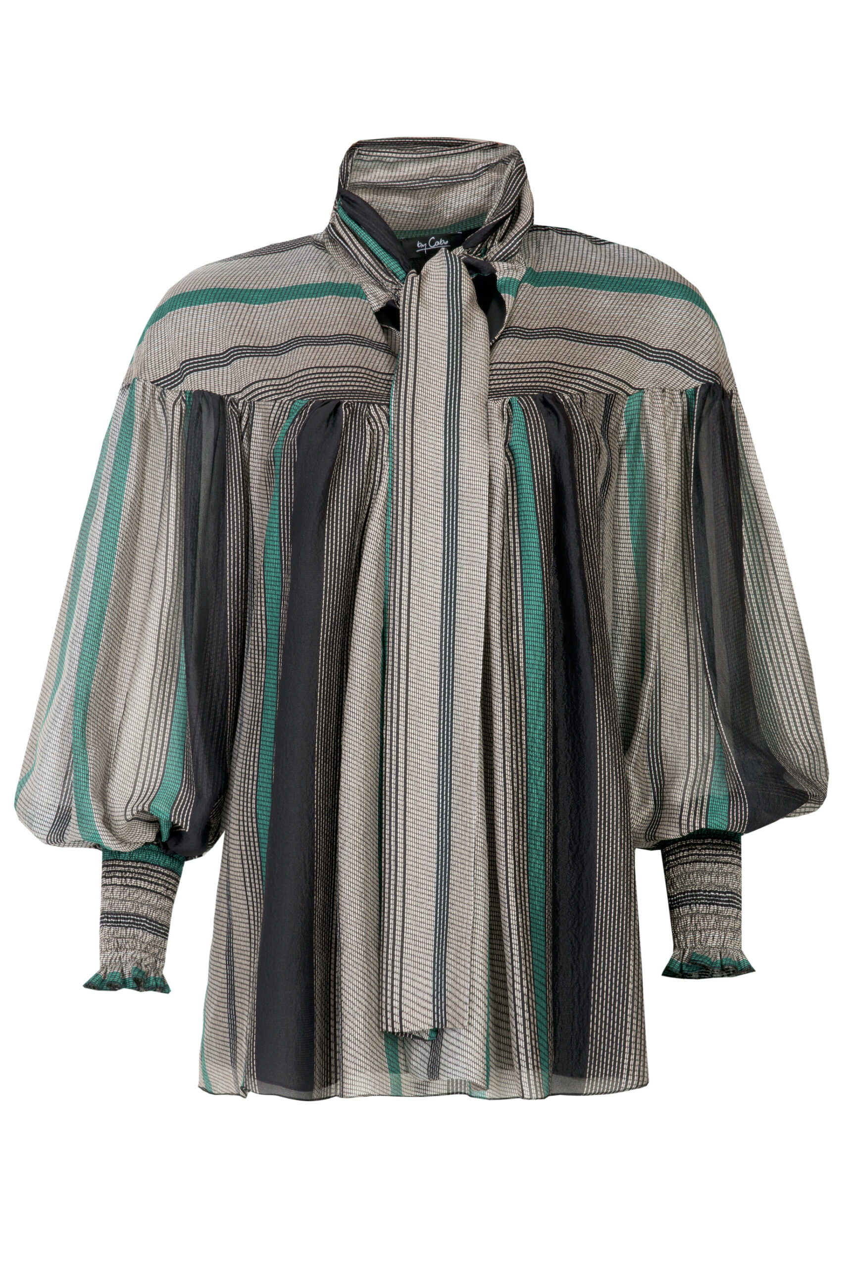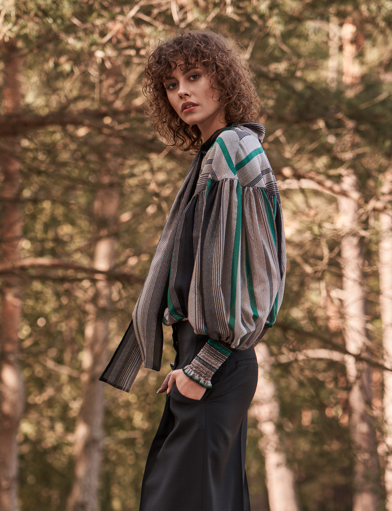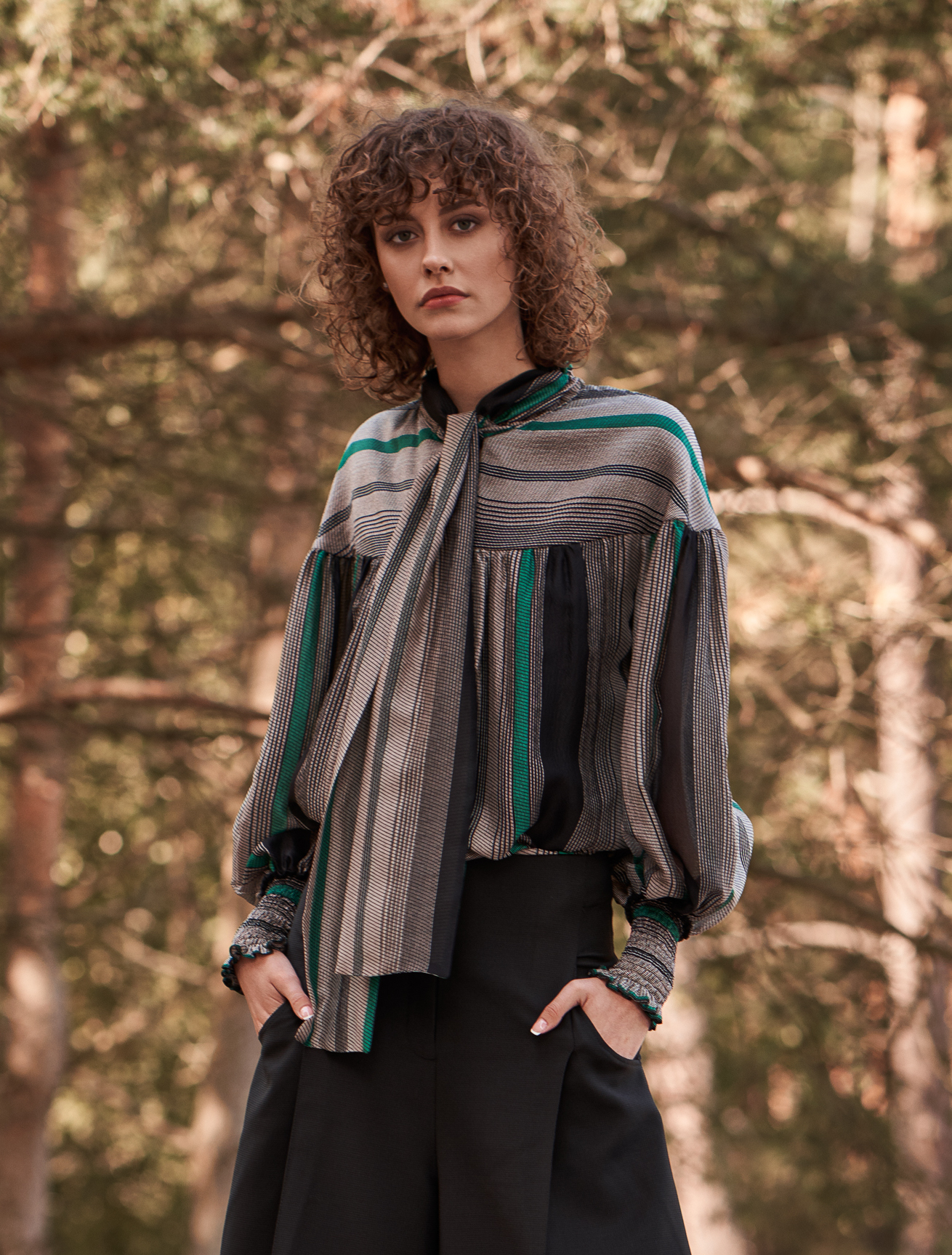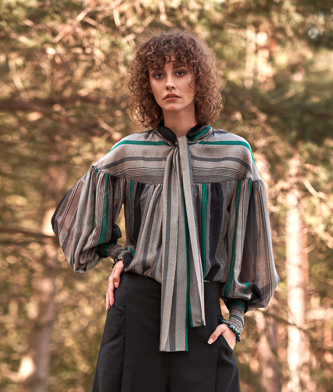 Jedwabna koszula przyciąga wzrok wyrafinowanym, wielobarwnym wzorem w pionowe pasy, łączącym odcienie czerni, grafitu, beżu oraz intensywnej zieleni. Transparentna, lekka tkanina jedwabna nadaje jej luksusowego, delikatnie eterycznego charakteru. Model wyróżnia się obszernym, swobodnym krojem z efektownymi bufkami w rękawach. Szerokie rękawy i dopasowane mankiety z elastycznym marszczeniem i subtelną falbanką na wykończeniu tworzą elegancki kontrast i podkreślają kobiecy styl. Góra koszuli została zaprojektowana z dekoracyjną stójką i długim, szerokim wiązaniem — można je zawiązać w kokardę lub pozostawić luźno, tworząc bardziej swobodny, artystyczny efekt.