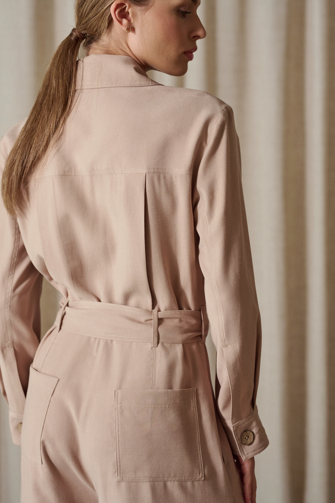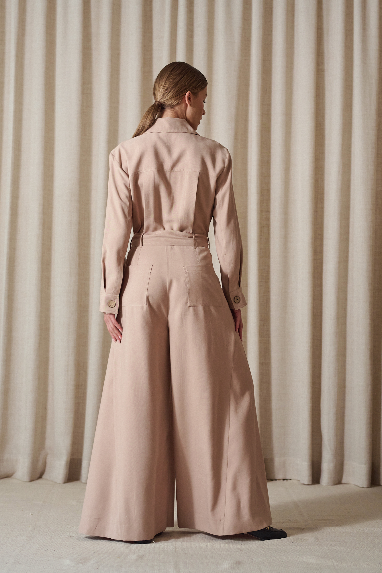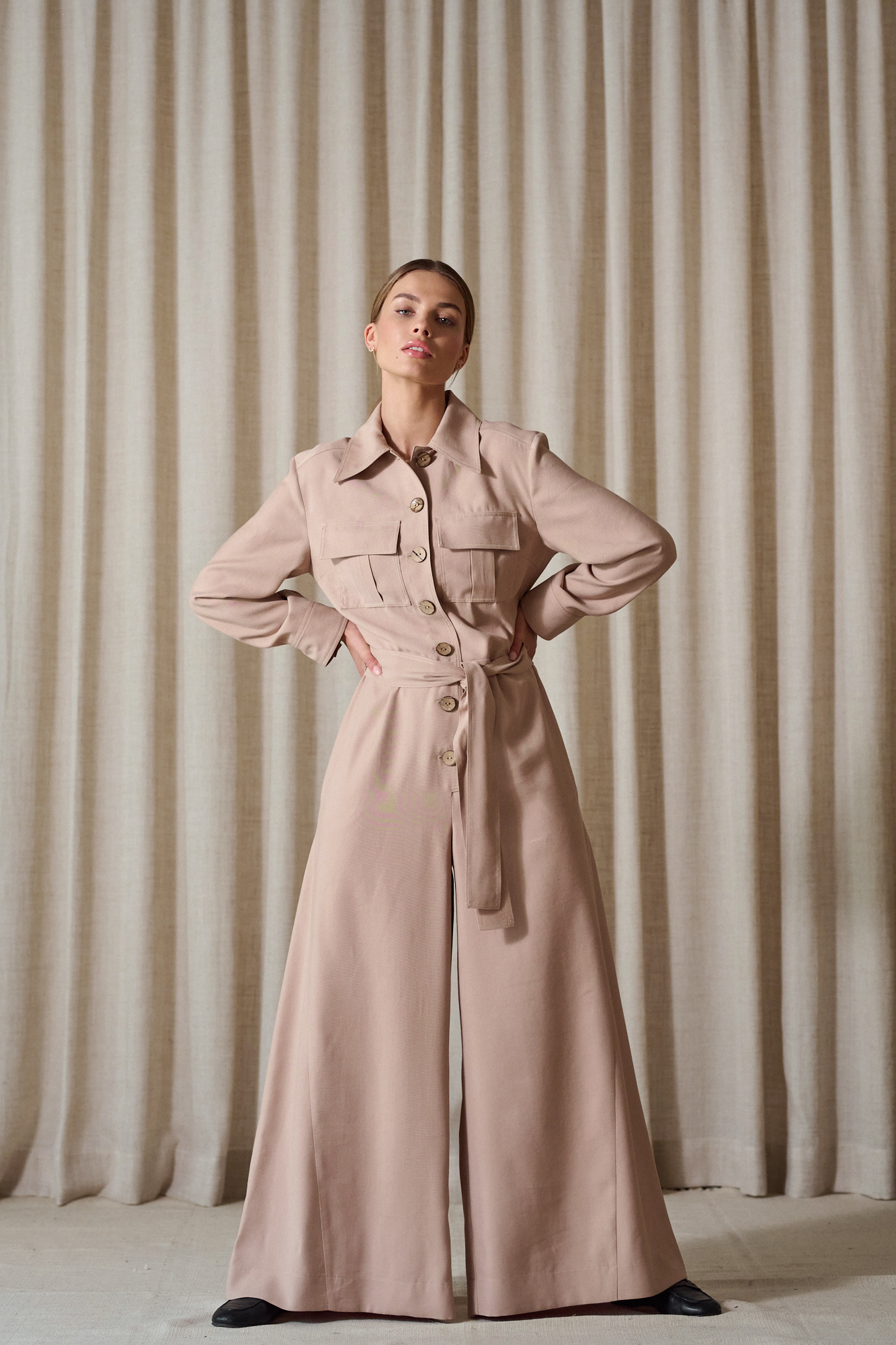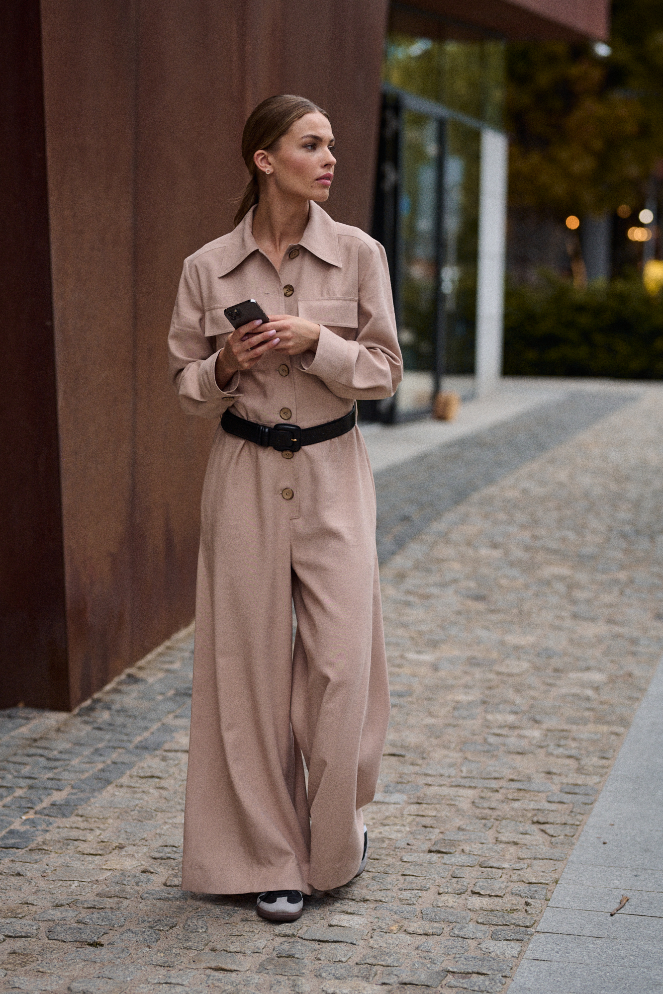 Dwie duże zakładki na plecach, naszywane kieszenie z tyłu, dodatkowe kieszenie na bokach. Talia zaznaczona paskiem, który z tyłu podtrzymują szlufki.