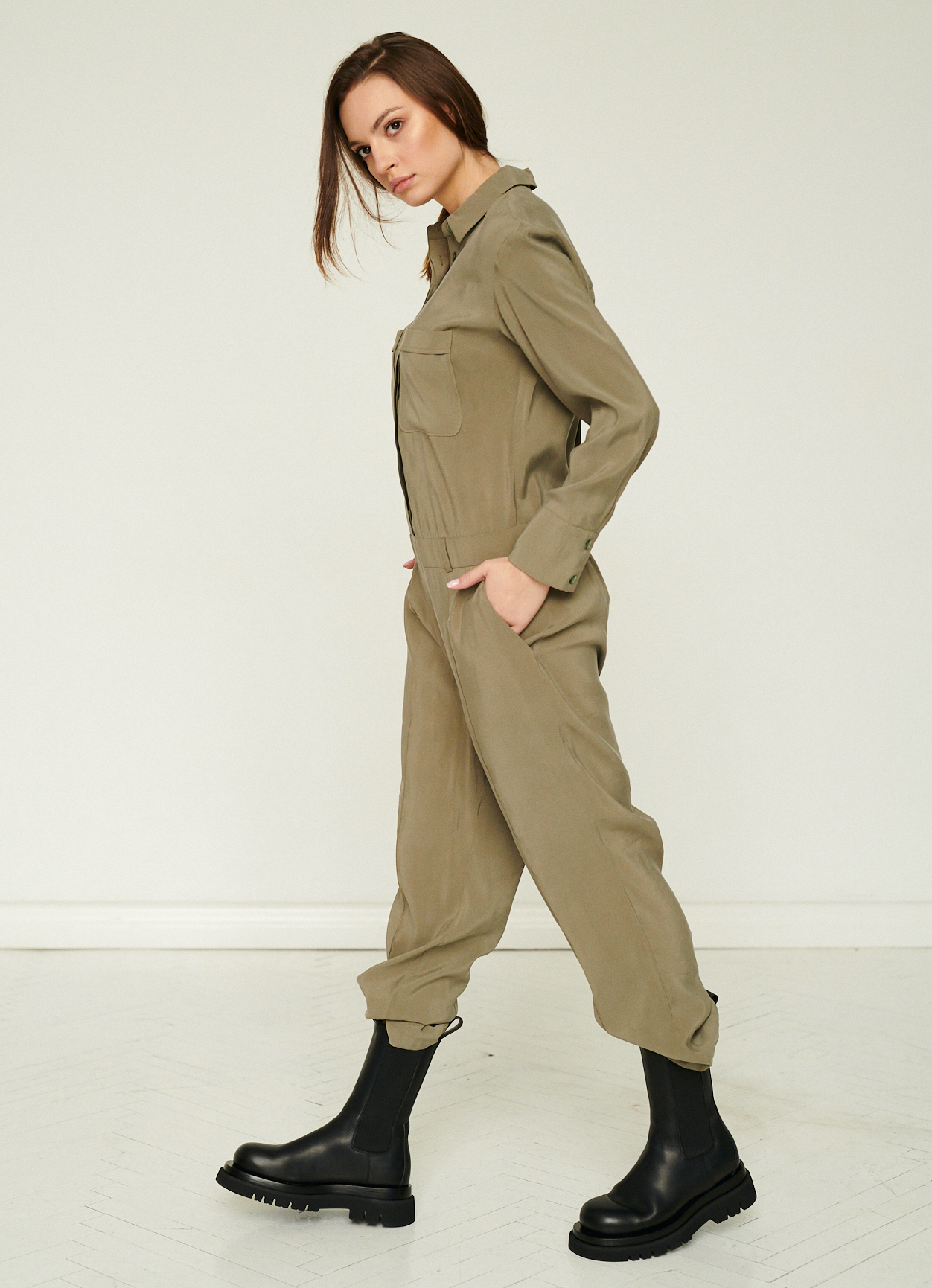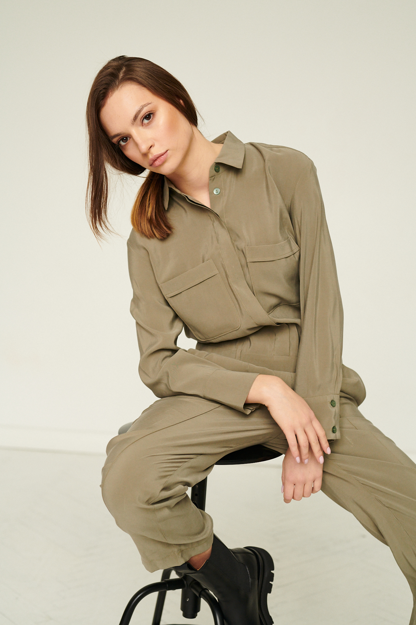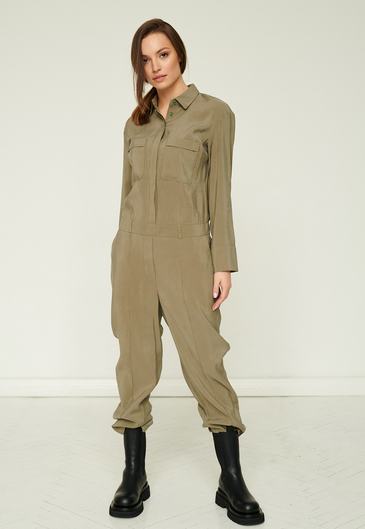 Ten stylowy kombinezon w odcieniu stonowanej oliwki łączy funkcjonalność z nowoczesną, miejską elegancją. Wykonany z lekkiej, miękko układającej się tkaniny, zapewnia komfort noszenia i swobodę ruchu, jednocześnie zachowując wyraźnie zarysowaną formę.