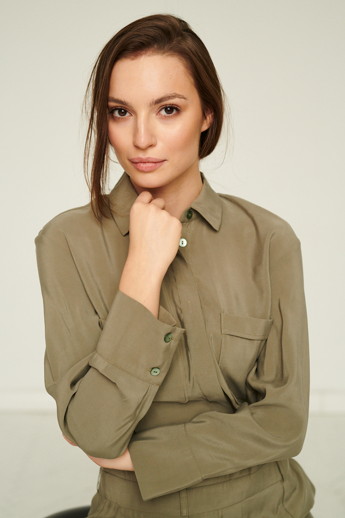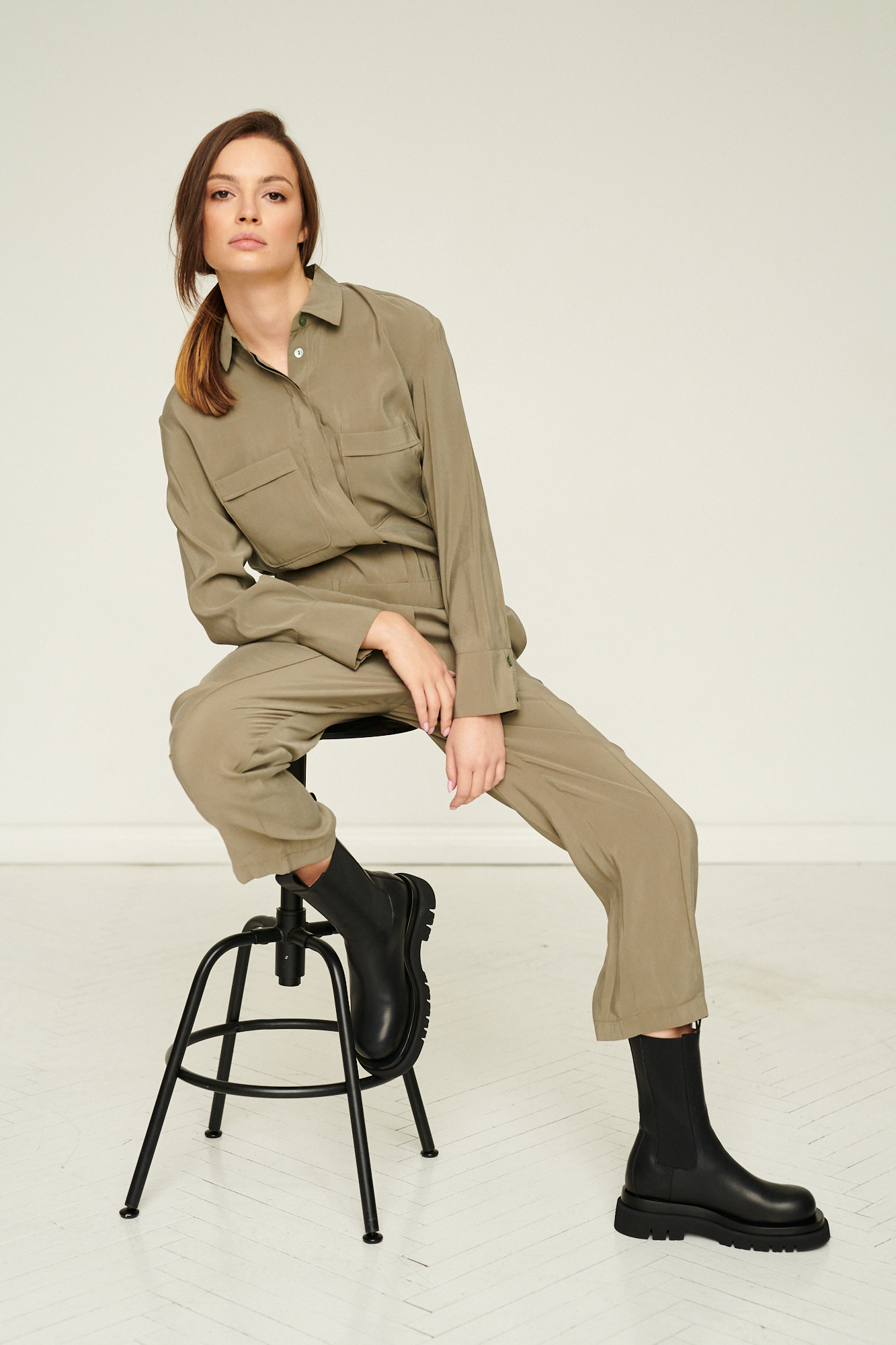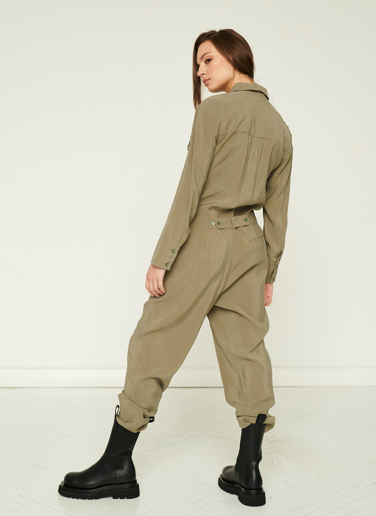Ten stylowy kombinezon w odcieniu stonowanej oliwki łączy funkcjonalność z nowoczesną, miejską elegancją. Wykonany z lekkiej, miękko układającej się tkaniny, zapewnia komfort noszenia i swobodę ruchu, jednocześnie zachowując wyraźnie zarysowaną formę.