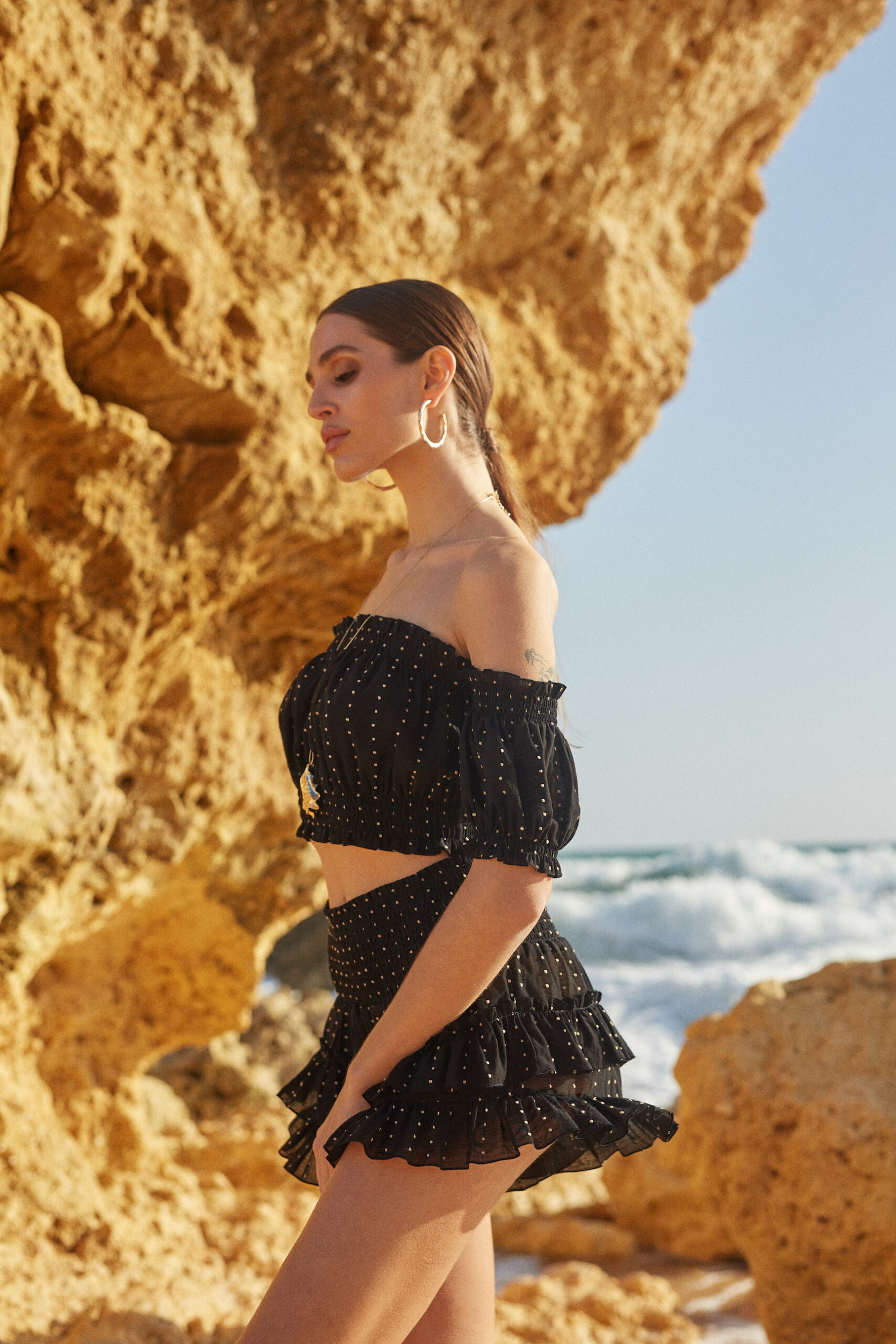 Krótki top z rękawkami i szorty z falbankami to idealny strój na wakacyjne wyjazdy. Uszyty z cienkiej, batystowej tkaniny, w klasycznej czerni w kropki w kolorze piasku.