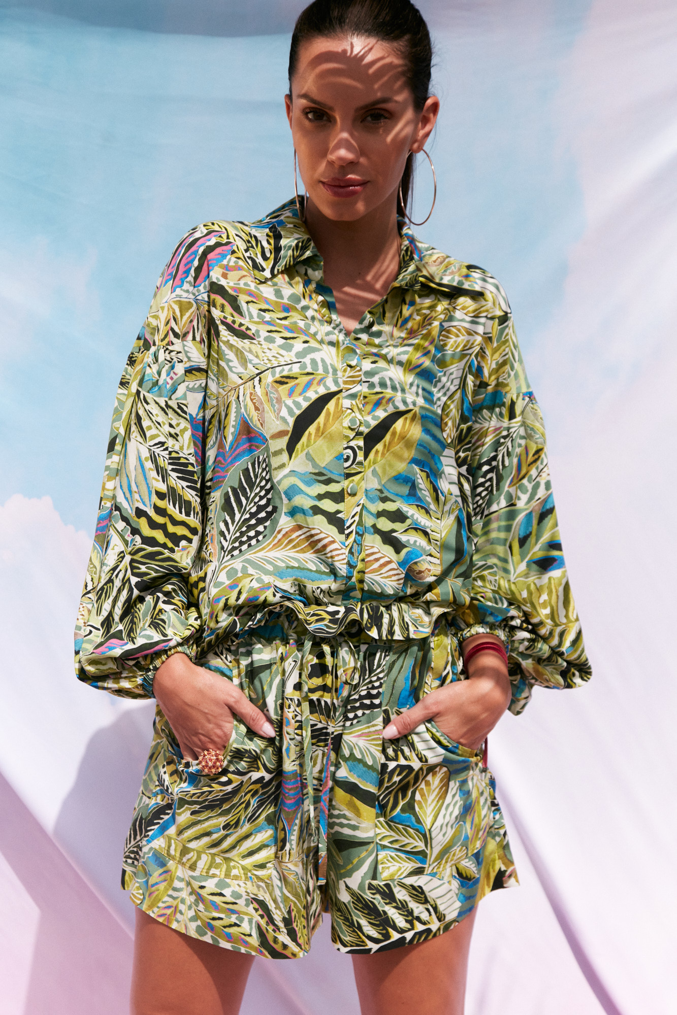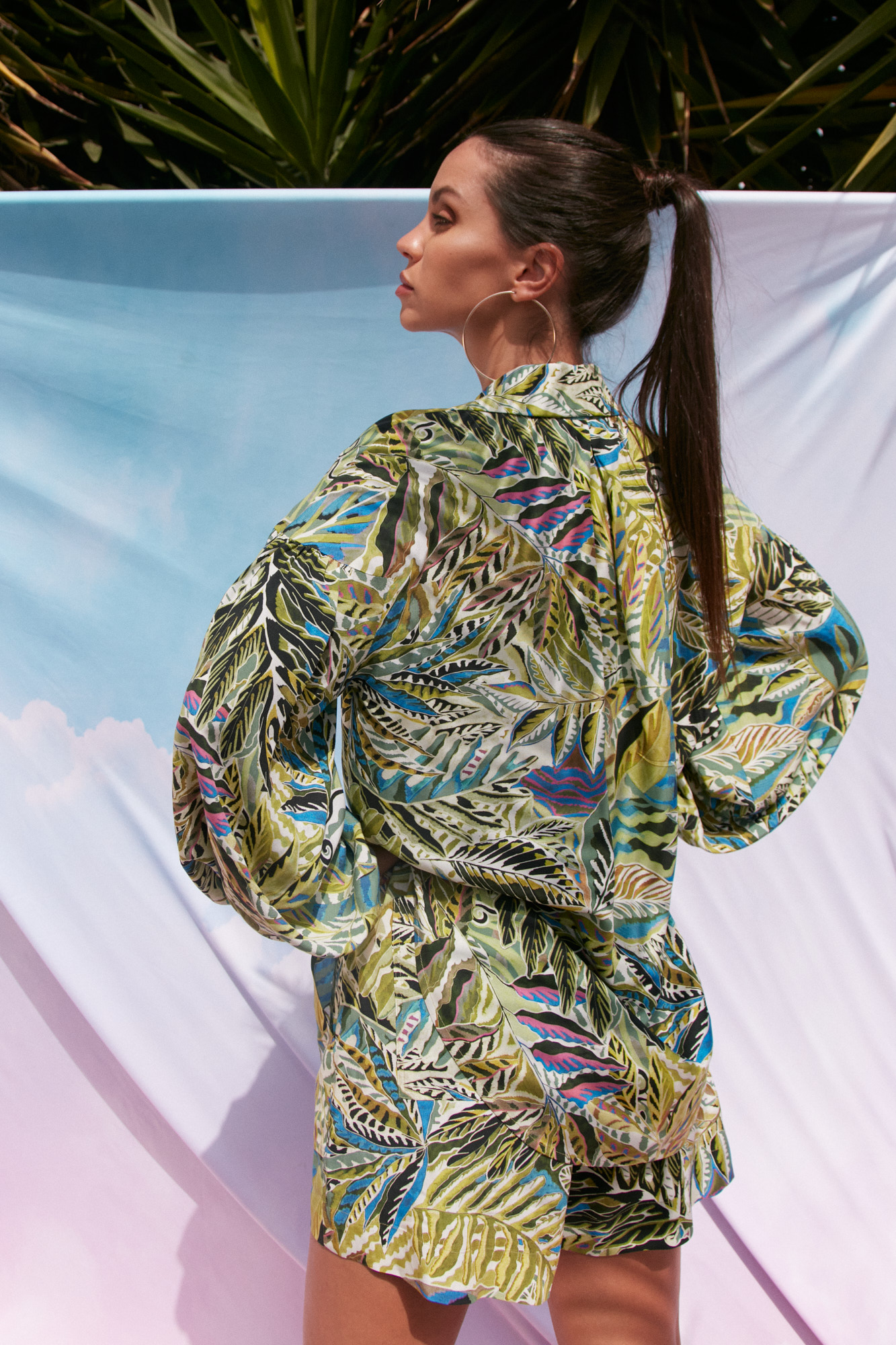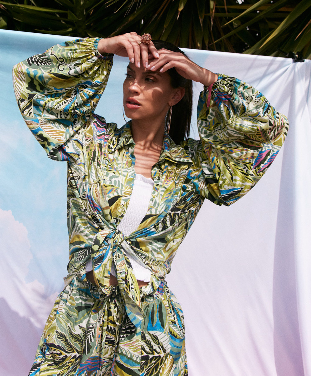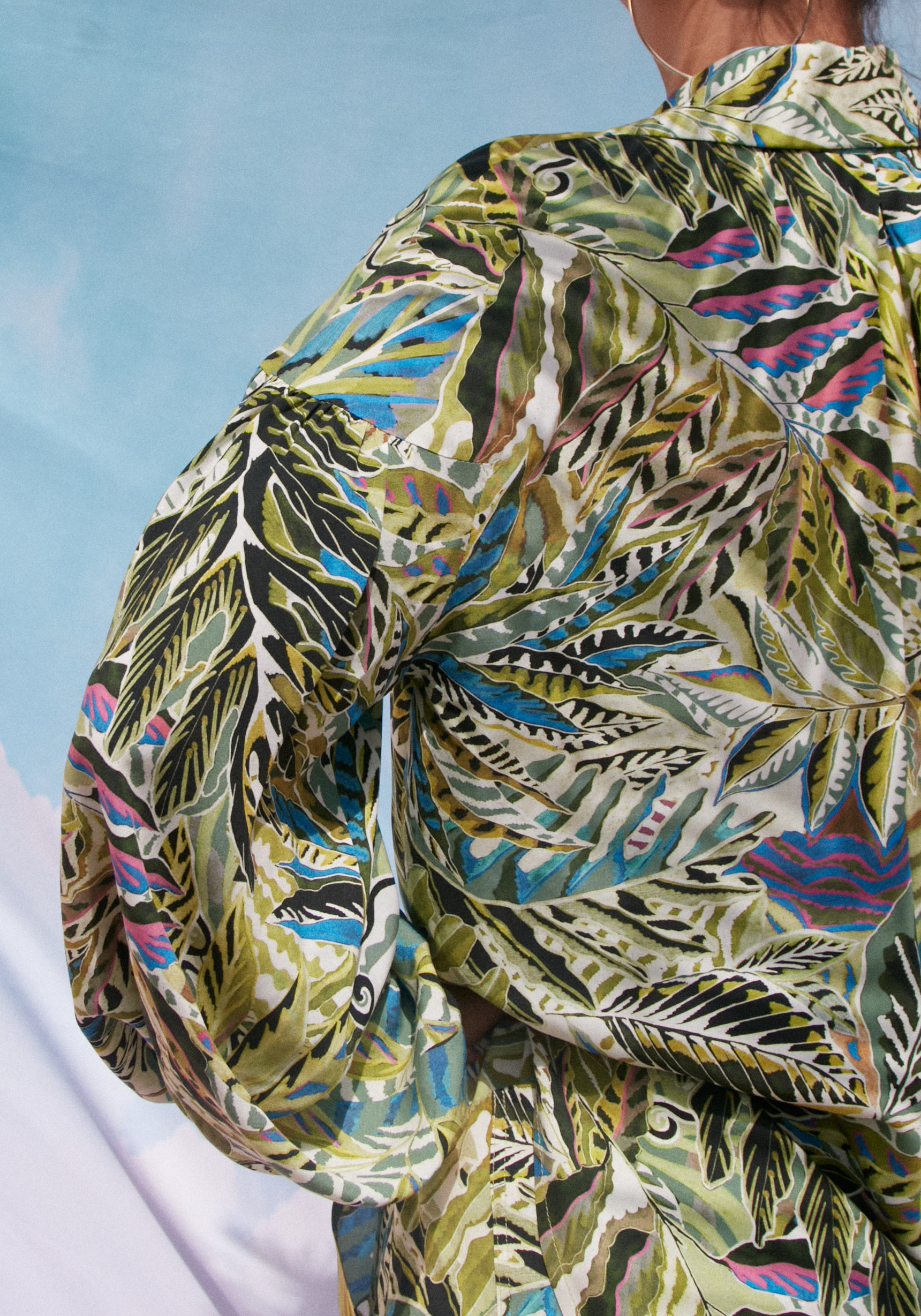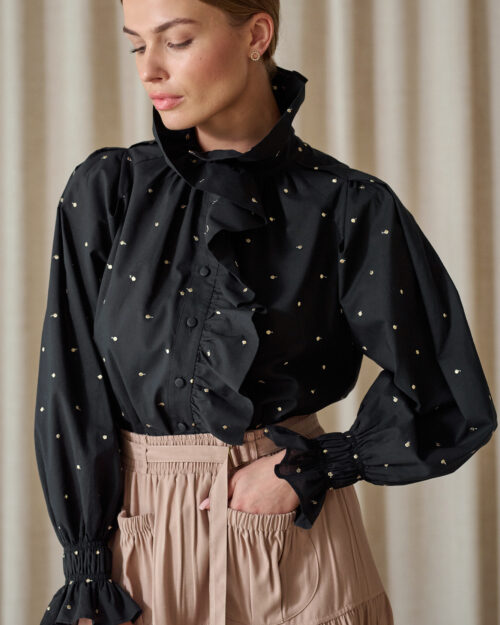 Koszula ma nieco dłuższy tył, dół podkreślony lamówką, rękawy nisko wszyte, obciągnięte materiałem guziczki.