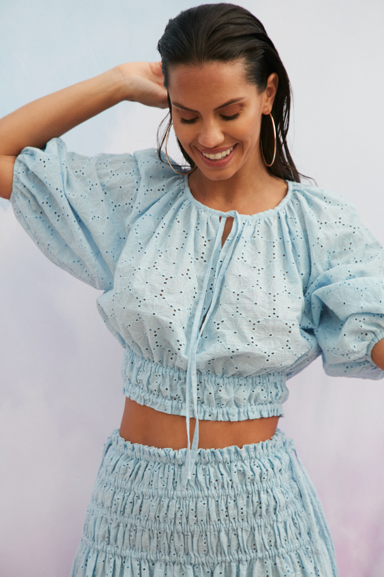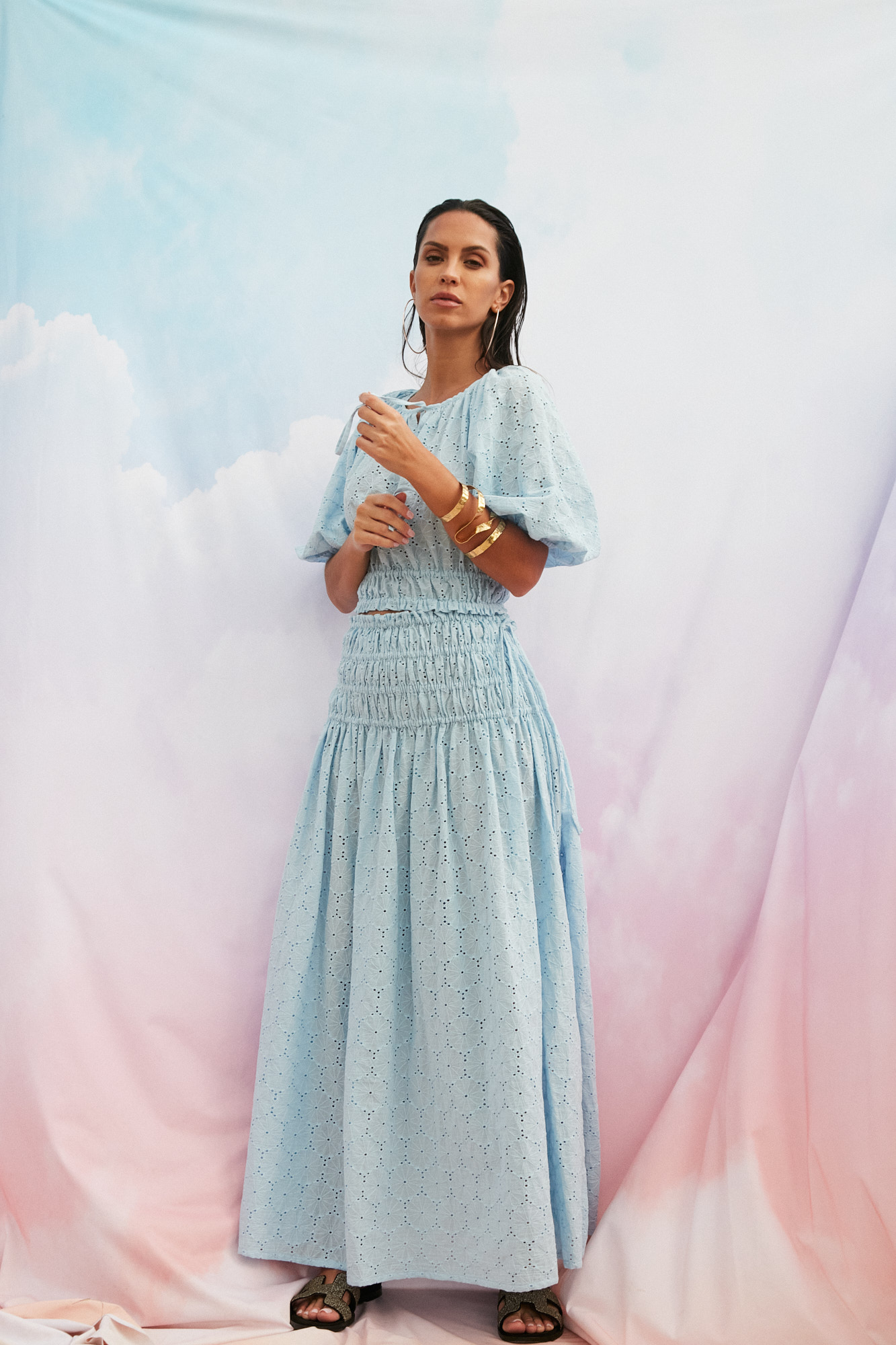 Bluzka ma dekolt z wiązaniem, spódnica wysokie rozporki na bokach.