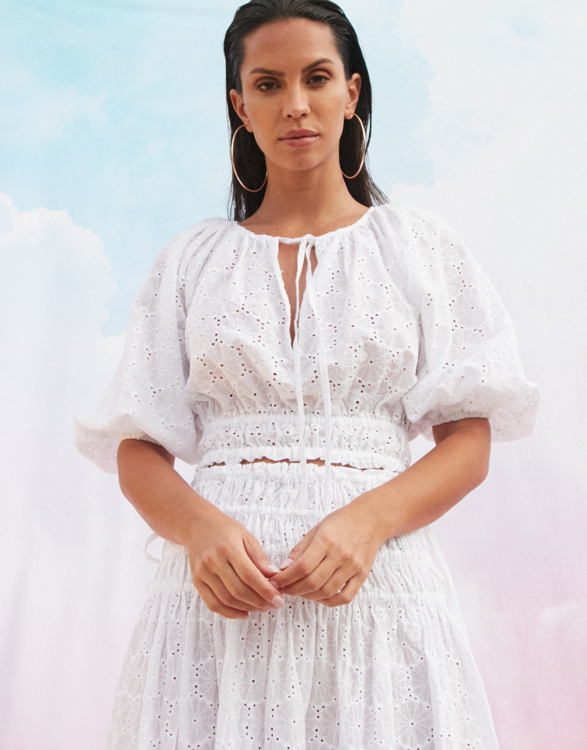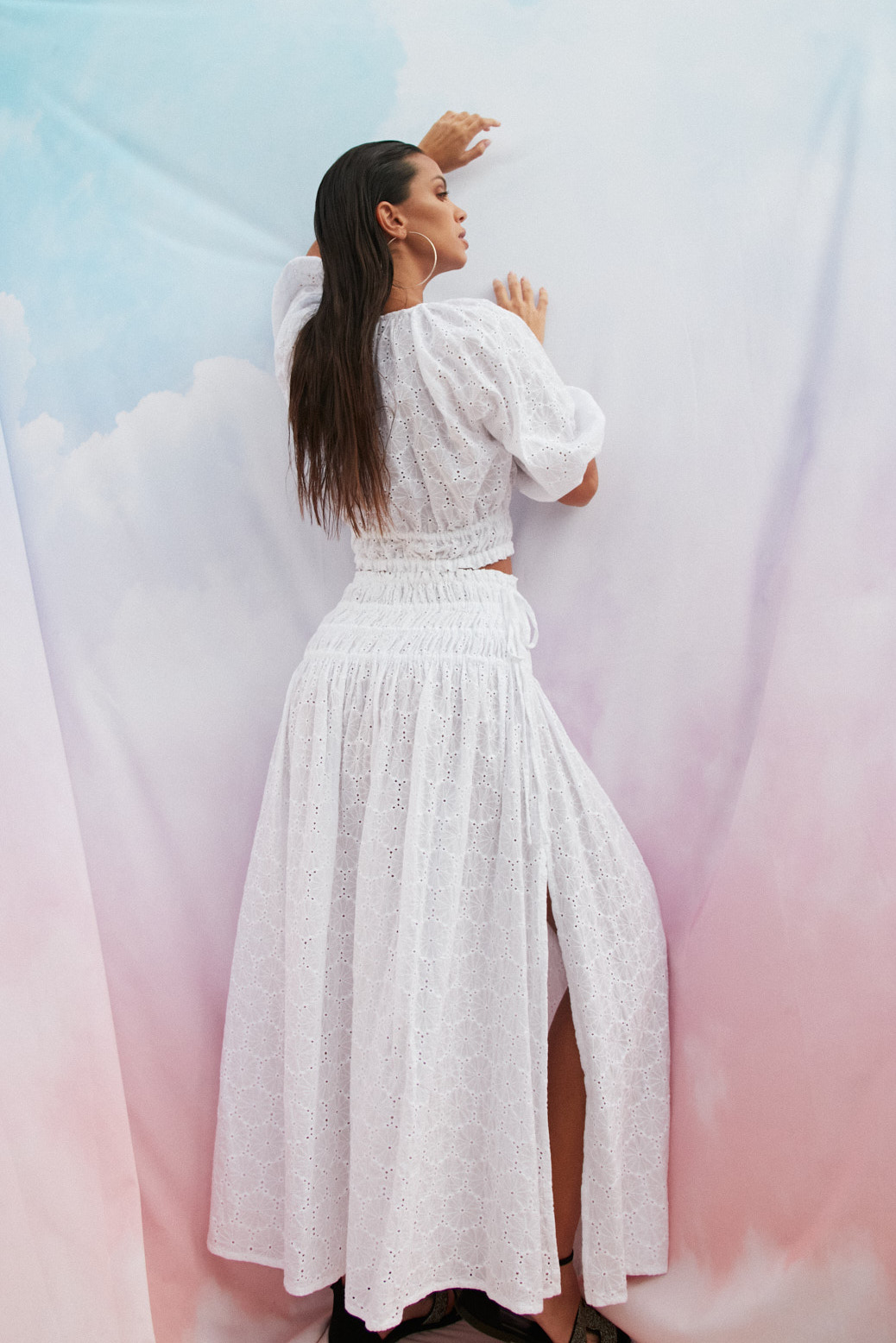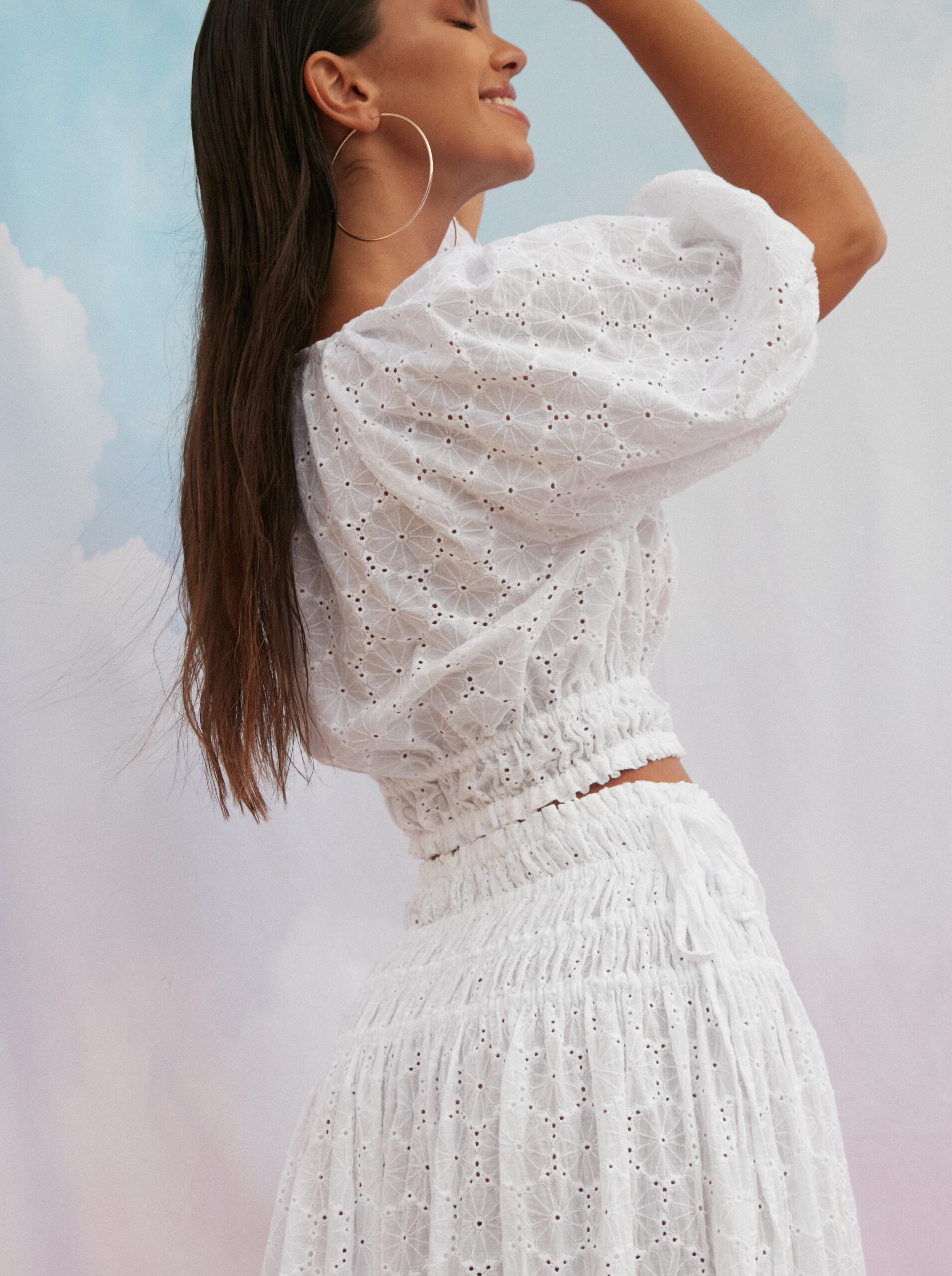 Komplet bluzka ze spódnicą w haftowanej tkaninie. Szerokie rękawy, bufki, top zakończony w pasie gumkami, co stanowi idealną całość ze spódnicą, która ma rząd gumek na biodrach.
