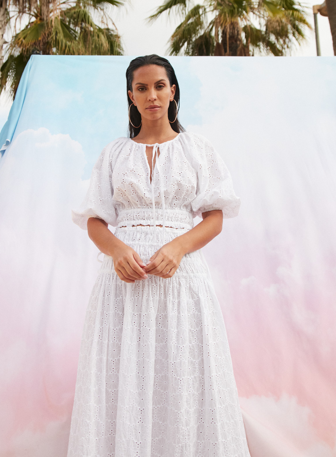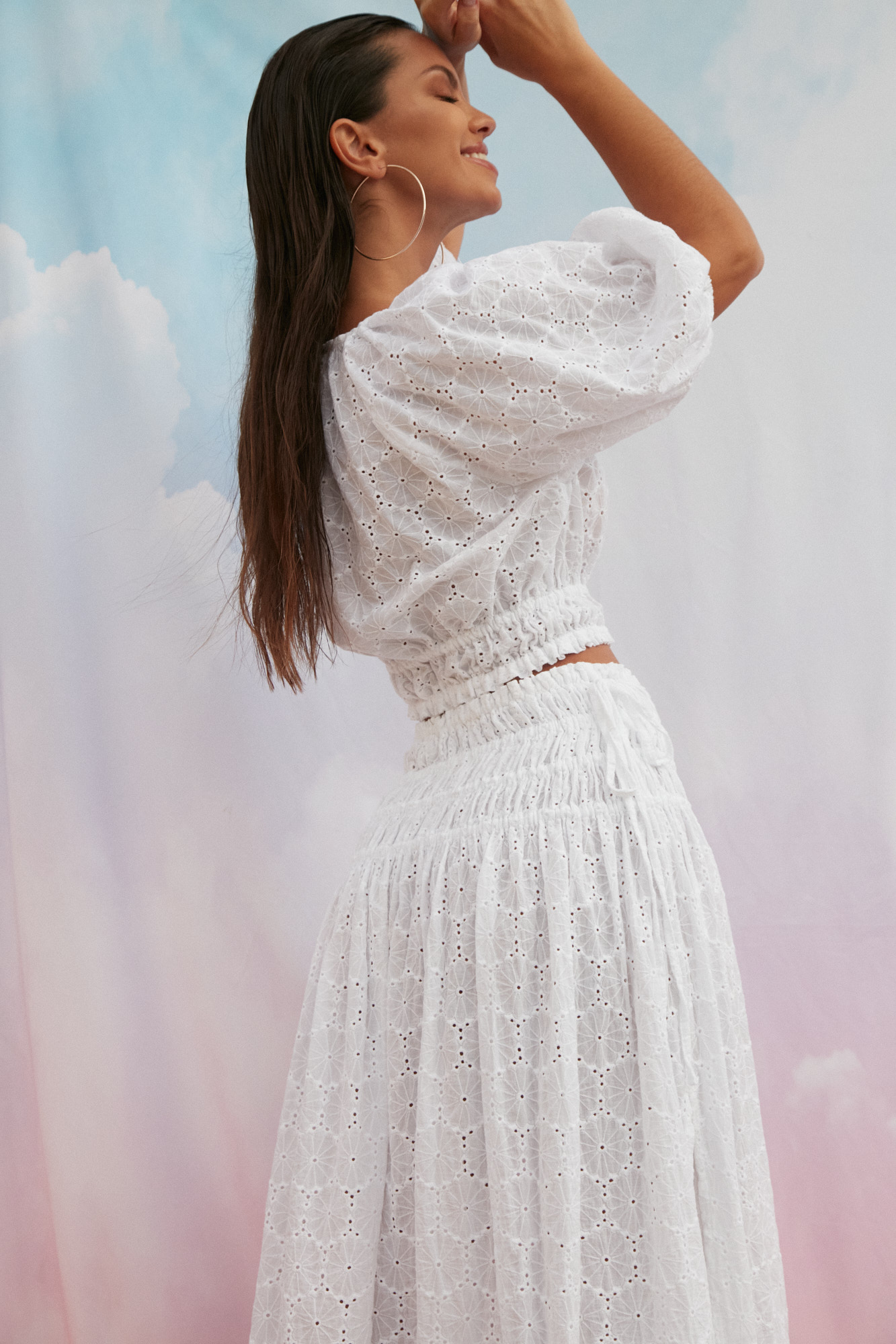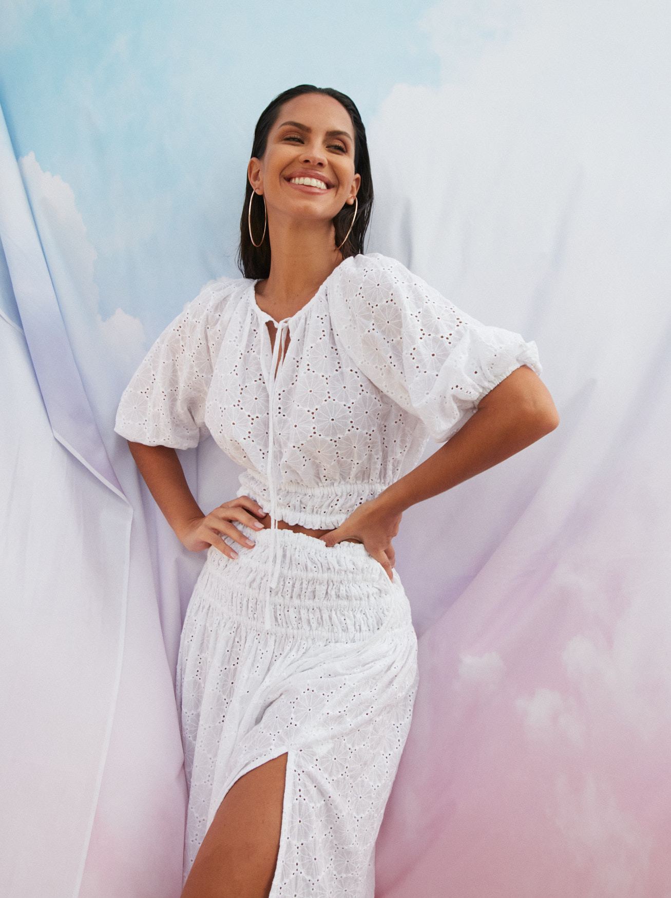 Komplet bluzka ze spódnicą w haftowanej tkaninie. Szerokie rękawy, bufki, top zakończony w pasie gumkami, co stanowi idealną całość ze spódnicą, która ma rząd gumek na biodrach.