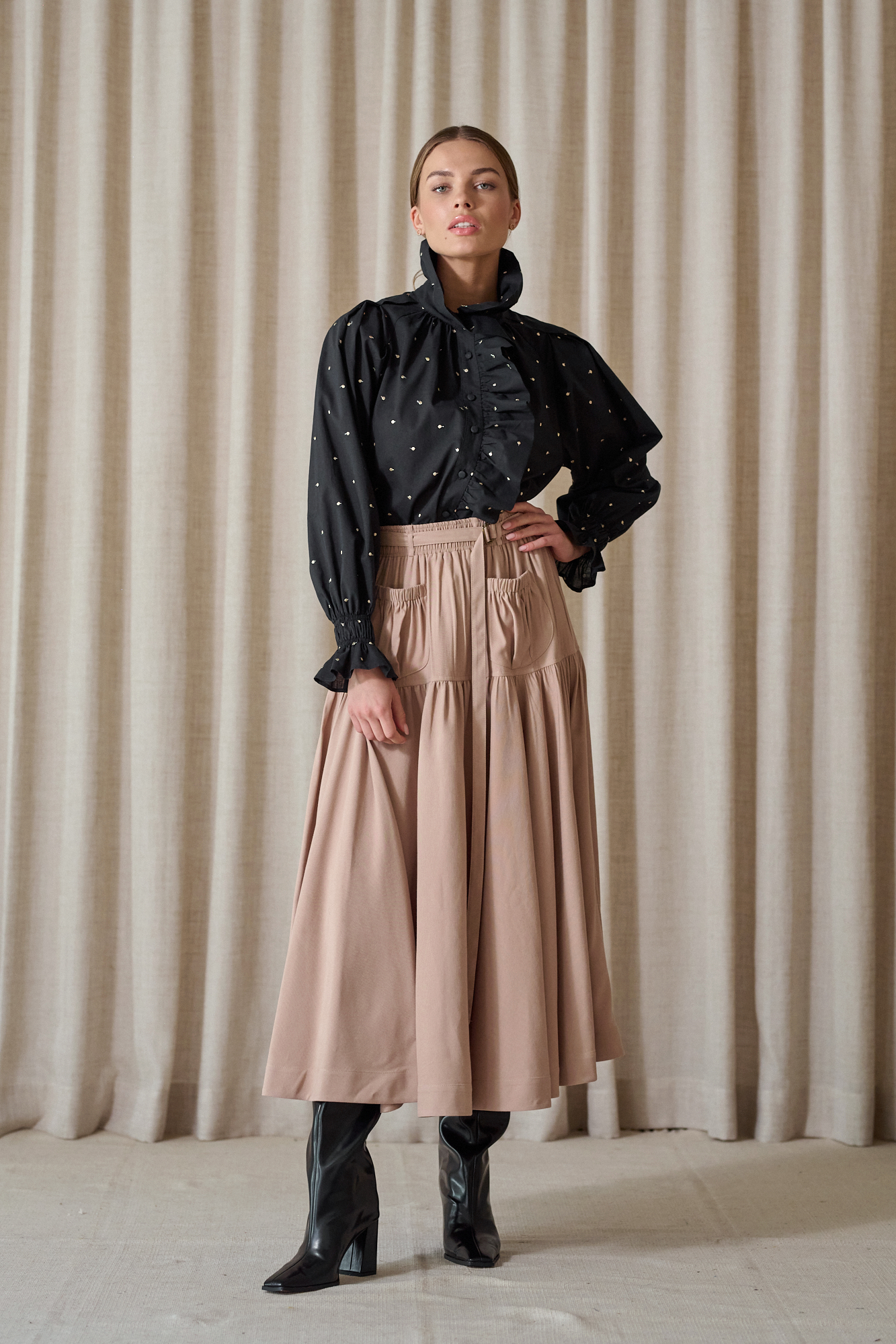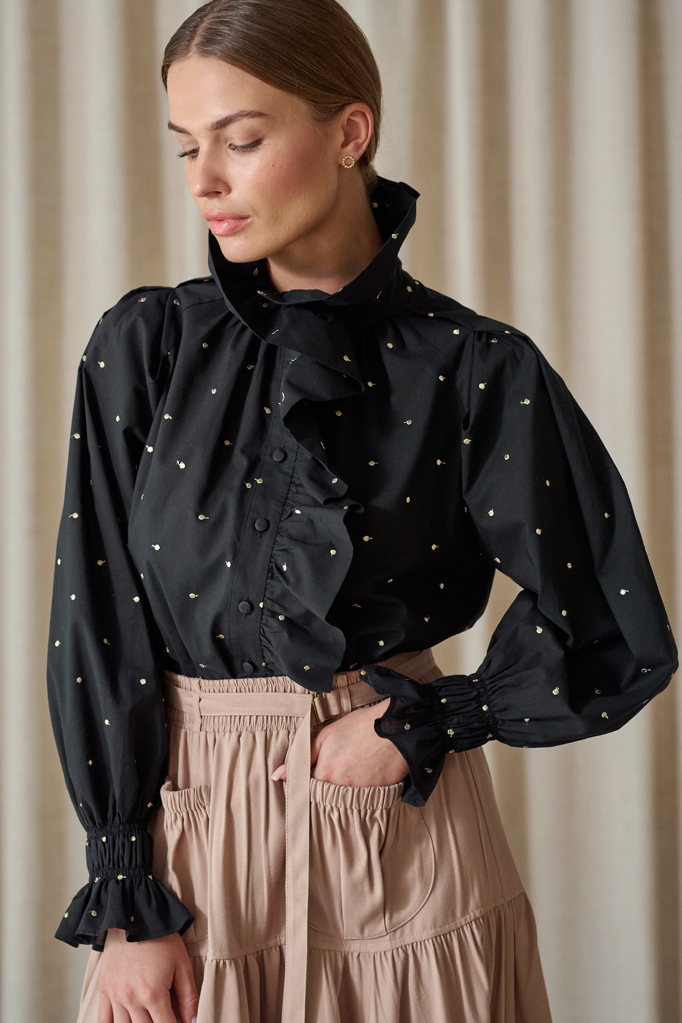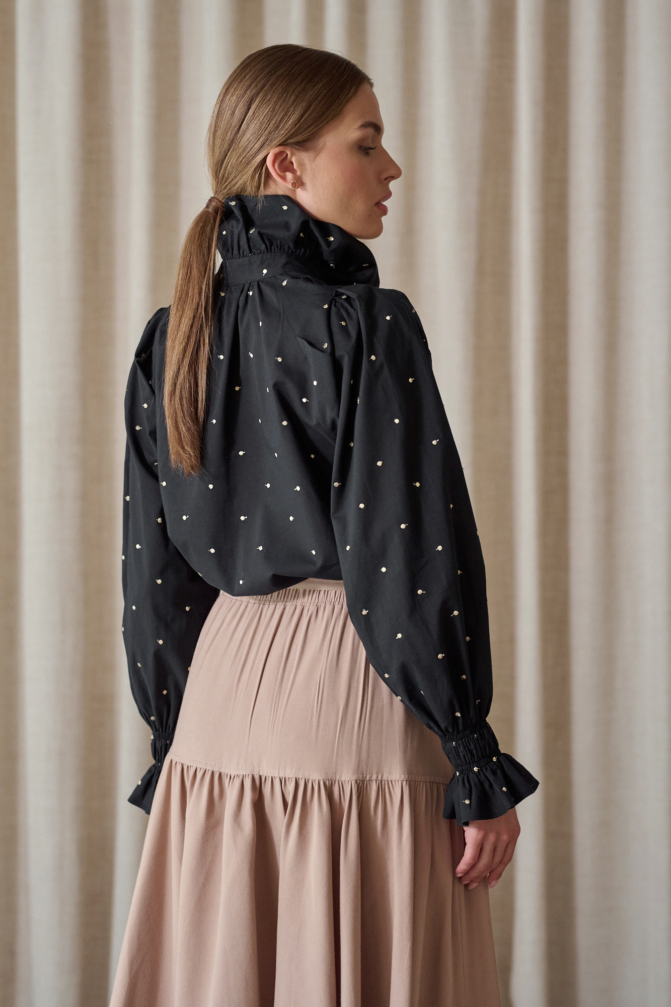 Koszula z popeliny, z haftowanymi drobnymi, złotymi kropkami, szerokie rękawy, zakończone mankietem z gumkami, stójkę wysoką falbanką przechodzącą w żabot, guziczki obciągane materiałem.