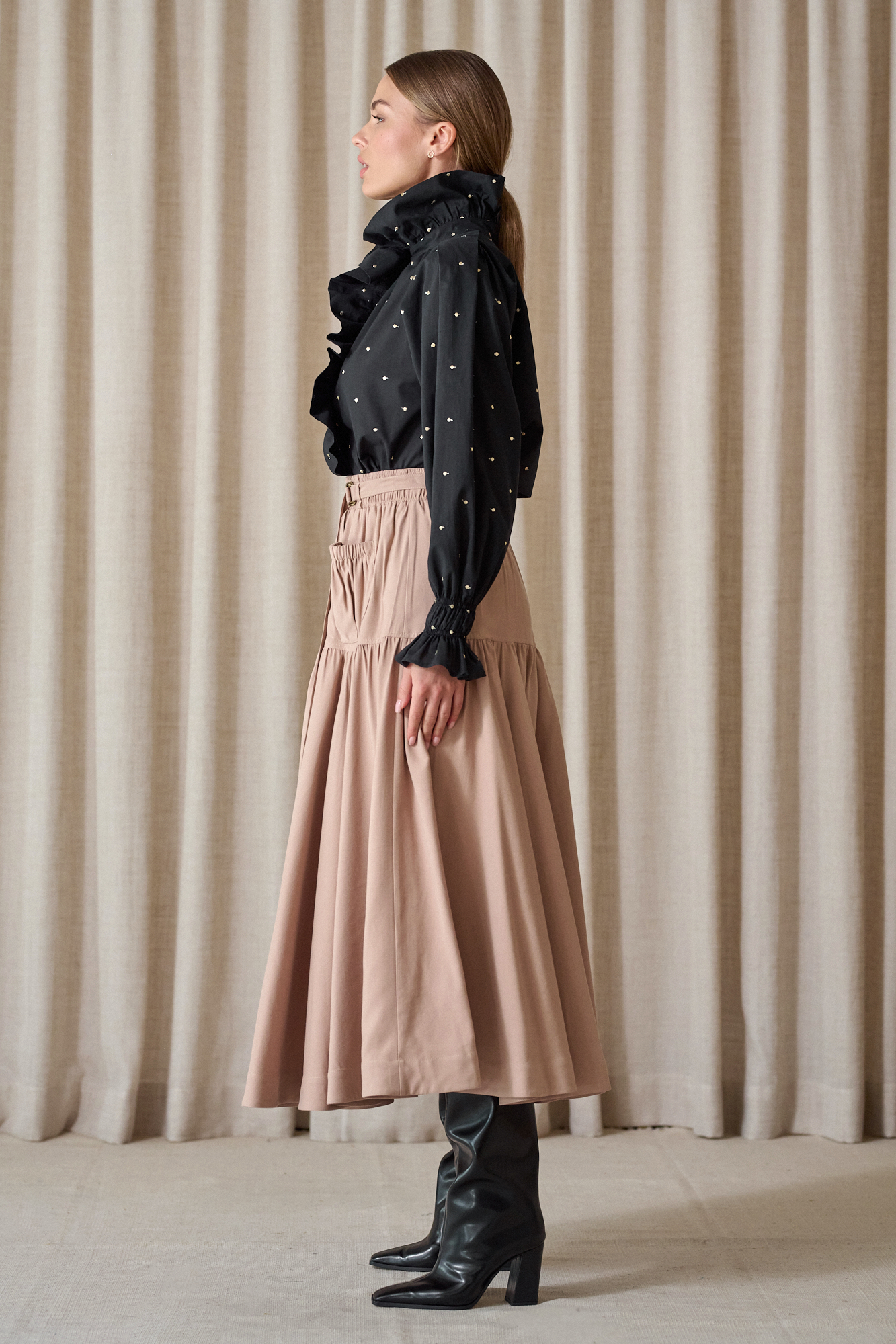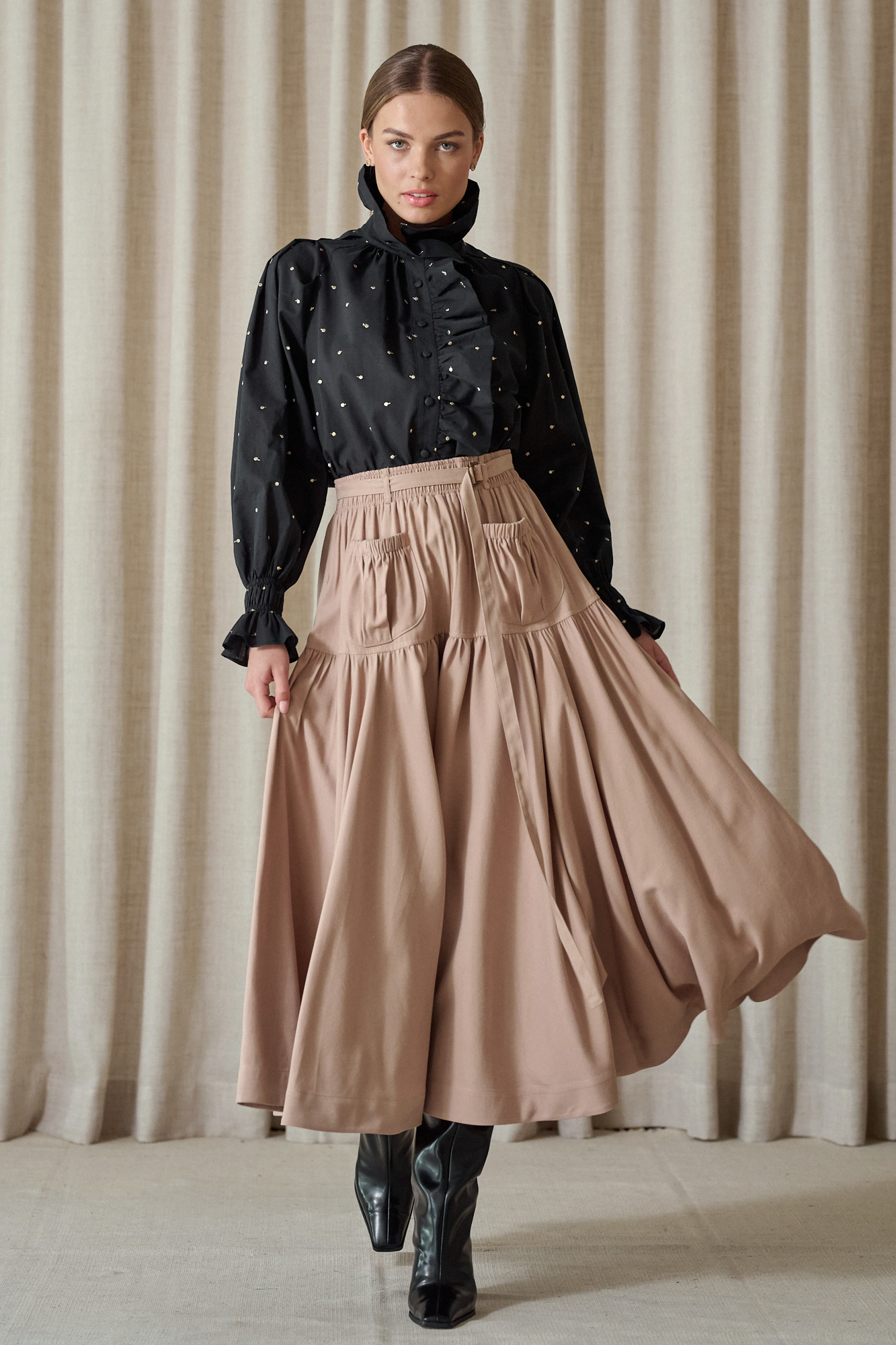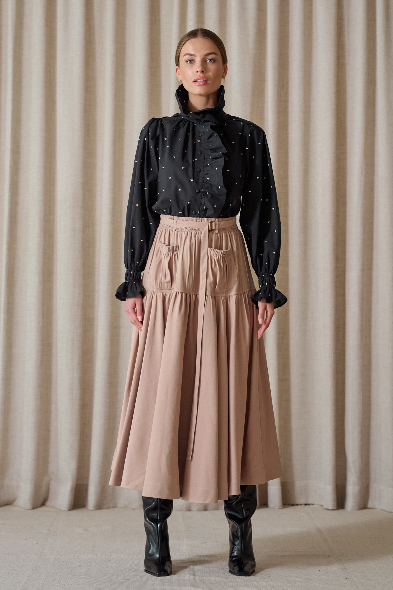 Koszula z popeliny, z haftowanymi drobnymi, złotymi kropkami, szerokie rękawy, zakończone mankietem z gumkami, stójkę wysoką falbanką przechodzącą w żabot, guziczki obciągane materiałem.