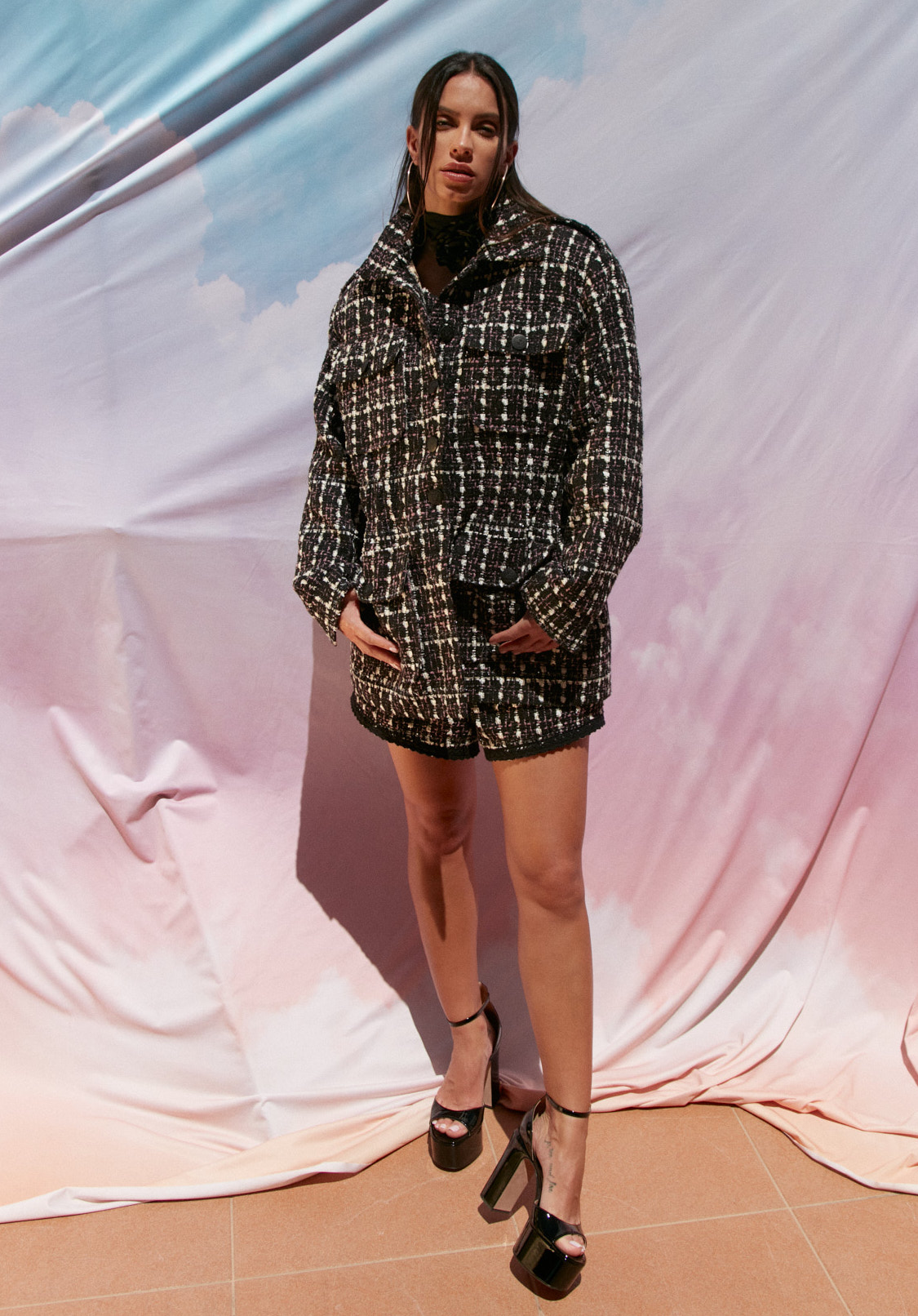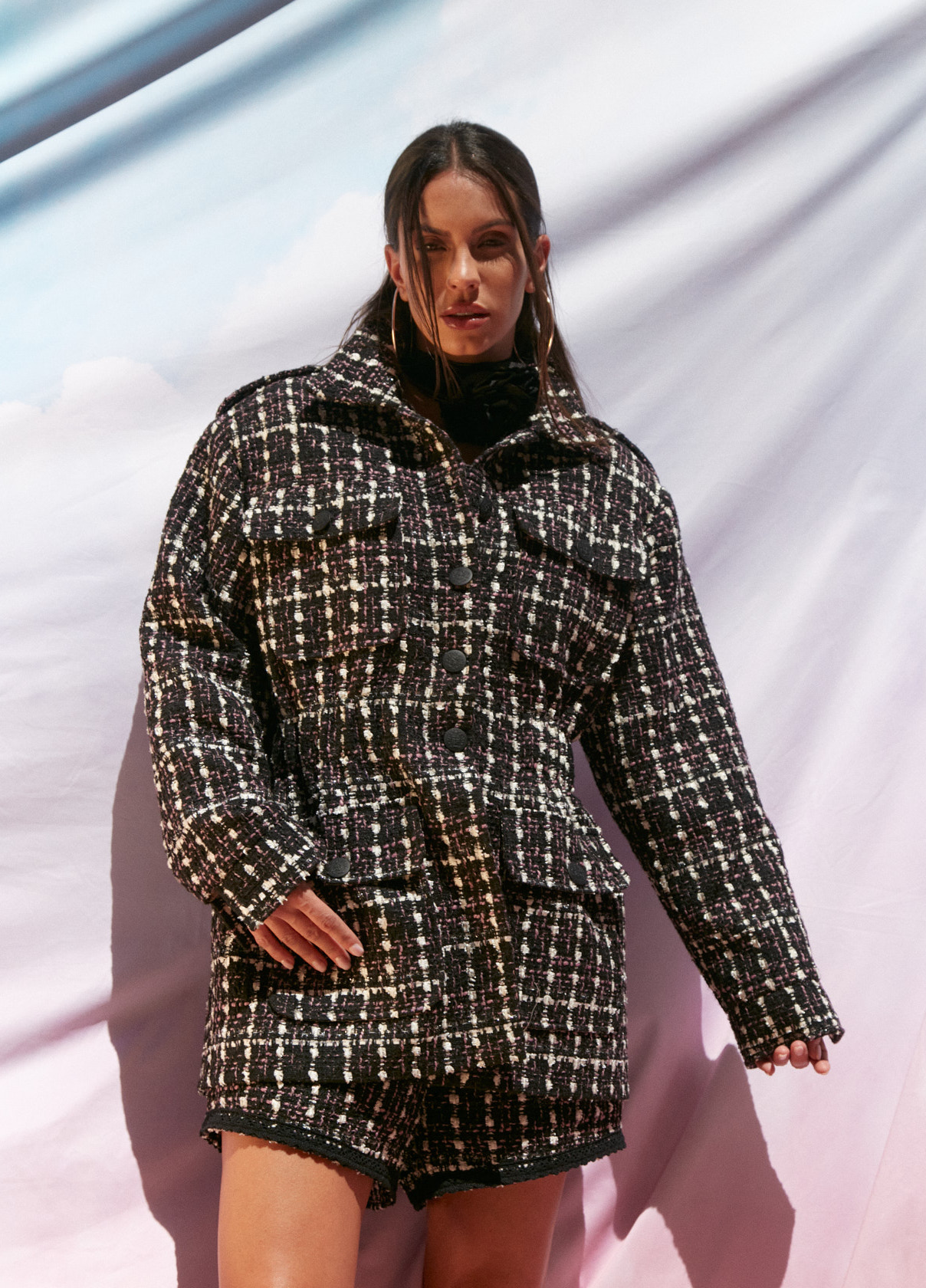 Kurtka typu oversize, pagony, kieszenie z patkami zapinane na guziki, mankiet z guzikiem, szeroka guma w pasie.