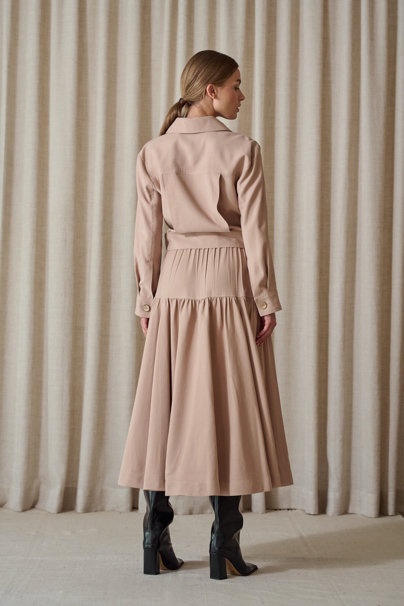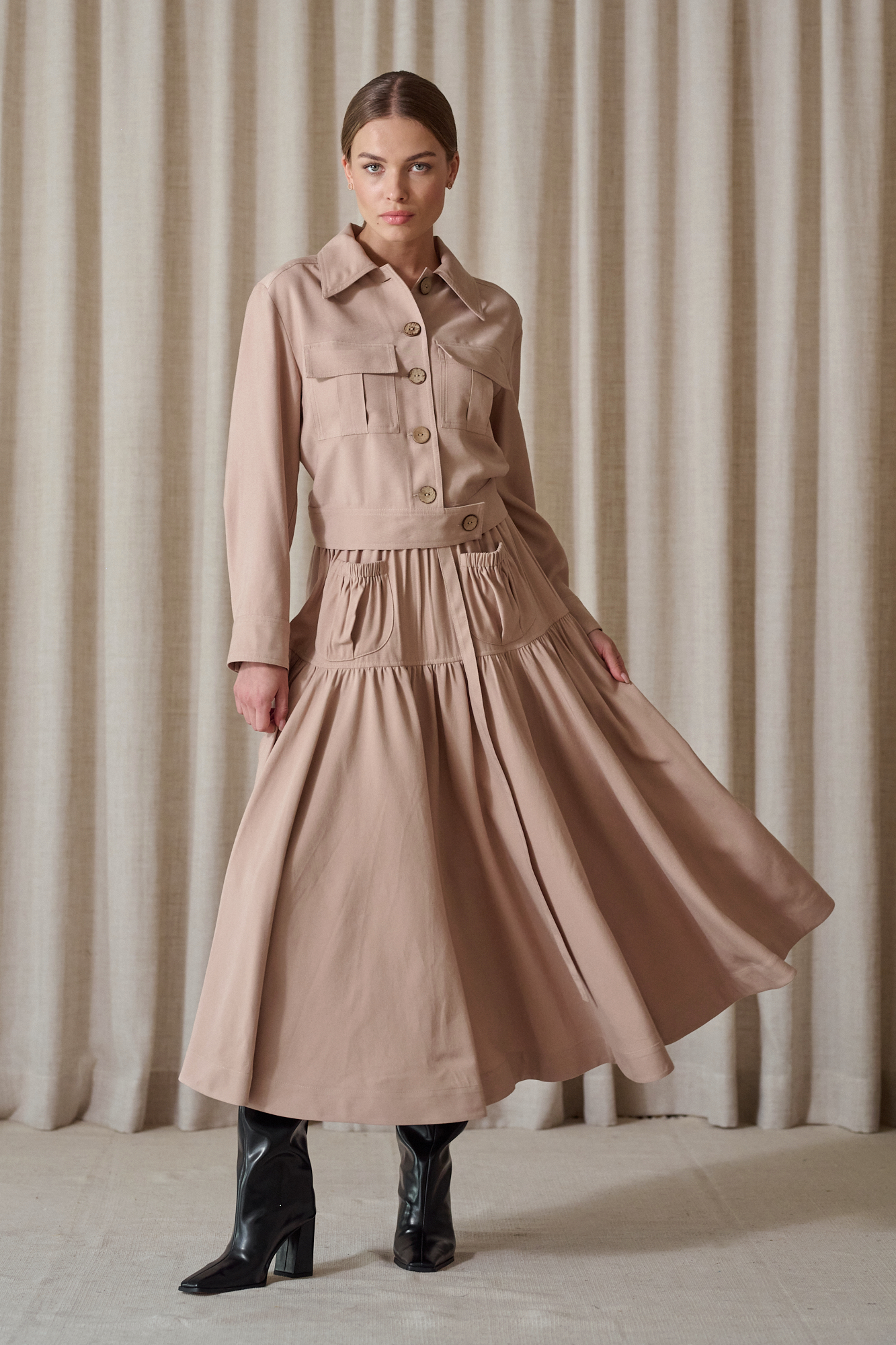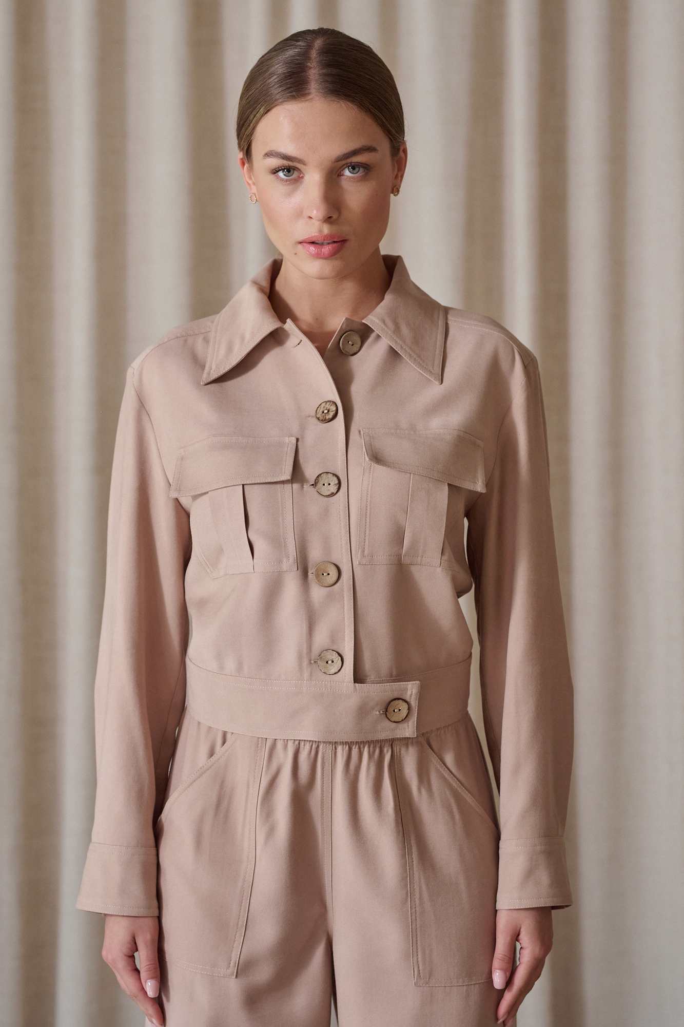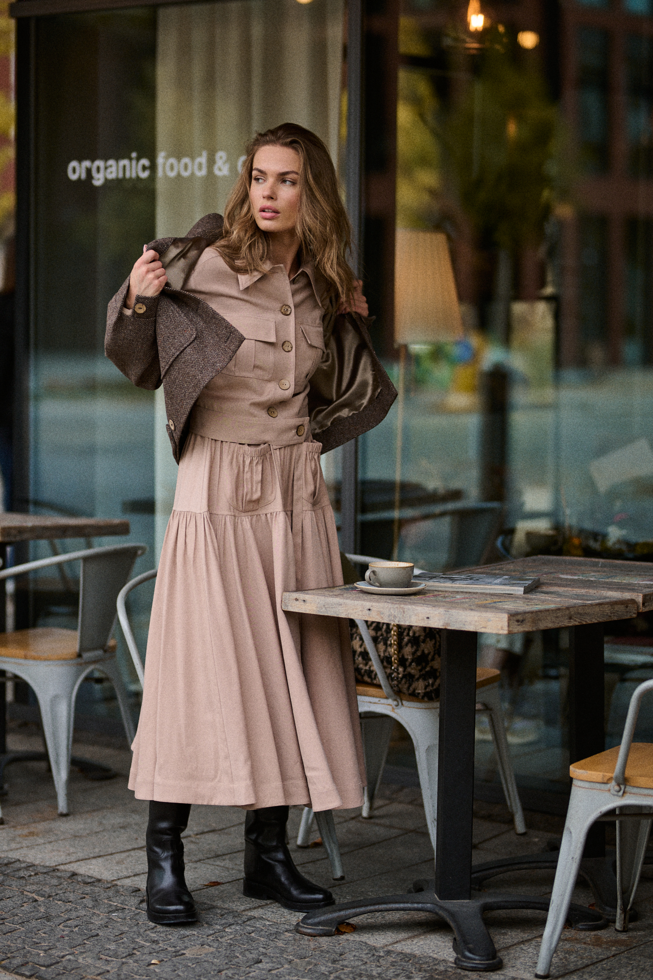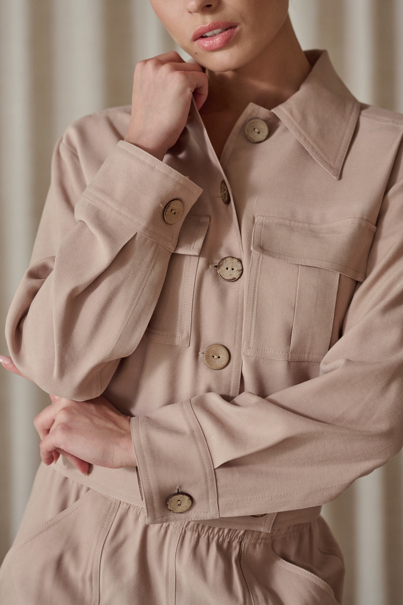 Kurtka koszulowa Naomi Nude to nie tylko ubranie, to Twój nowy sojusznik w codziennym budowaniu wyjątkowego stylu. Jej militarny sznyt przemawia do kobiet, które cenią sobie połączenie elegancji z nutą surowości i niezależności.