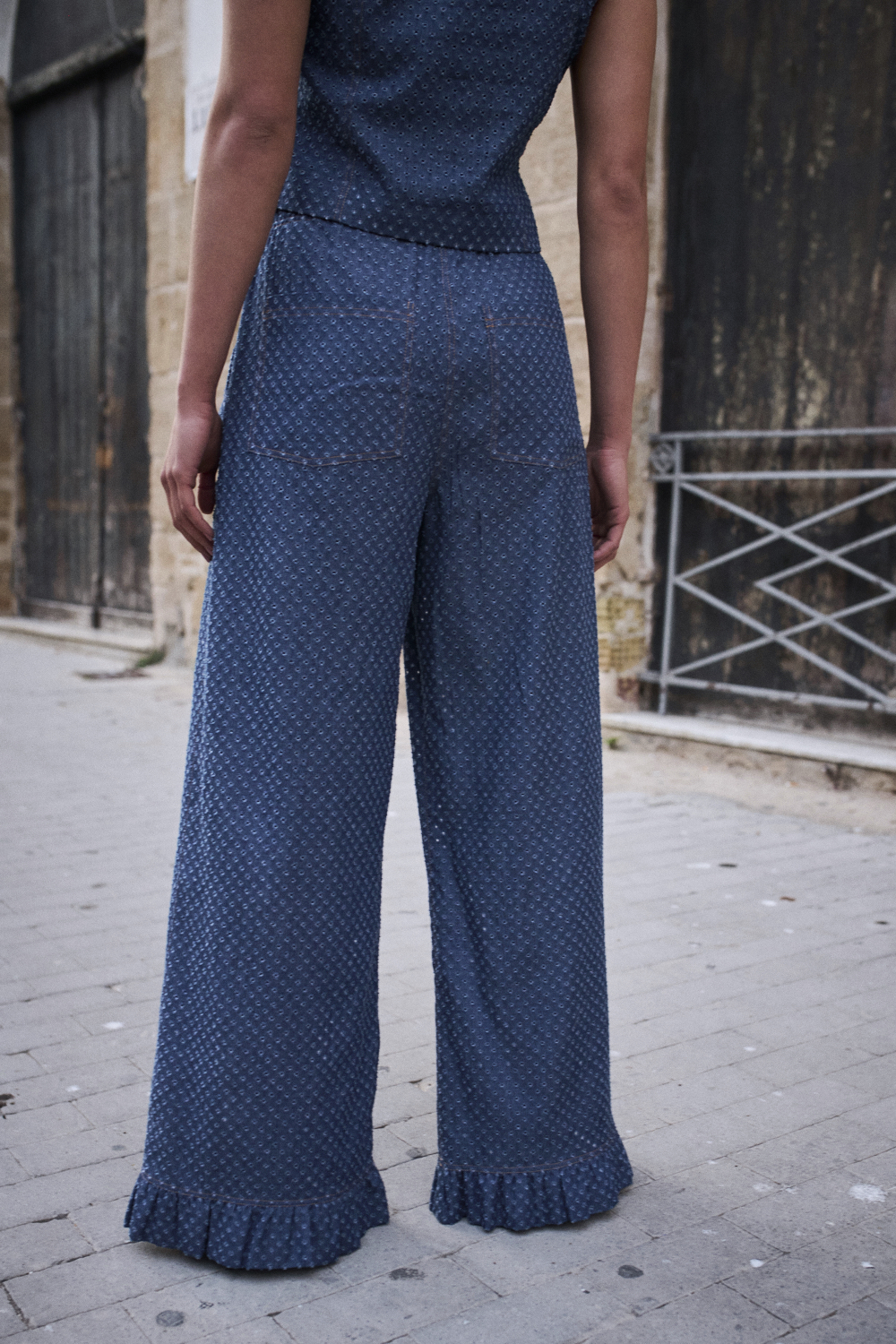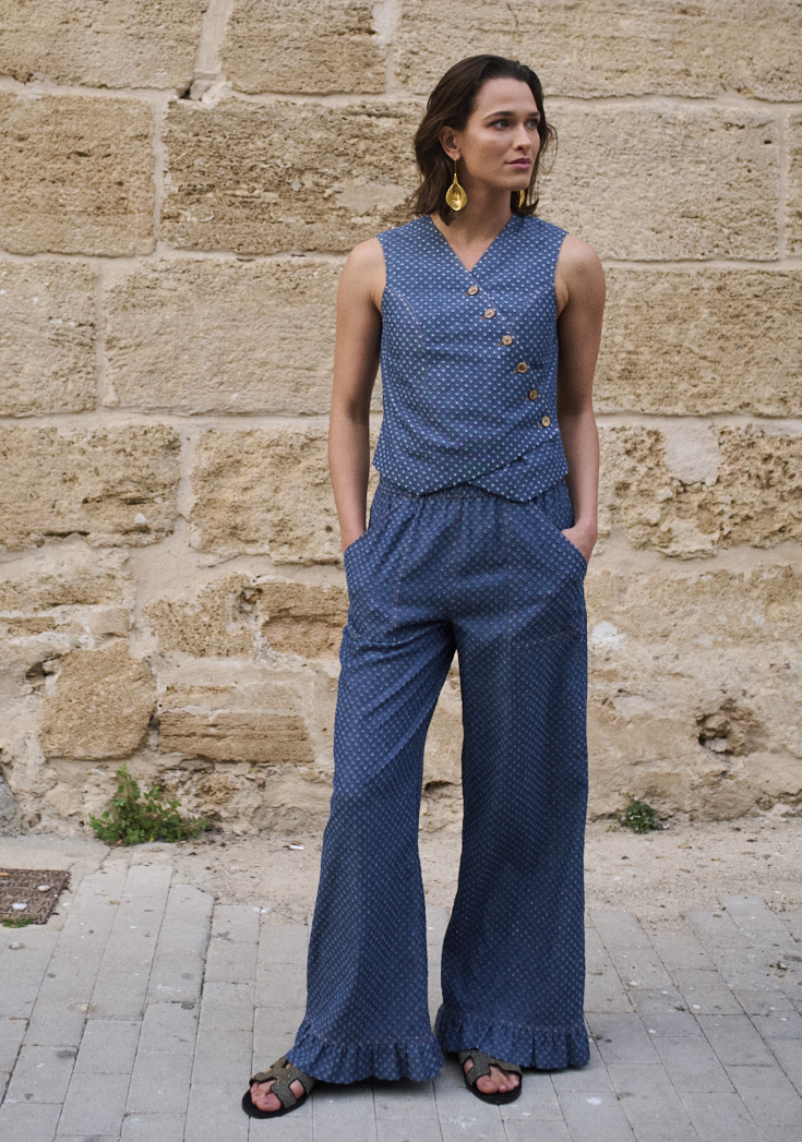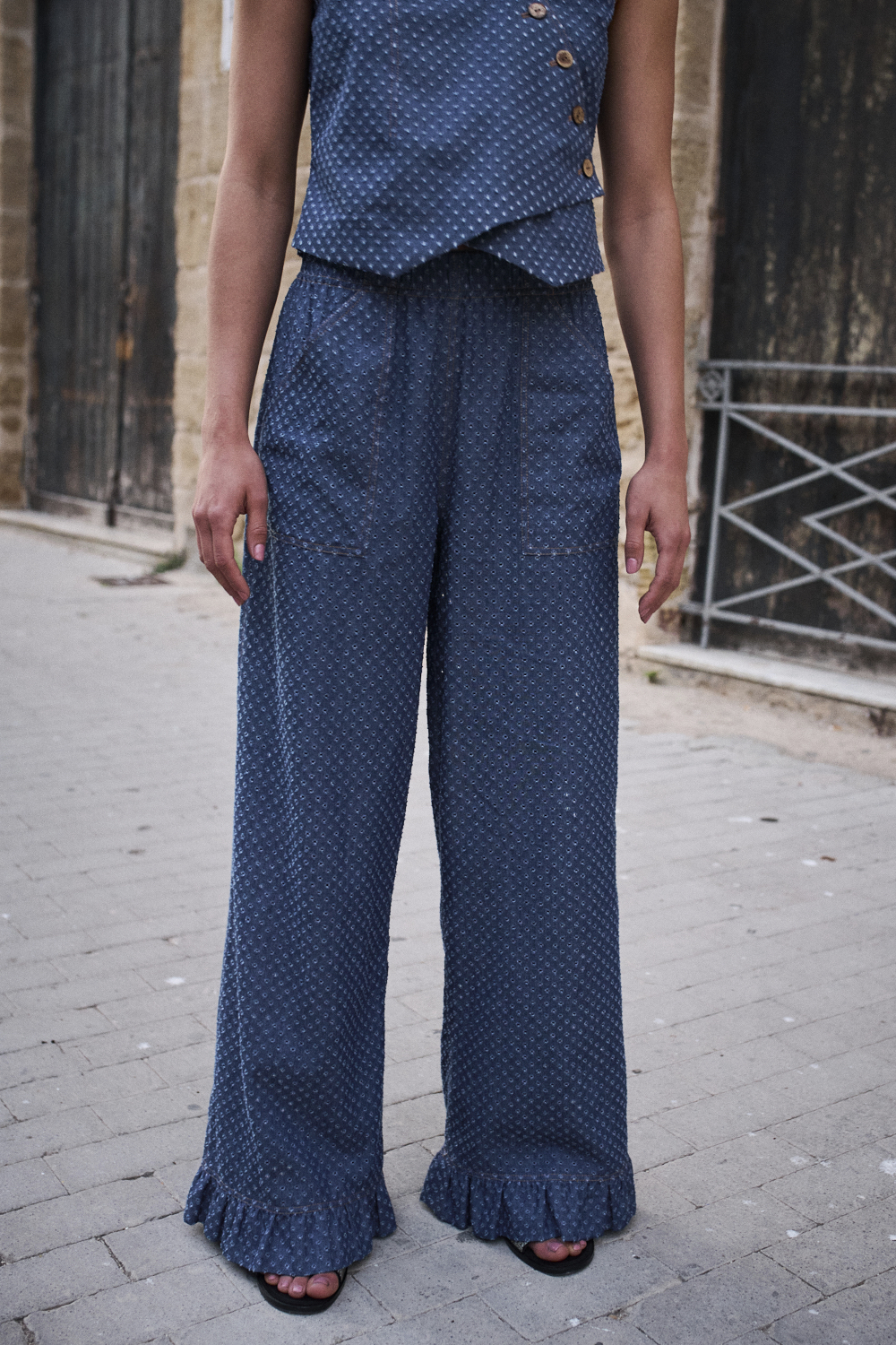 Spodnie mają w talii szeroką gumę, naszywane kieszenie, dół wykończony falbanką.
