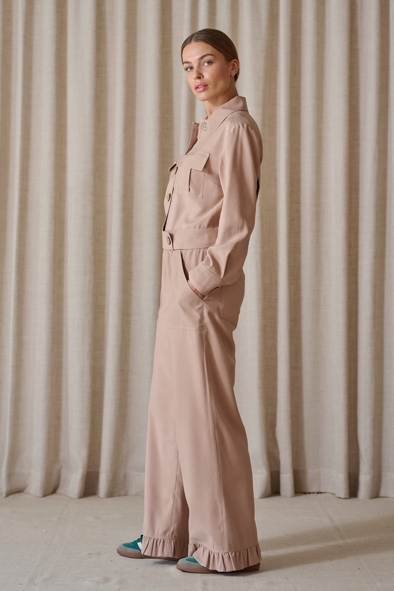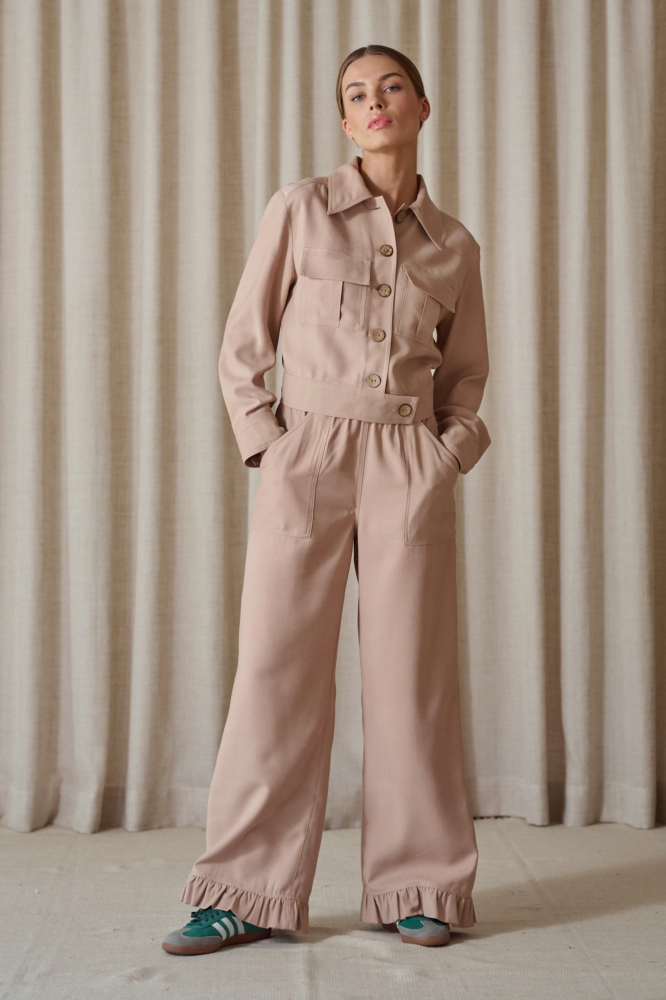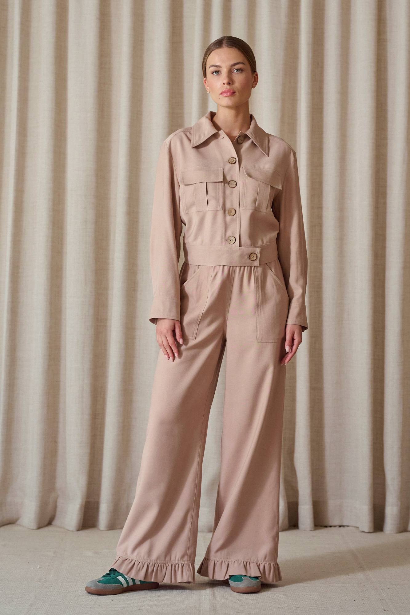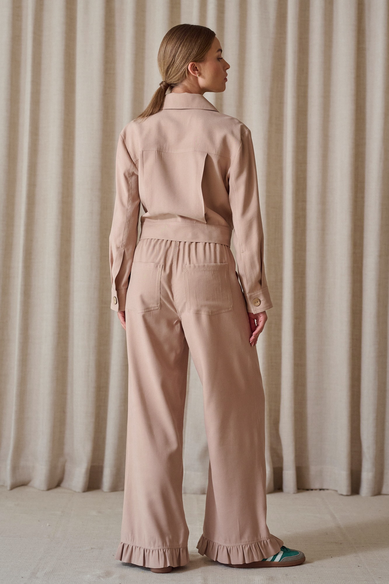 Spodnie Gabrielle Nude to kwintesencja elegancji z nutą oryginalności. W tej wyjątkowej kreacji będziesz czuć się nie tylko modnie, ale i komfortowo. Delikatny, pastelowy odcień nada Twojej skórze subtelnego blasku, a unikatowy detal w postaci falbanki przy mankiecie przyciągnie spojrzenia, podkreślając Twoje poczucie stylu.