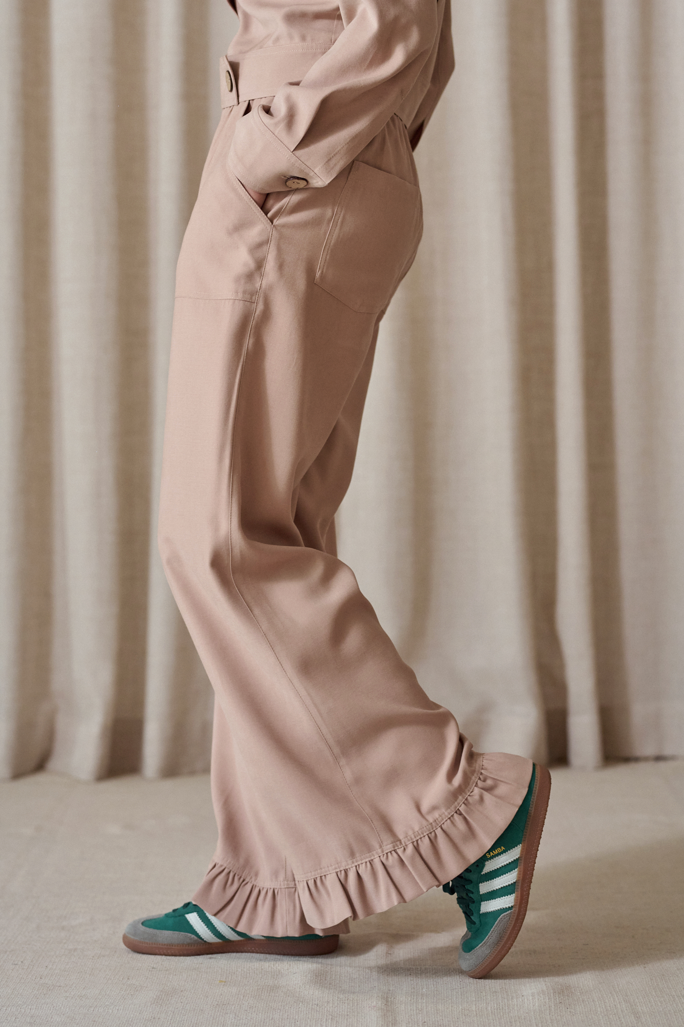 Spodnie mają w talii szeroką gumę, naszywane kieszenie, dół wykończony falbanką.