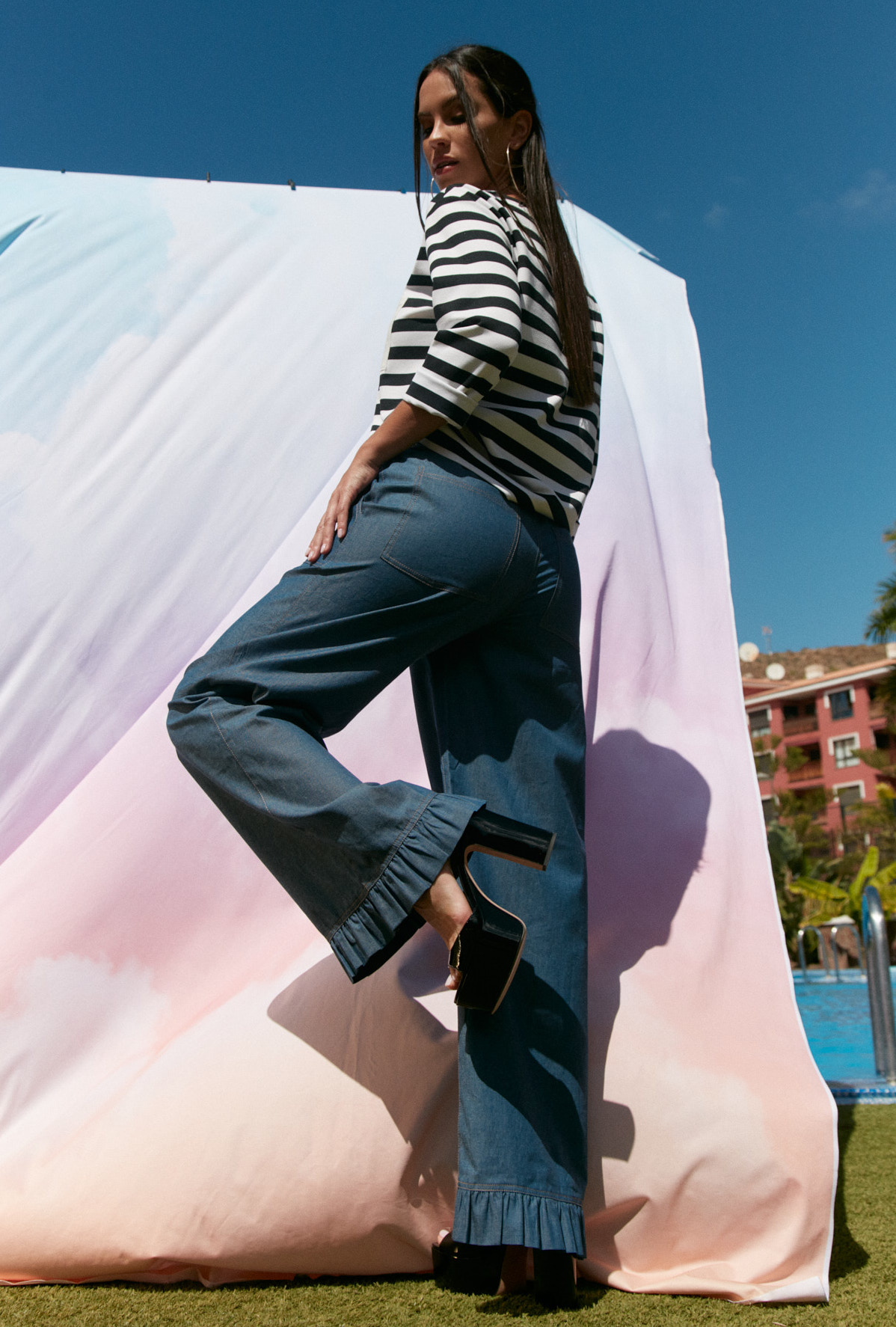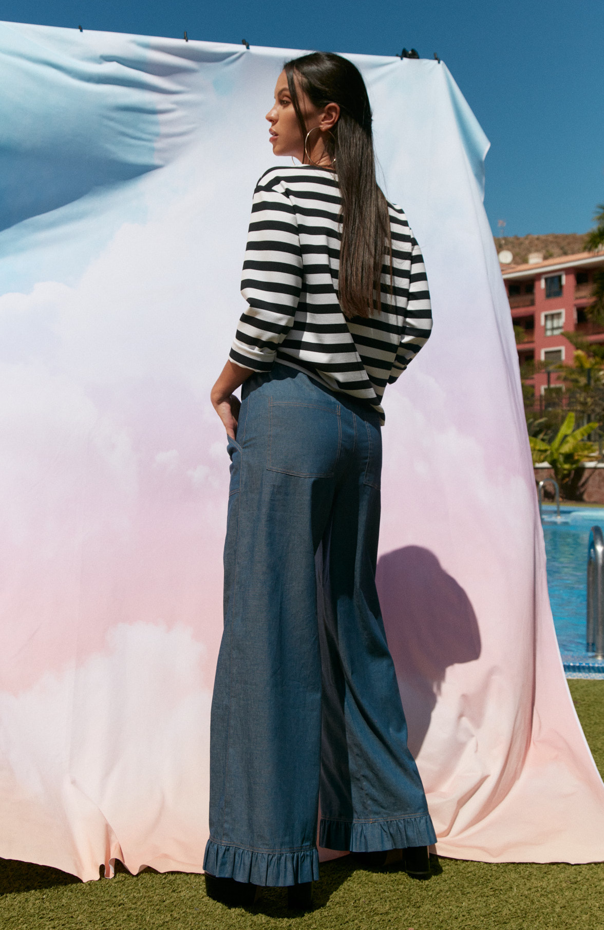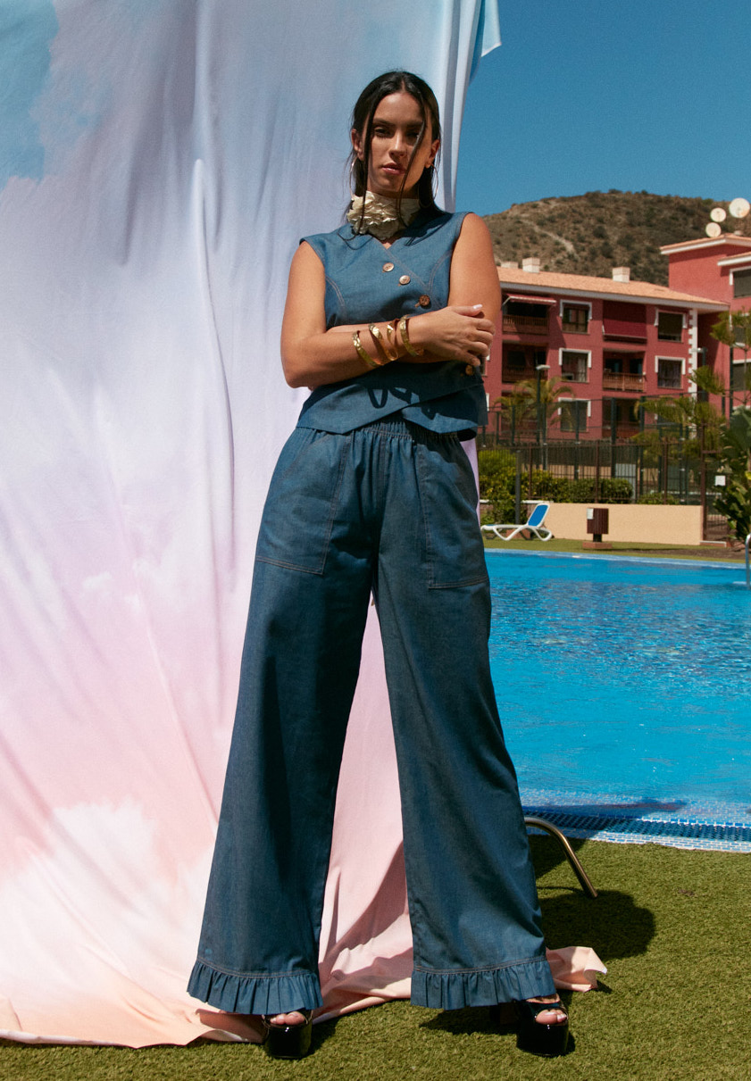Spodnie mają w talii szeroką gumę, naszywane kieszenie, dół wykończony falbanką.