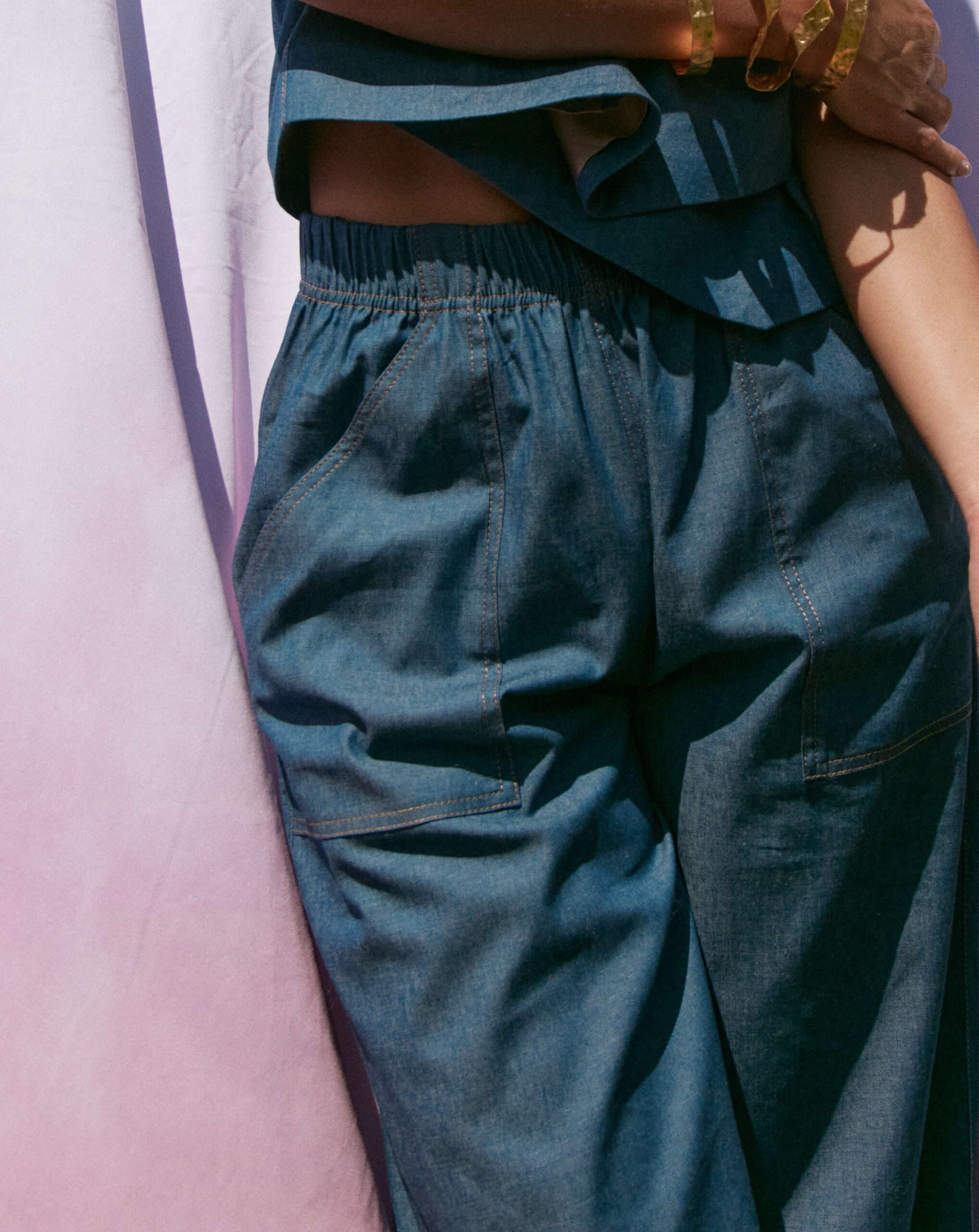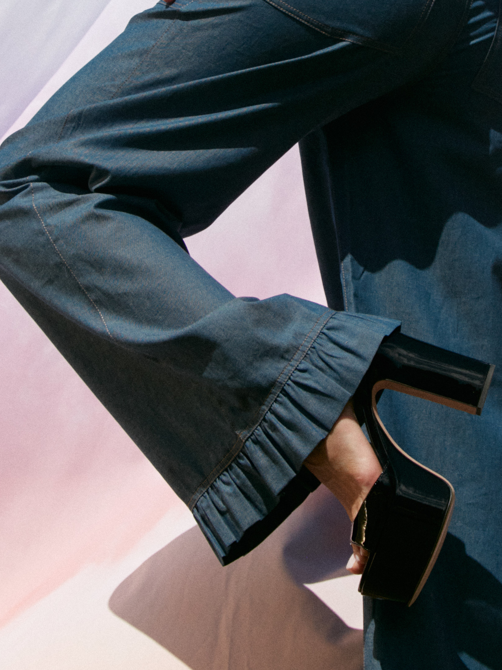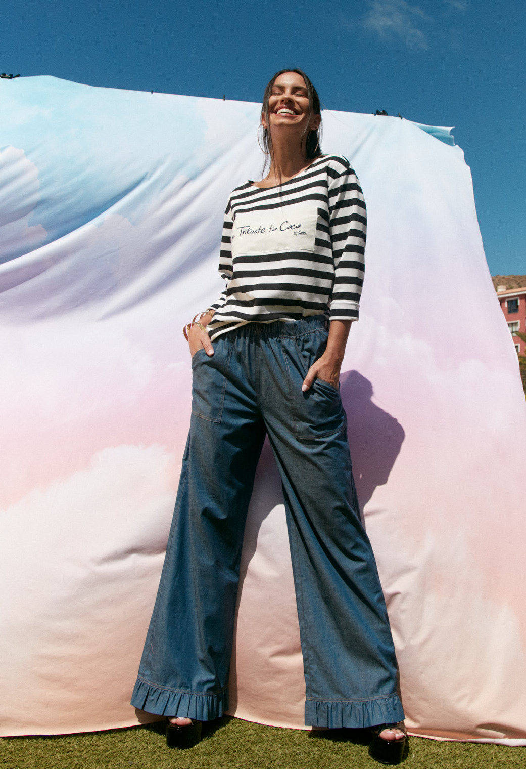 Spodnie mają w talii szeroką gumę, naszywane kieszenie, dół wykończony falbanką.