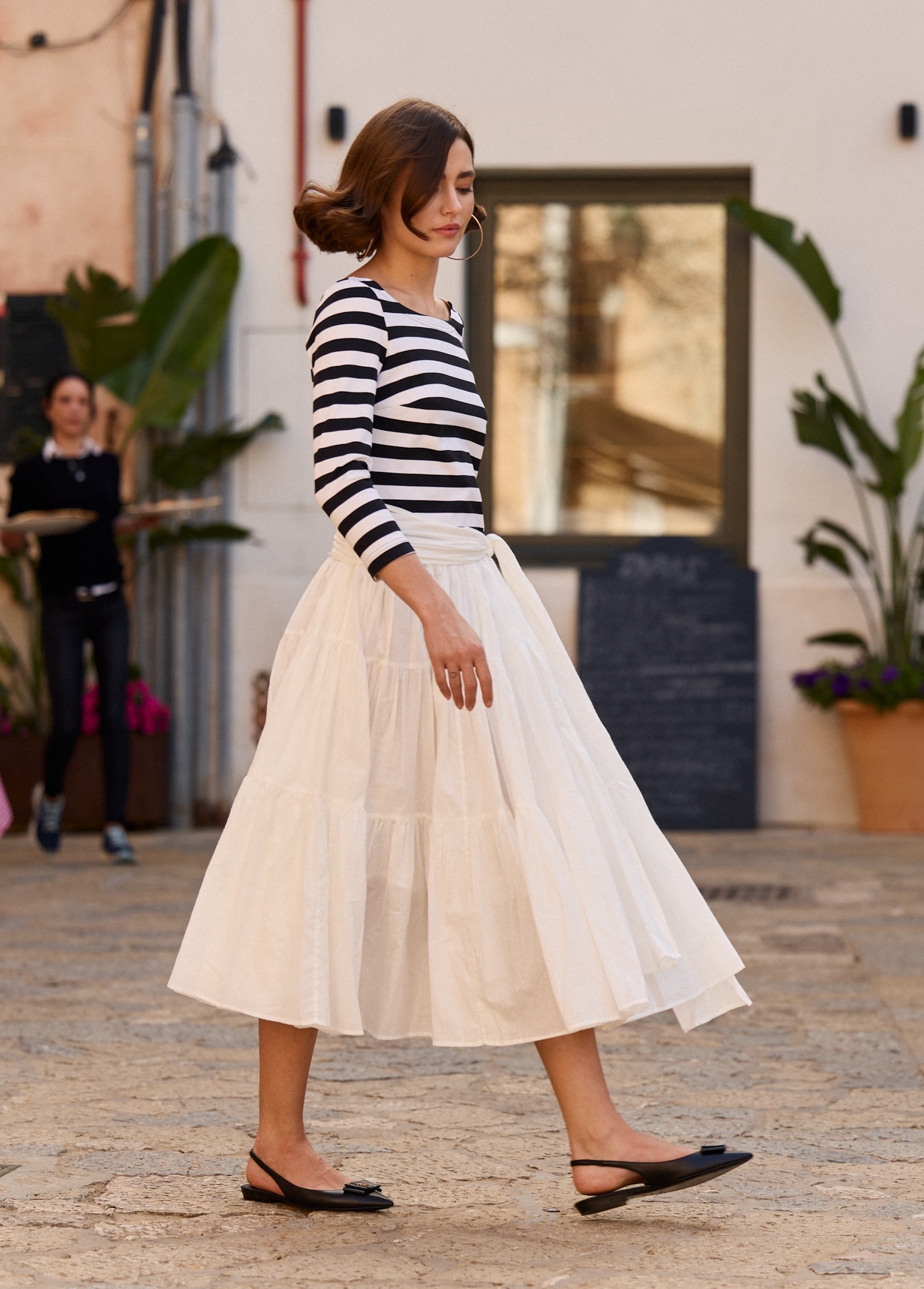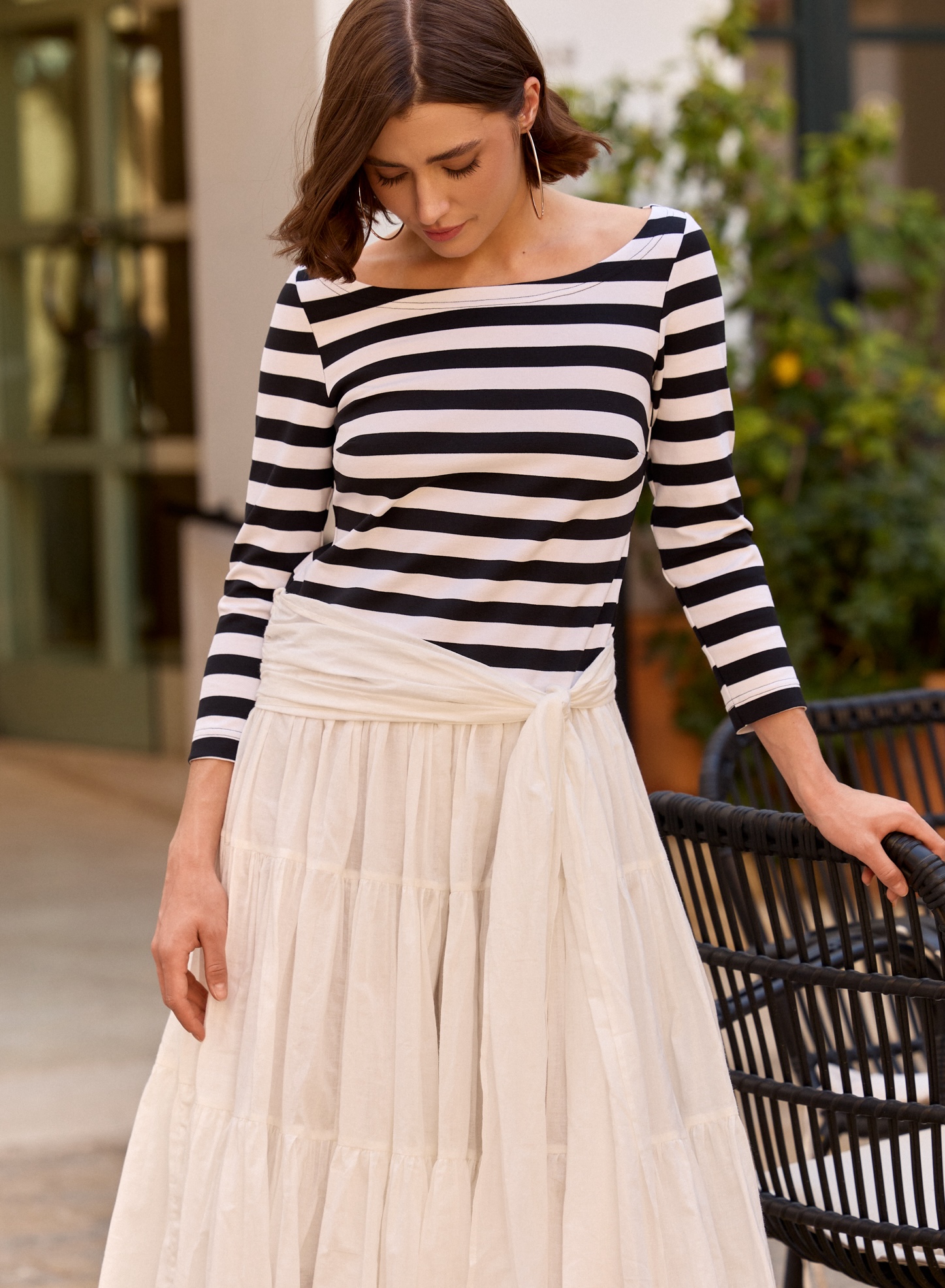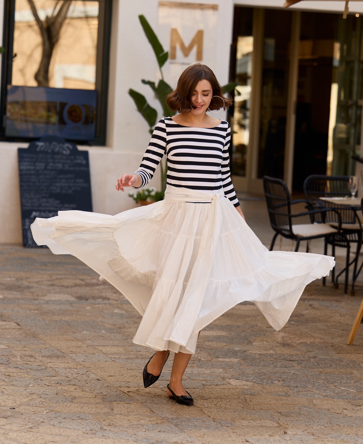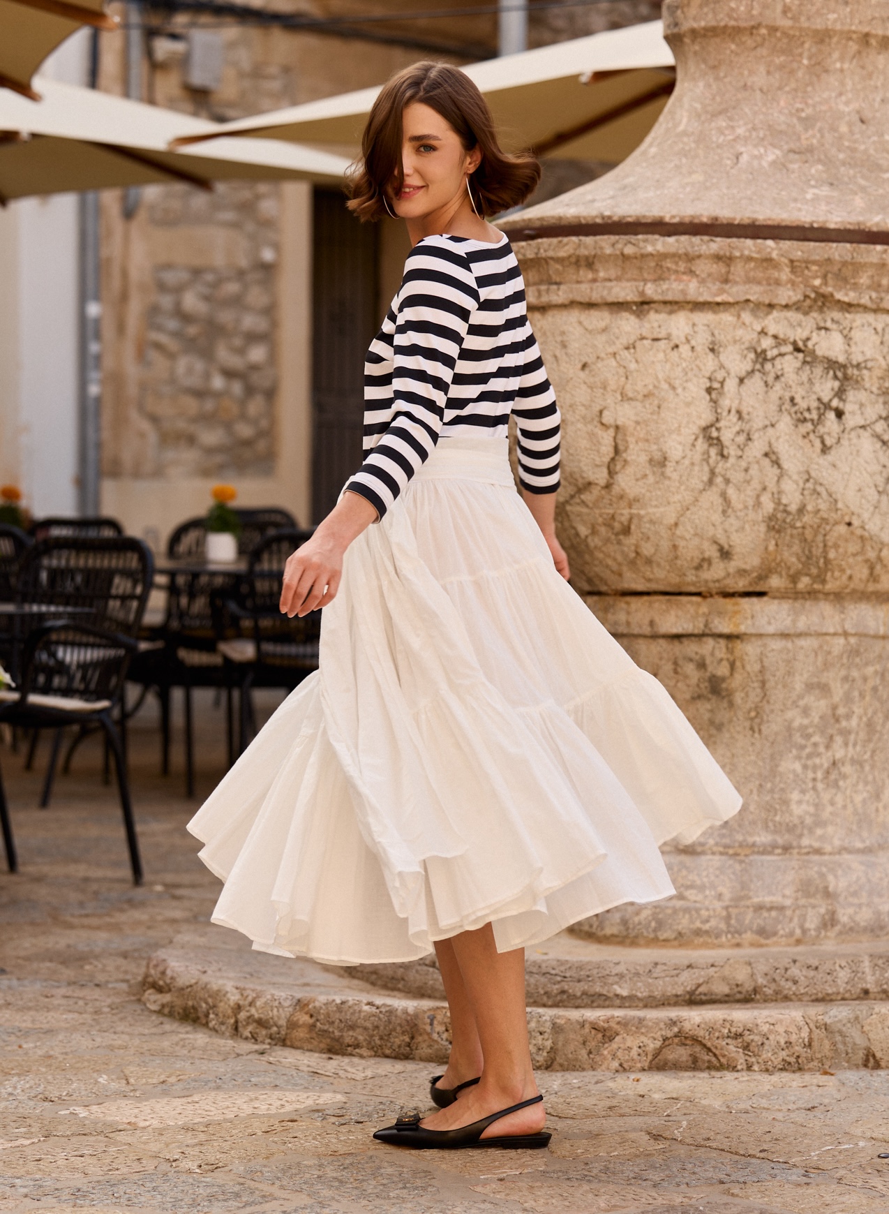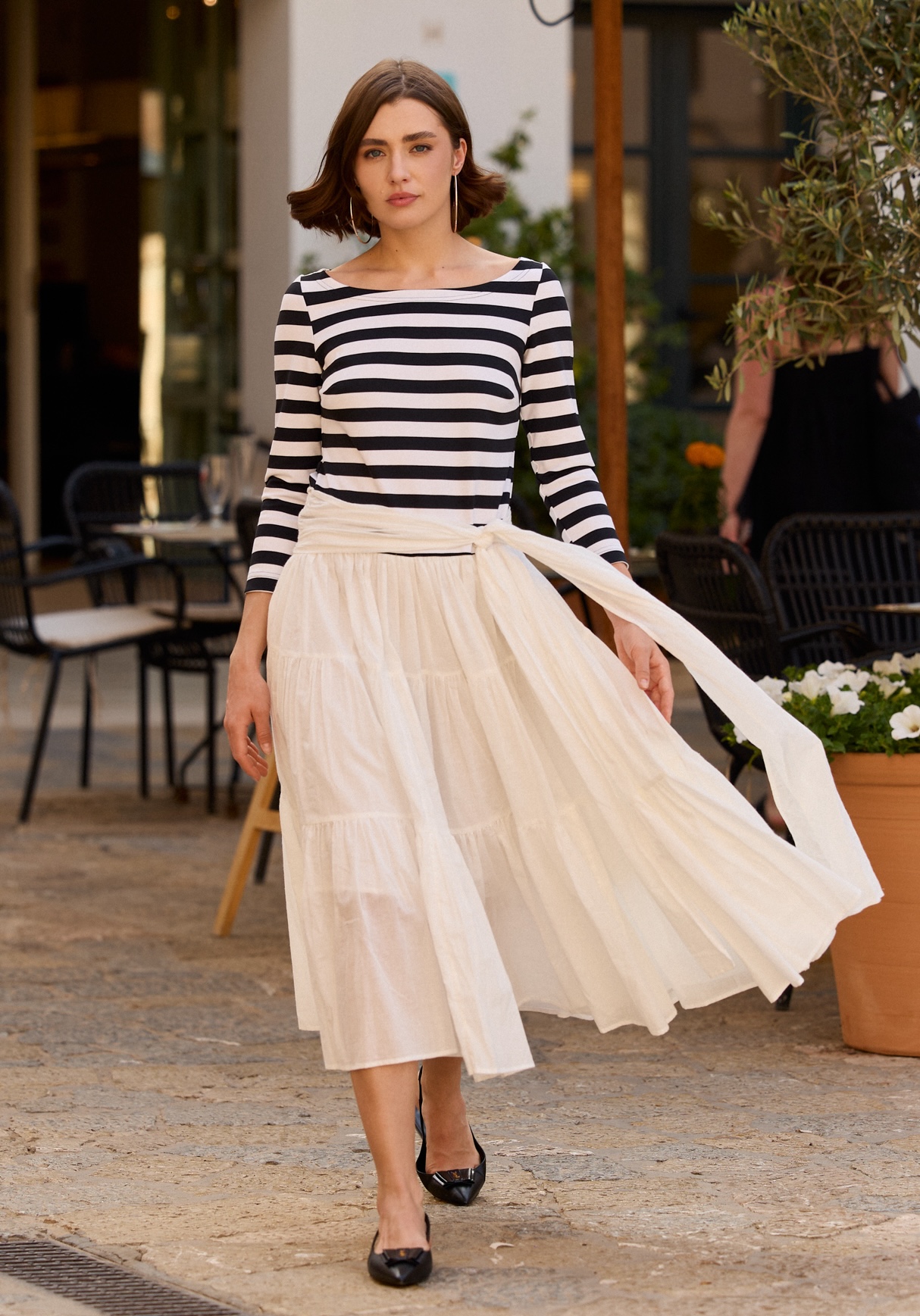 Sukienka w stylu marynarskim, zainspirowana francuską Bretonką. To prawdziwy must-have w szafie każdej kobiety ceniącej ponadczasowy styl. Jej kolorystyka nawiązuje do klasycznych marynarskich barw, uzupełniona o charakterystyczne paski, a falbany dodają sukience lekkości i romantyzmu, tworząc delikatny, dziewczęcy wygląd. Szeroki dół uszyto z lekkiego, przewiewnego materiału, idealnego na letnie dni.