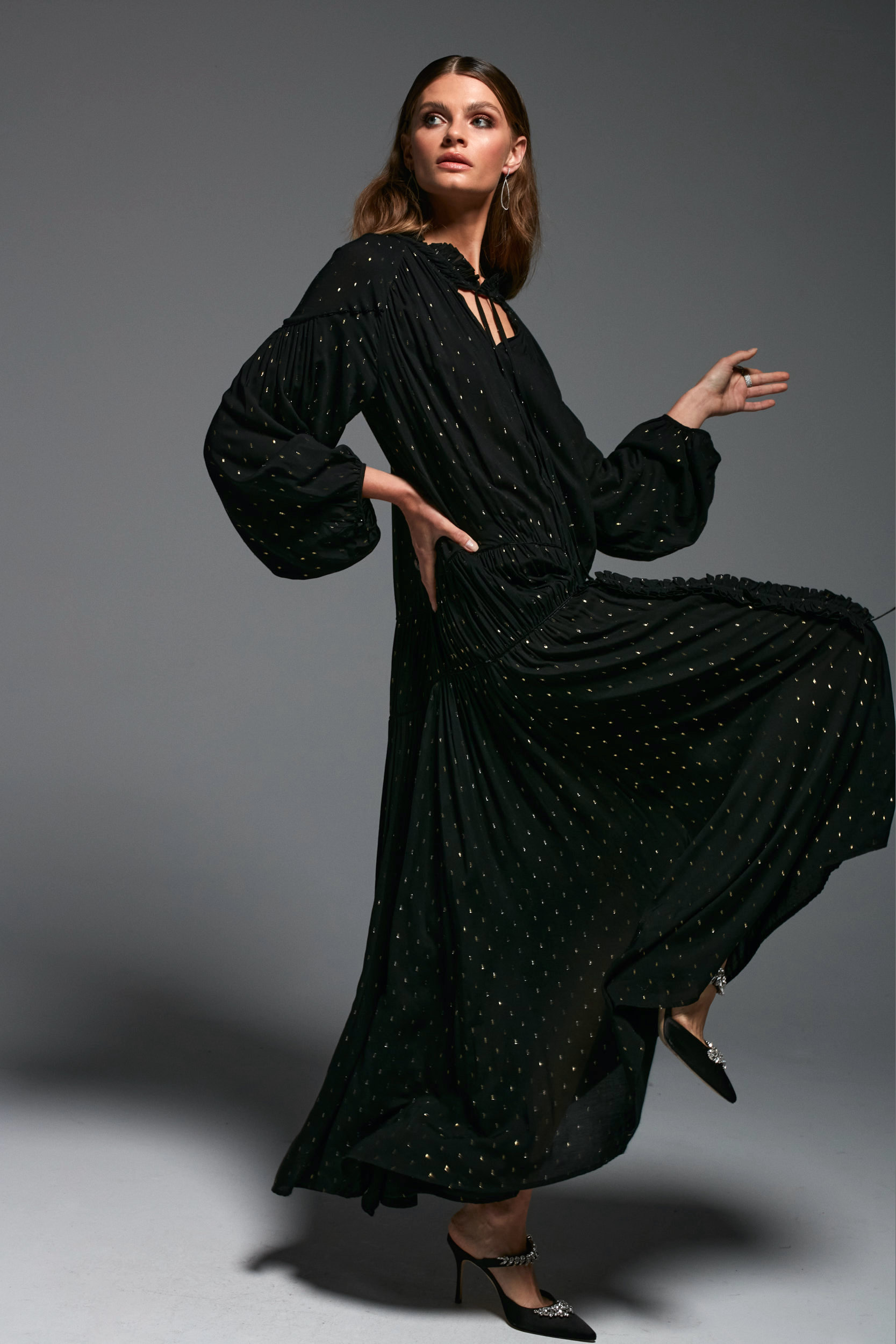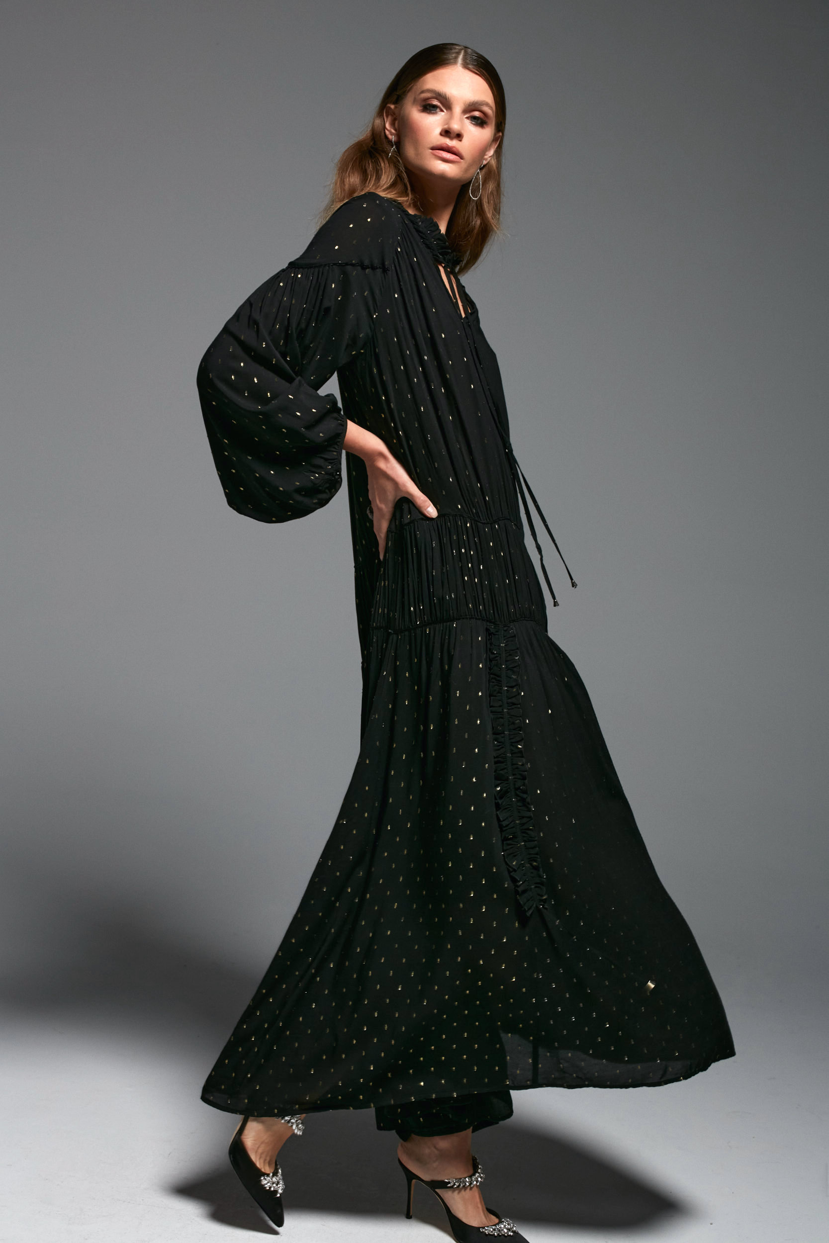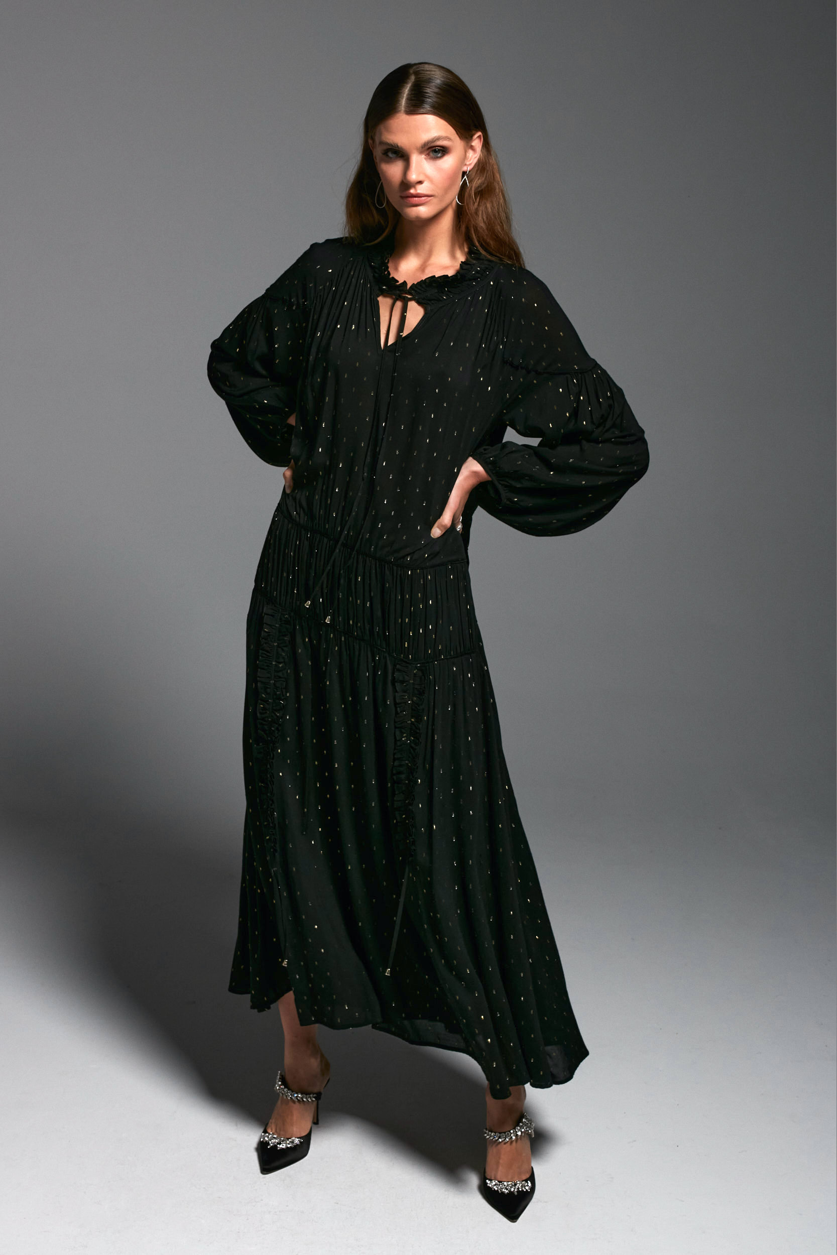 Obniżona talia, podkreślona aksamitką, złote, drobnych cętki na materiale, naszyte falbanki na spódnicy zakończone są dłuższymi troczkami ze złotymi, metalowymi koralikami