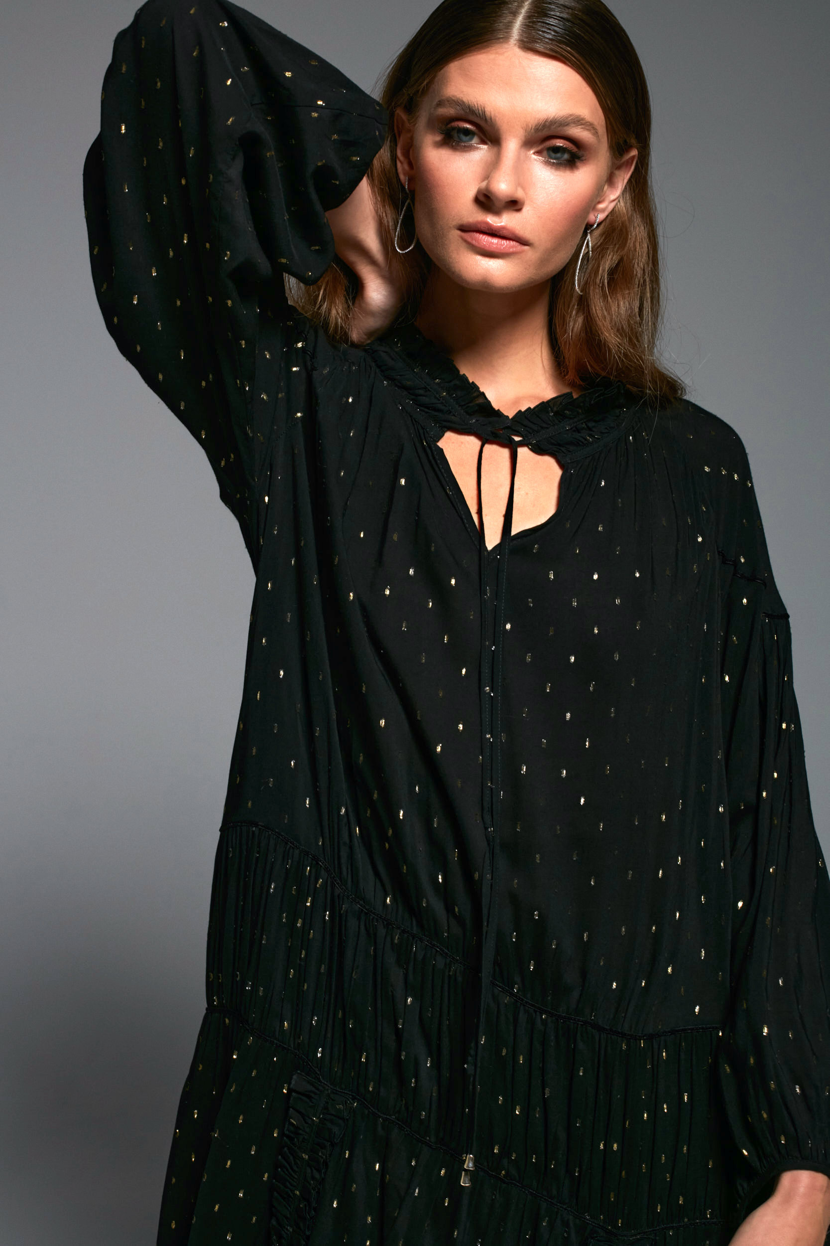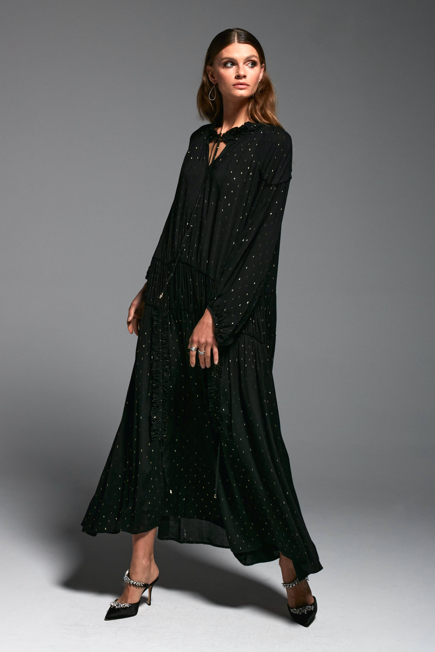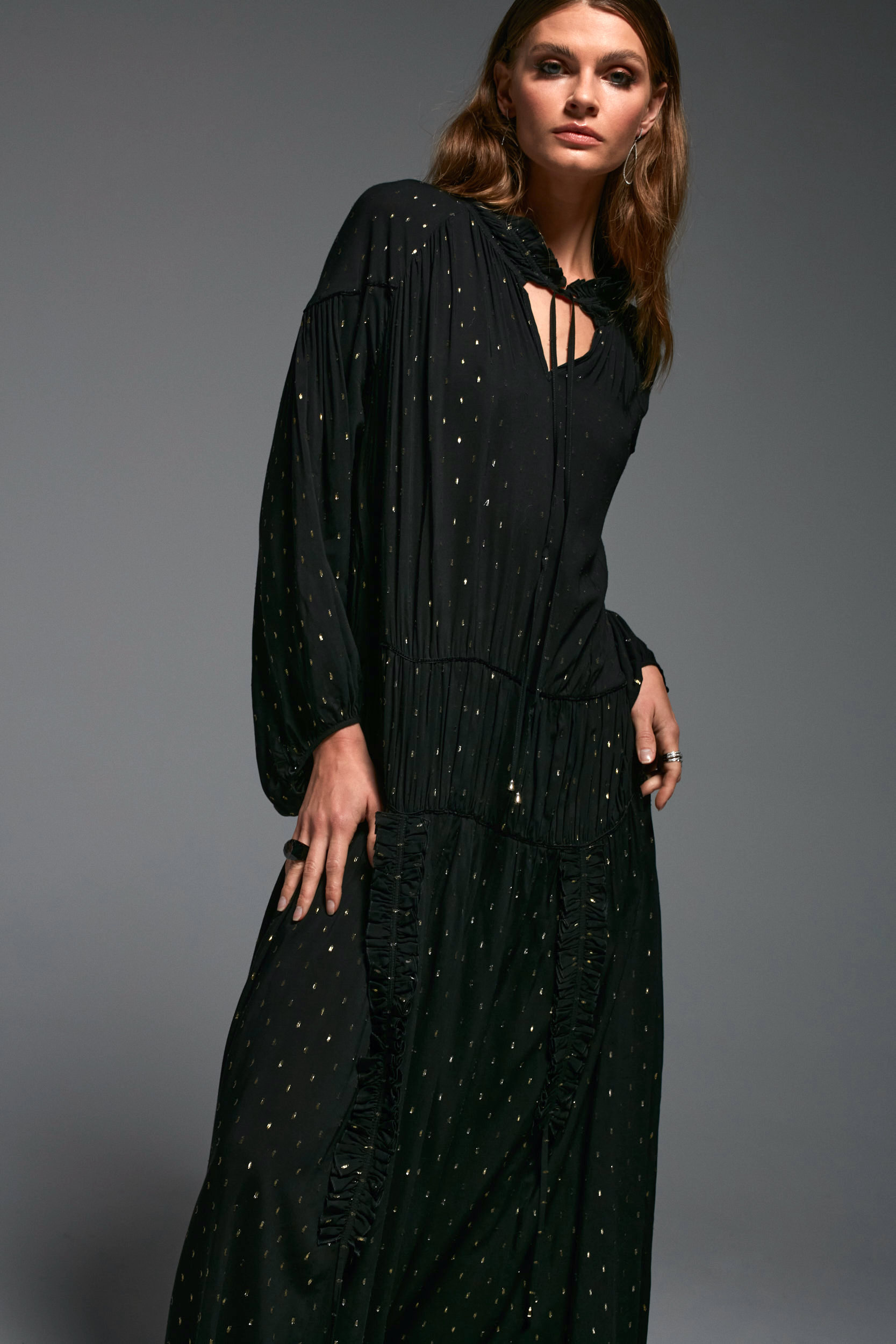 Sukienka, w stylu boho glamour, będzie idealnym strojem na eleganckie wyjścia. Jej charakter można zmienić, zakładając do niej mocne botki w stylu grunge.