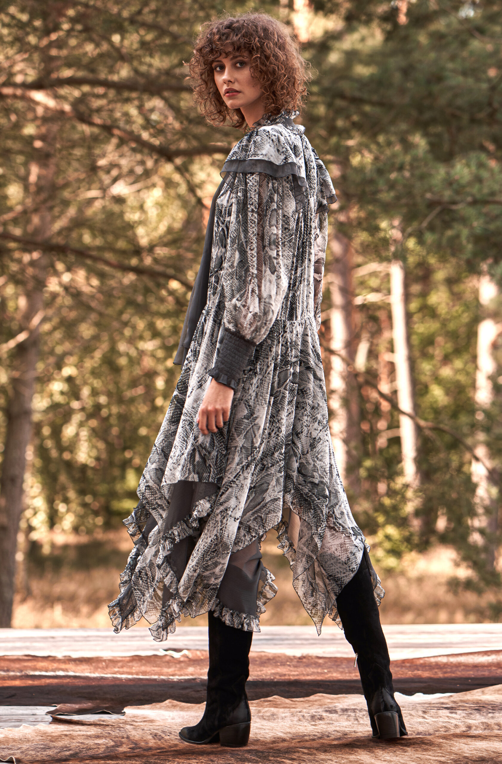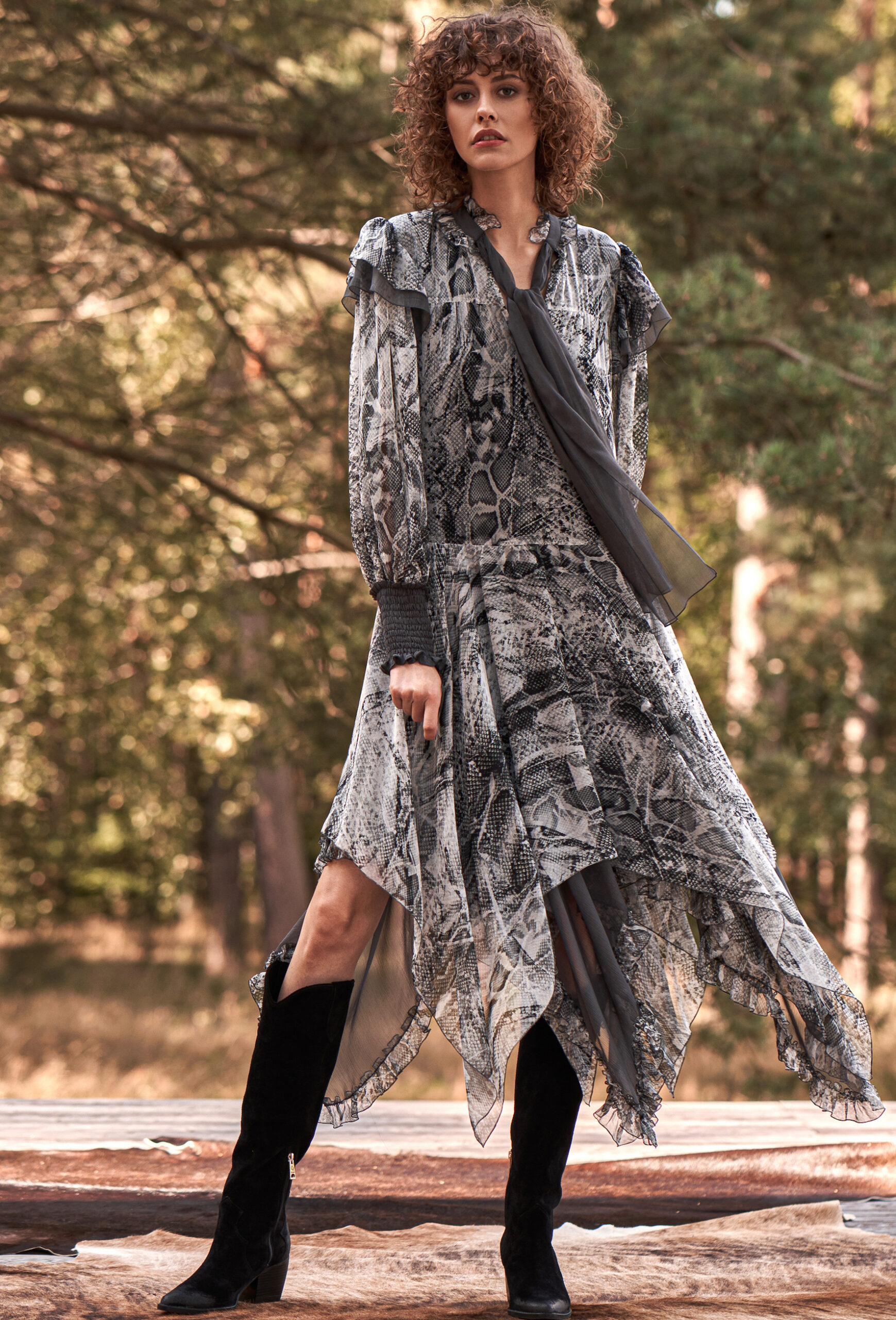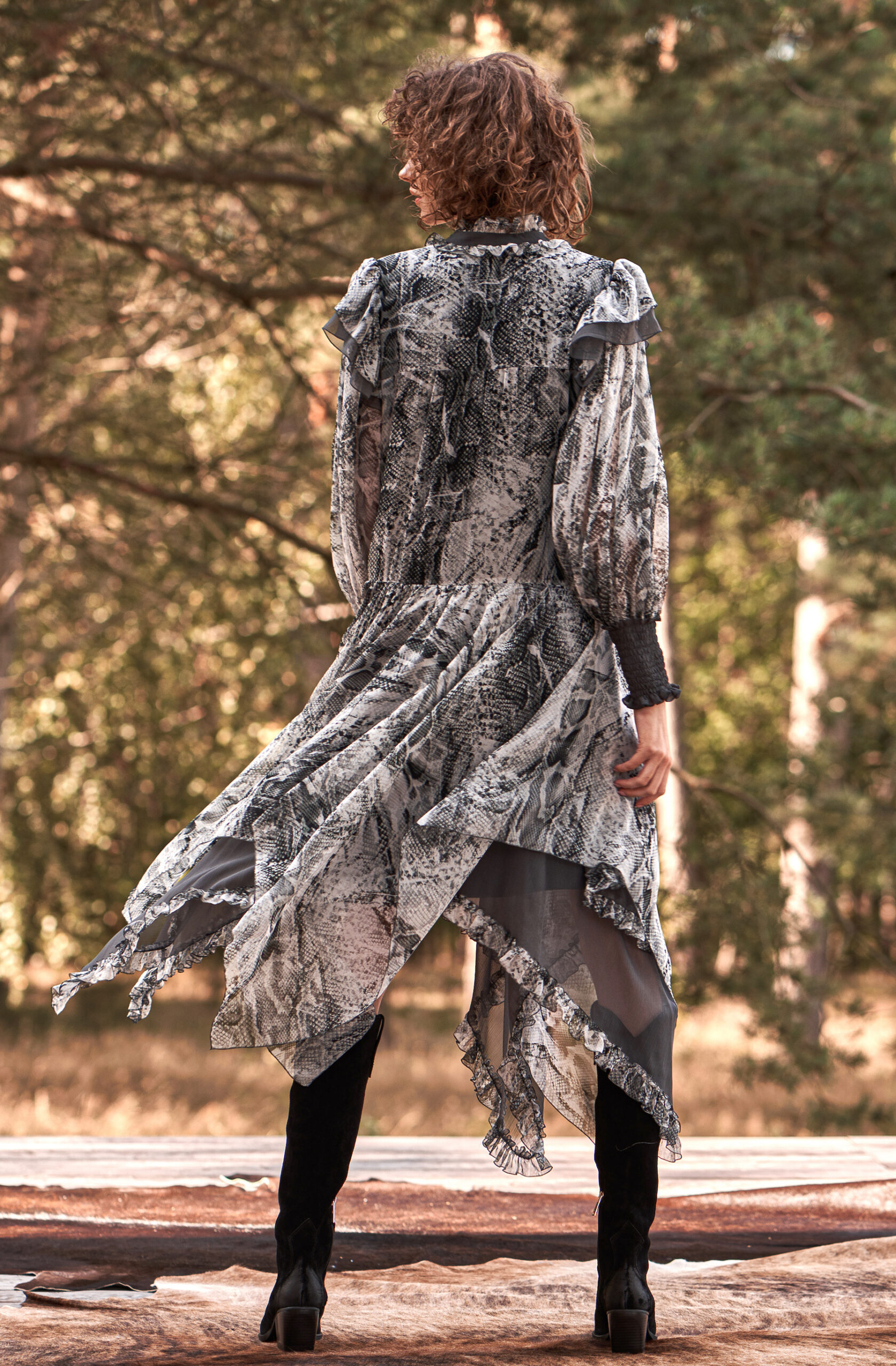 Jedwabna sukienka o artystycznym charakterze zachwyca lekką, zwiewną formą i wyrazistym wzorem inspirowanym motywem skóry węża w odcieniach szarości, grafitu i czerni. Wykonana z delikatnego, półtransparentnego jedwabiu, subtelnie porusza się przy każdym kroku, tworząc efekt lekkości i naturalnej elegancji.