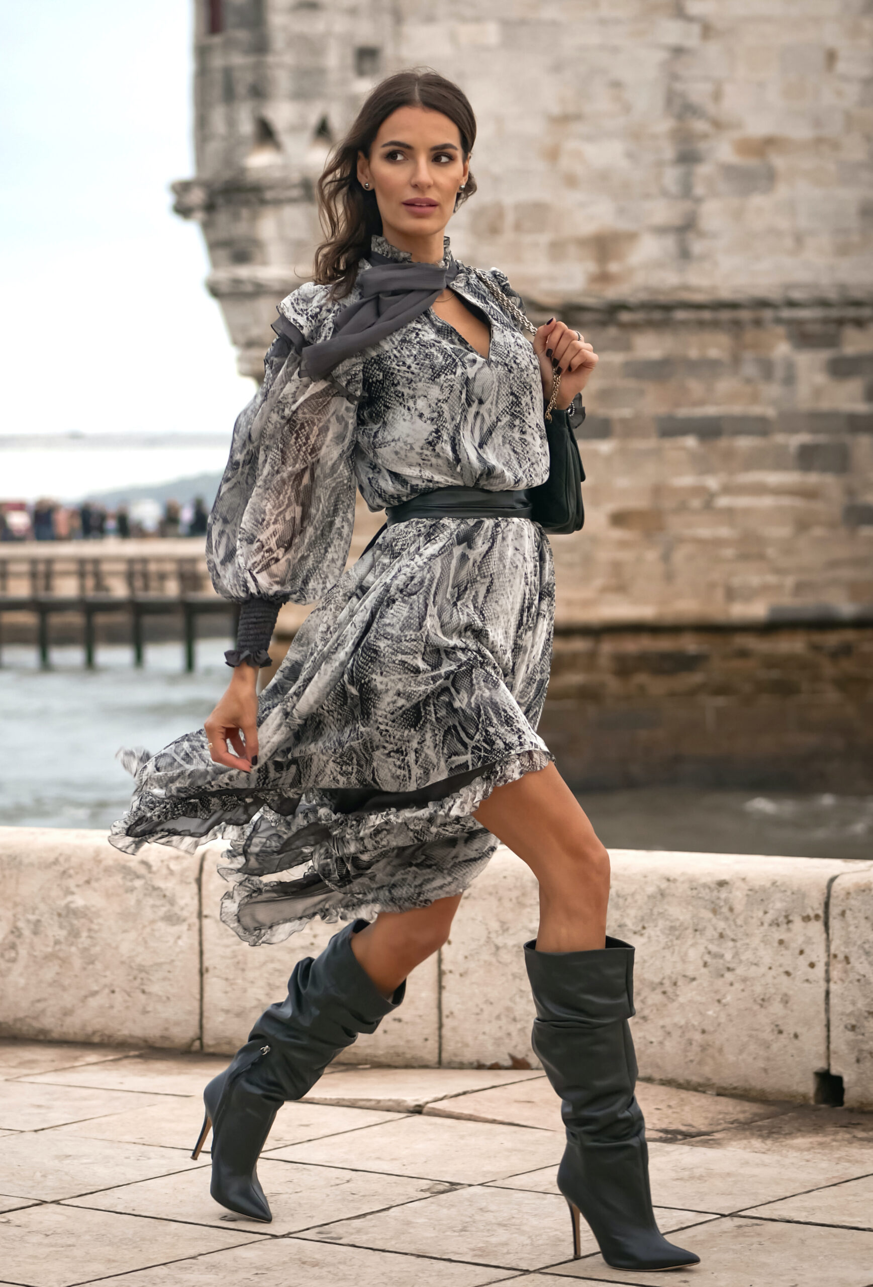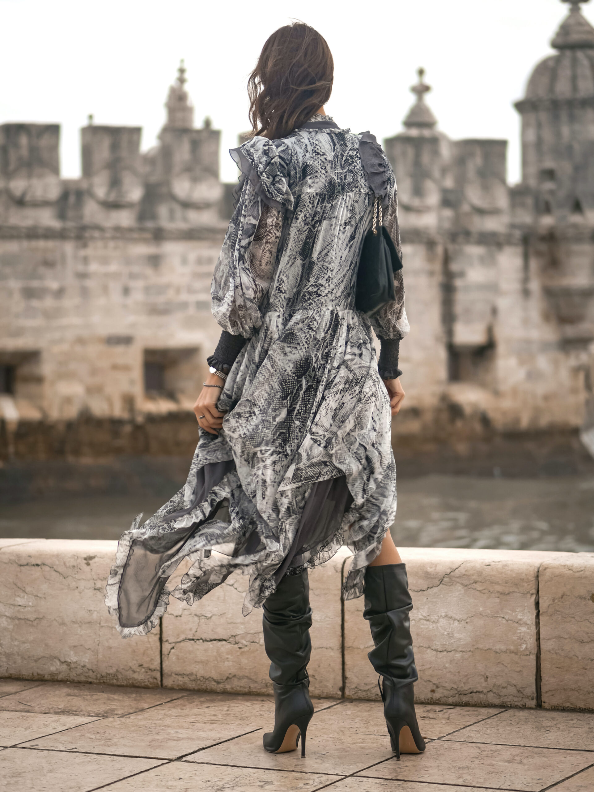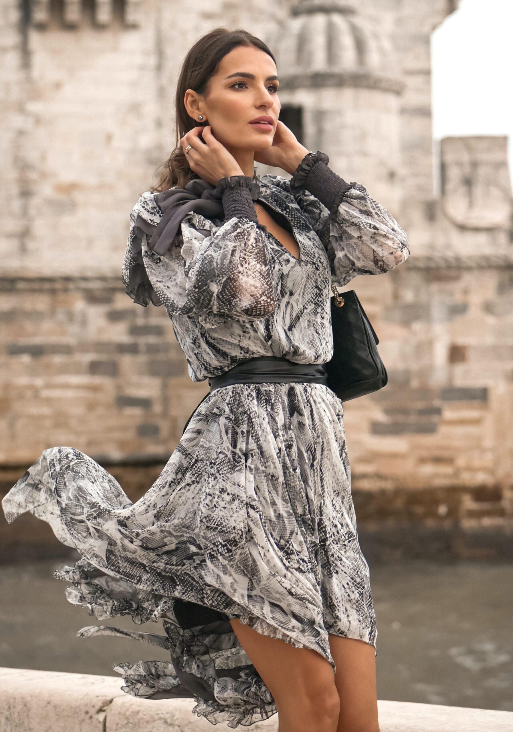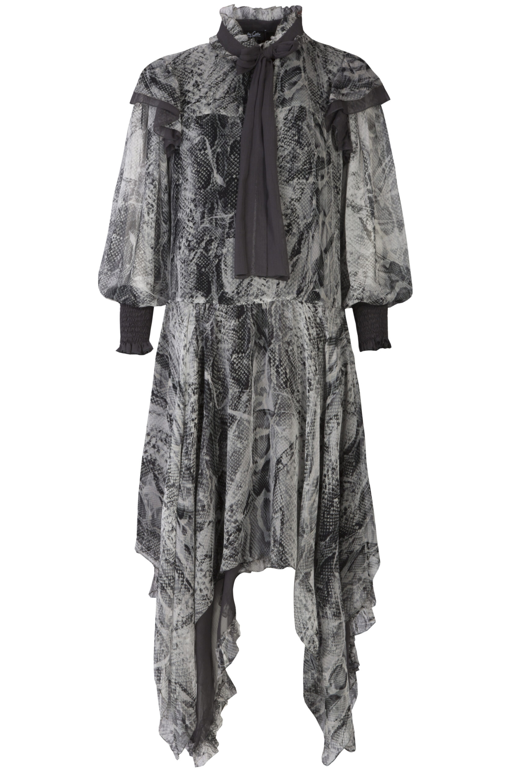 Jedwabna sukienka o artystycznym charakterze zachwyca lekką, zwiewną formą i wyrazistym wzorem inspirowanym motywem skóry węża w odcieniach szarości, grafitu i czerni. Wykonana z delikatnego, półtransparentnego jedwabiu, subtelnie porusza się przy każdym kroku, tworząc efekt lekkości i naturalnej elegancji.