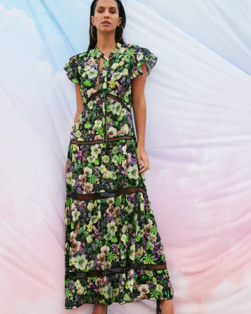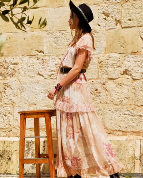 Model ma luźny, swobodny krój z obniżoną linią talii, z której opada asymetryczny, wielowarstwowy dół. Nieregularna długość z falującymi, delikatnie marszczonymi krawędziami nadaje sukience dynamiczny, nowoczesny wygląd i podkreśla jej wyjątkowy charakter. Spód wykończony jest subtelną falbanką, która potęguje efekt płynności tkaniny.