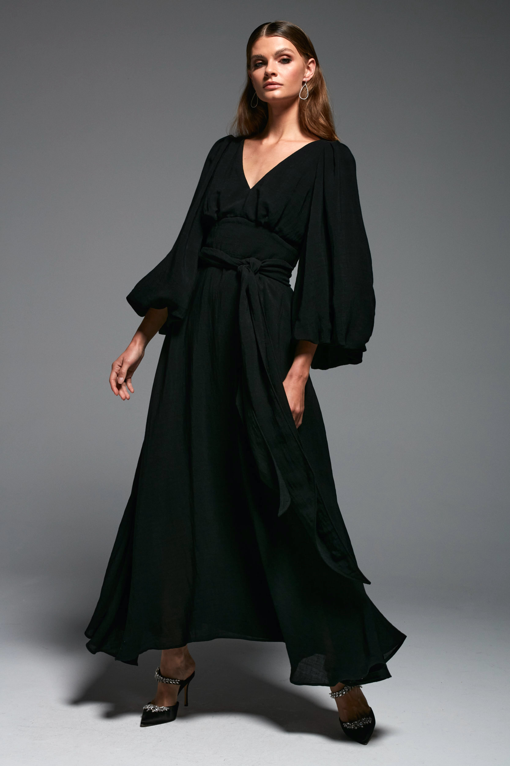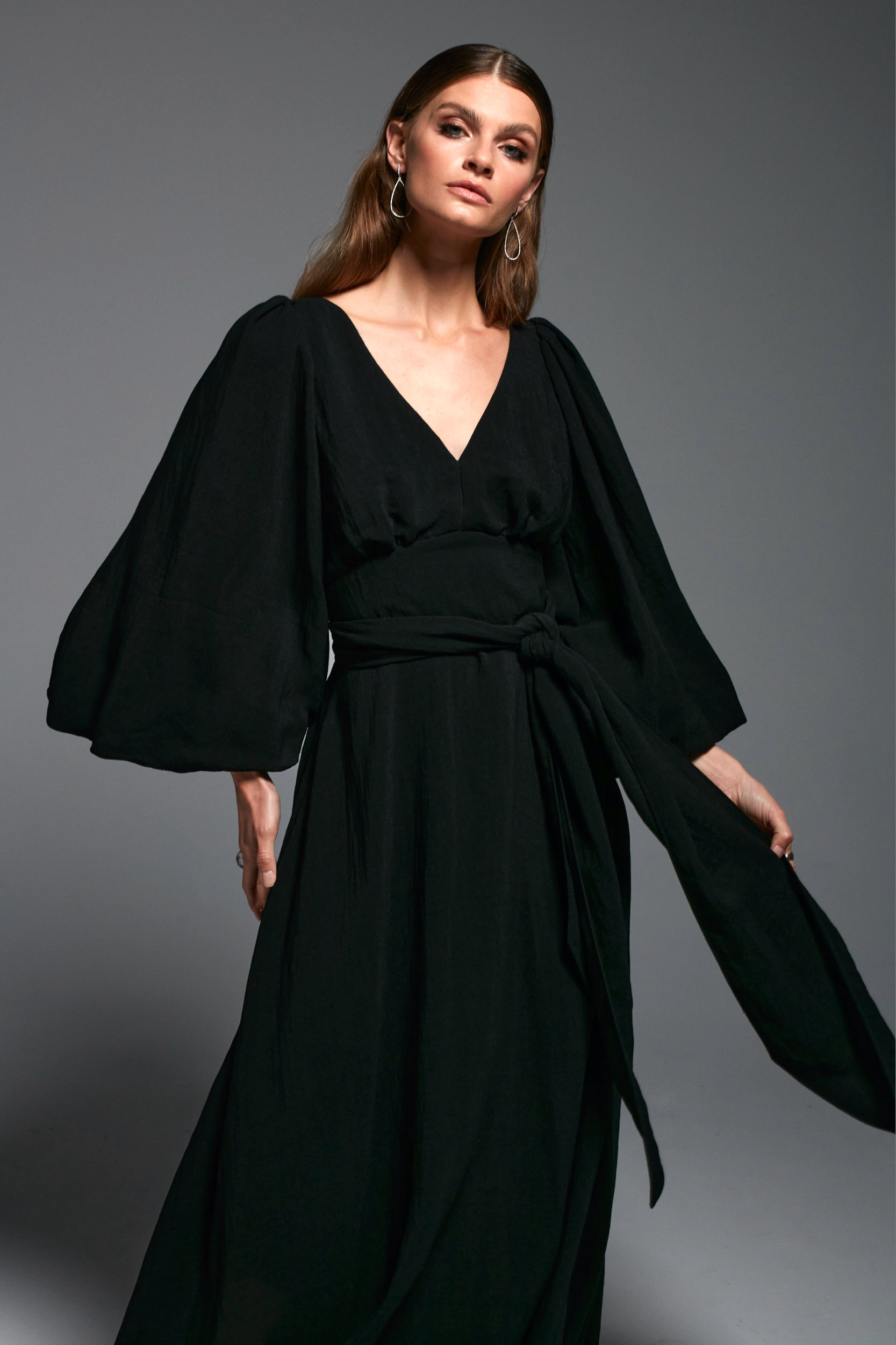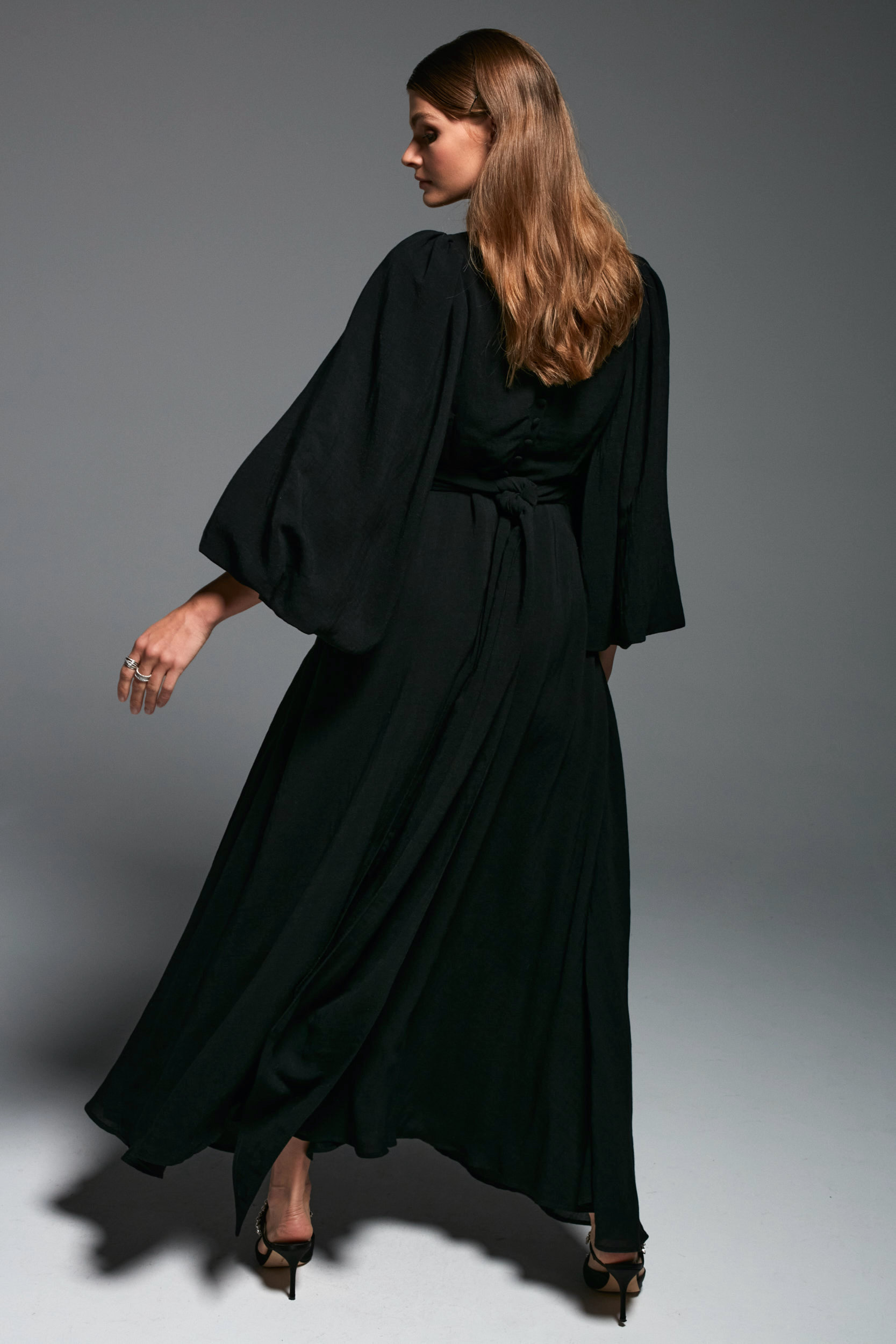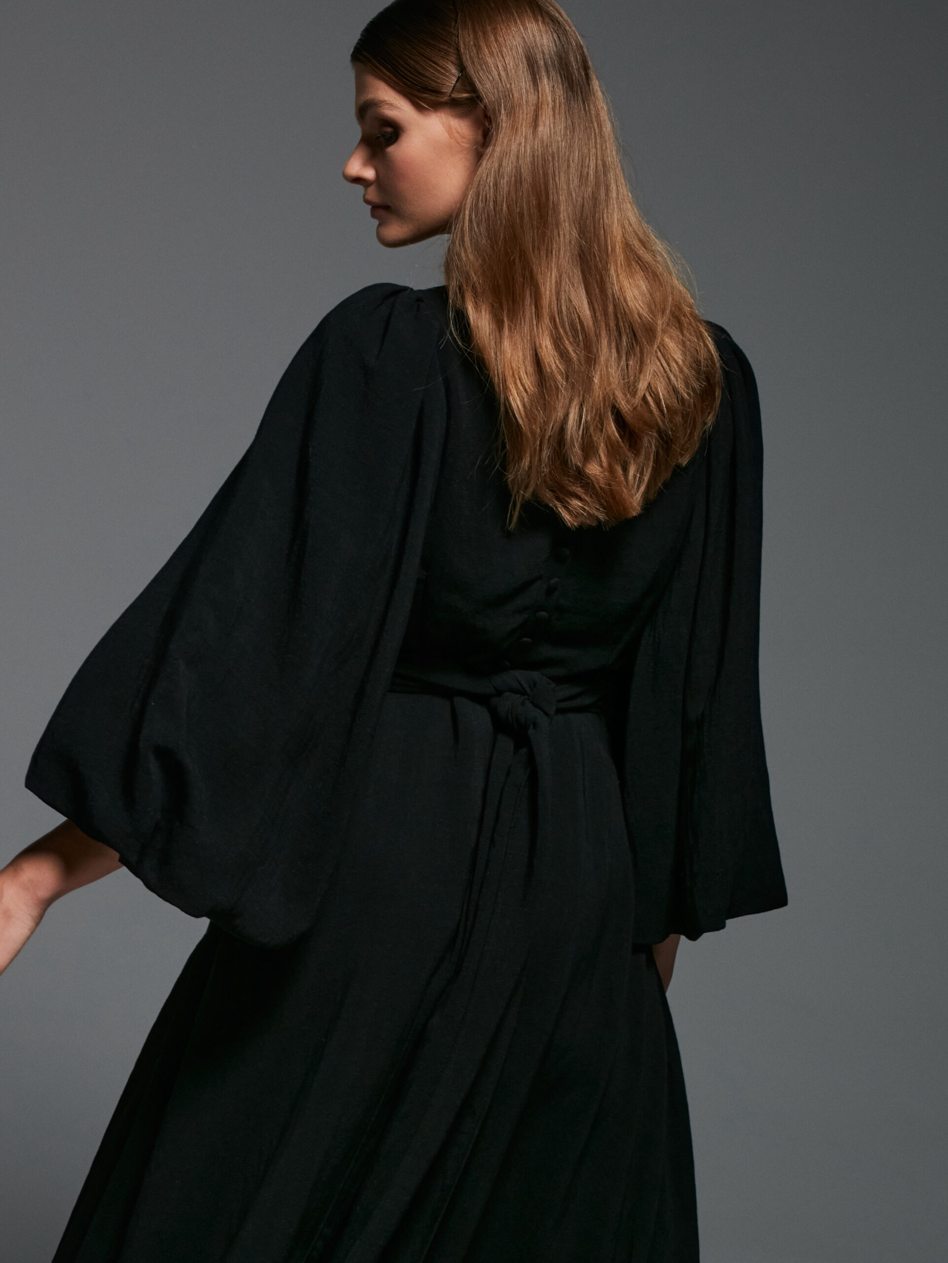 Sukienka ma rząd obciąganych materiałem guzików na plecach, szeroki pas, którym można ściągnąć sukienkę w talii, zamek z boku dla idealnego dopasowania.