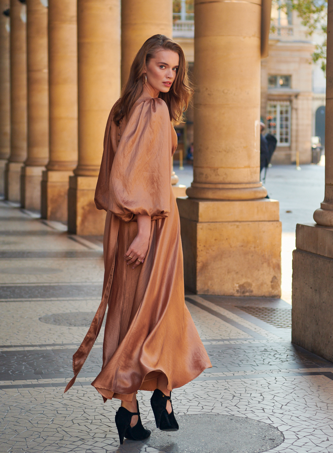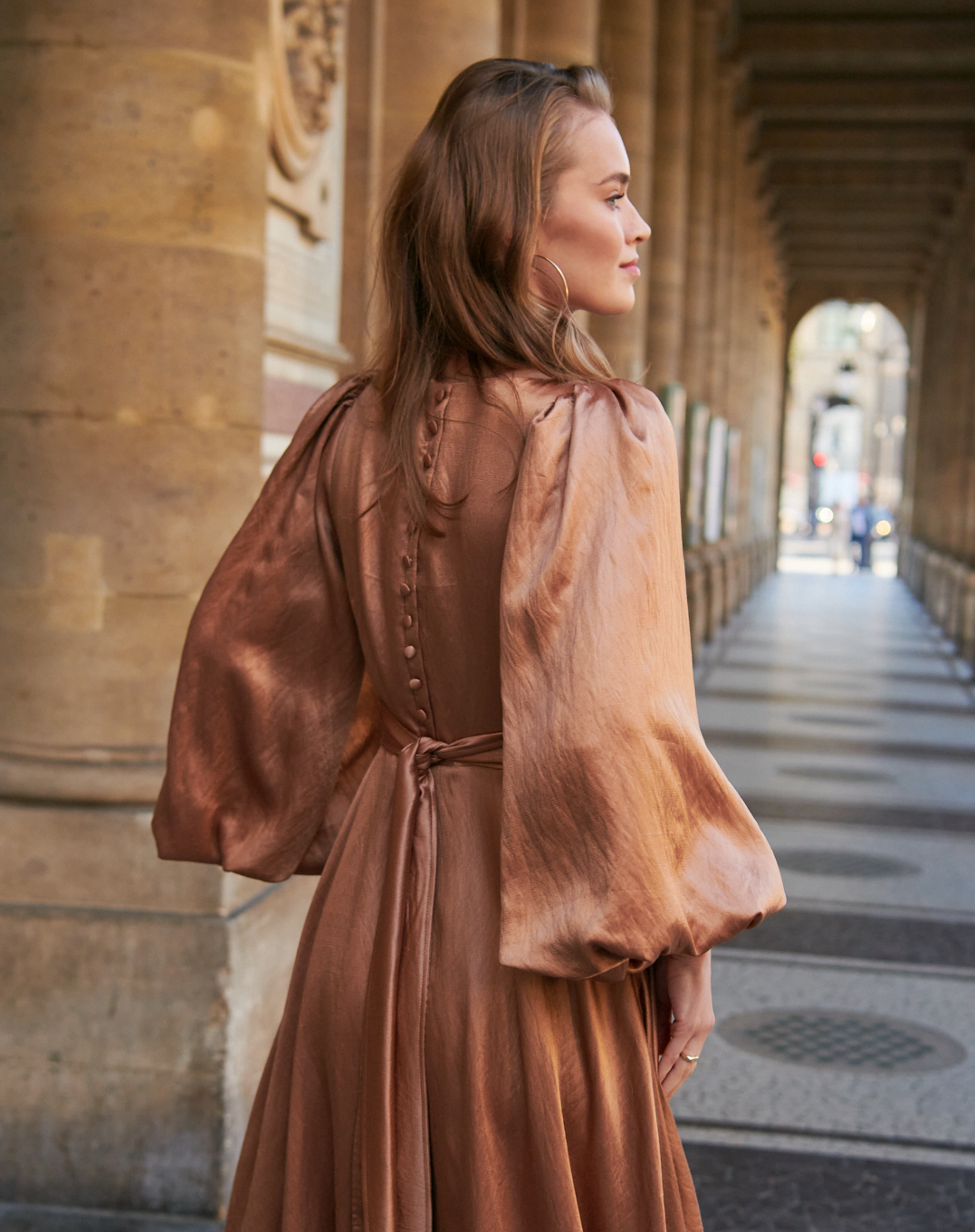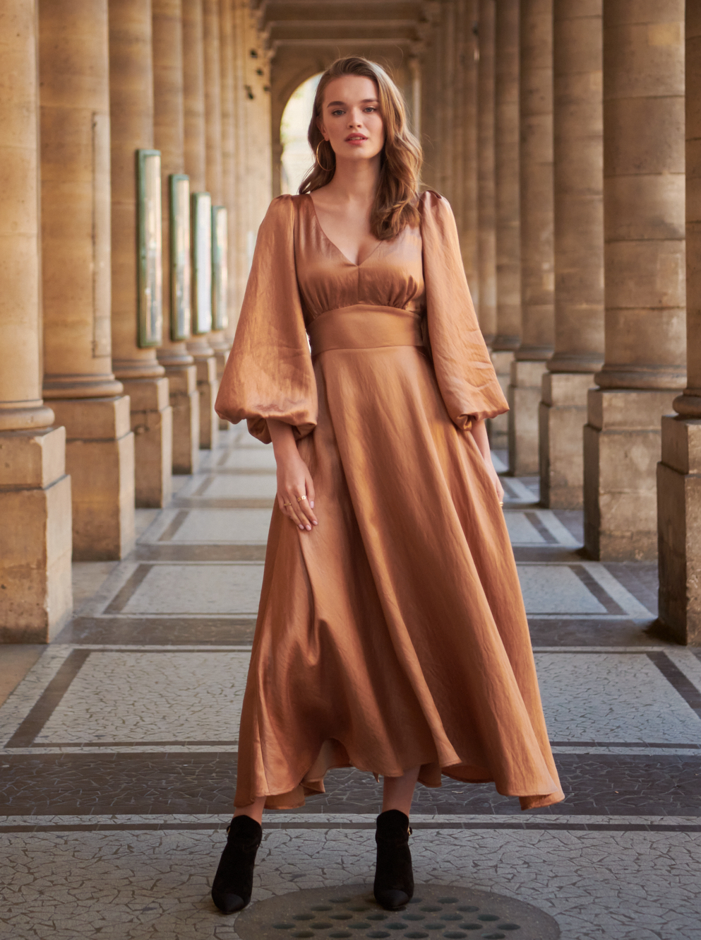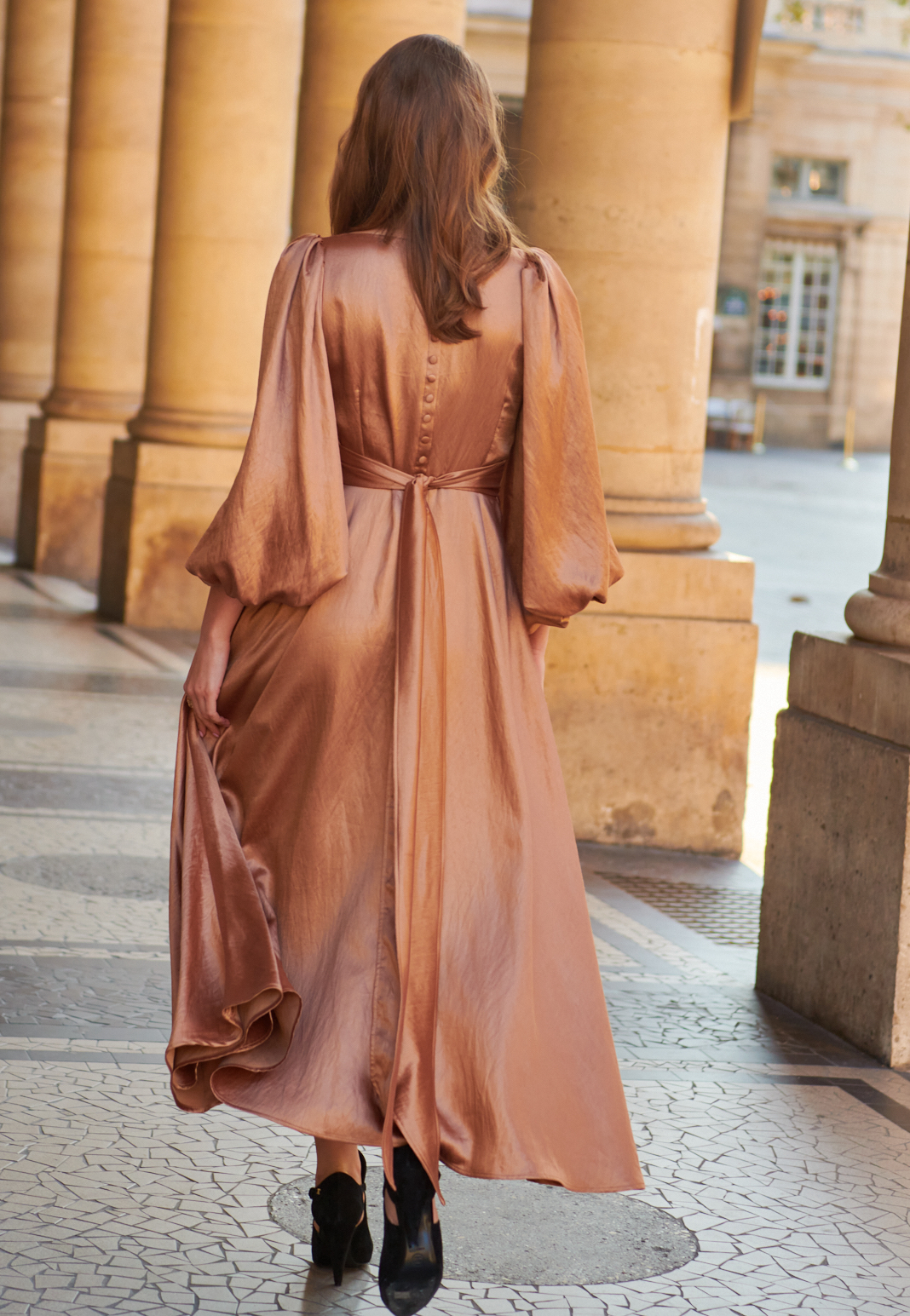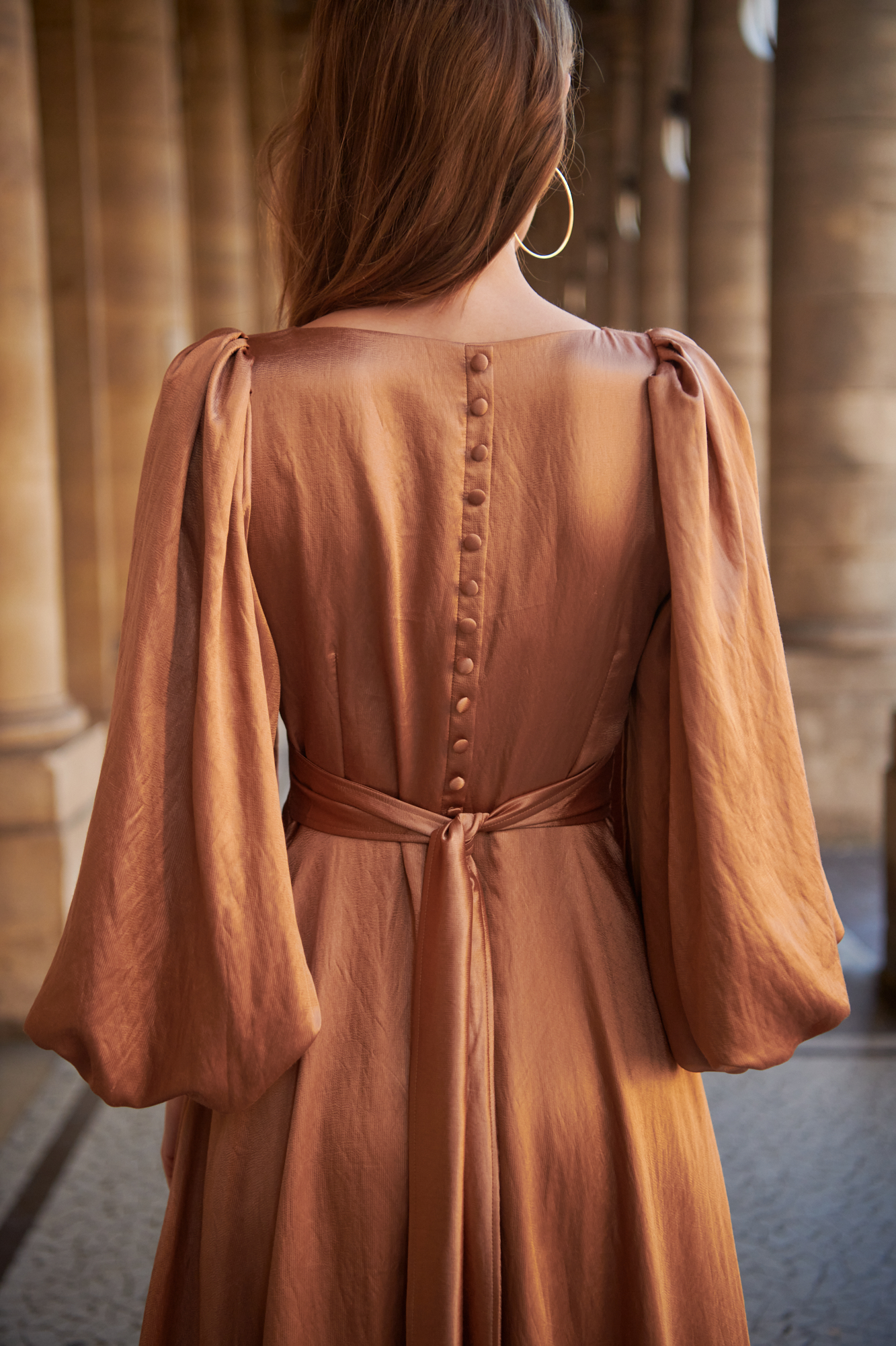 Sukienka ma rząd obciąganych materiałem guzików na plecach, szeroki pas, którym można ściągnąć sukienkę w talii, zamek z boku dla idealnego dopasowania.