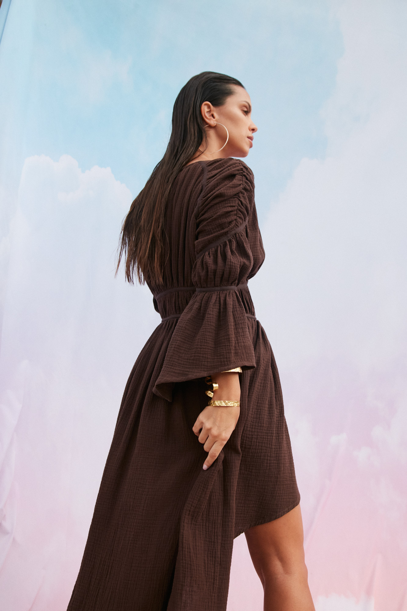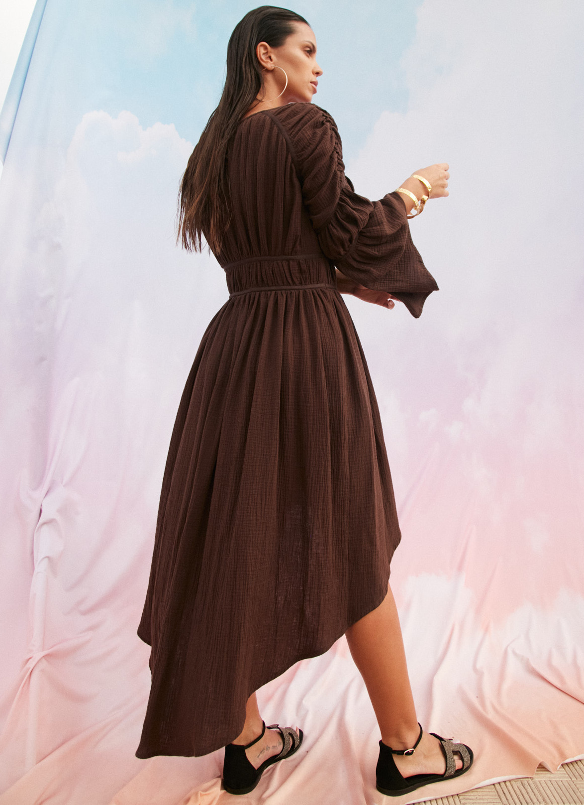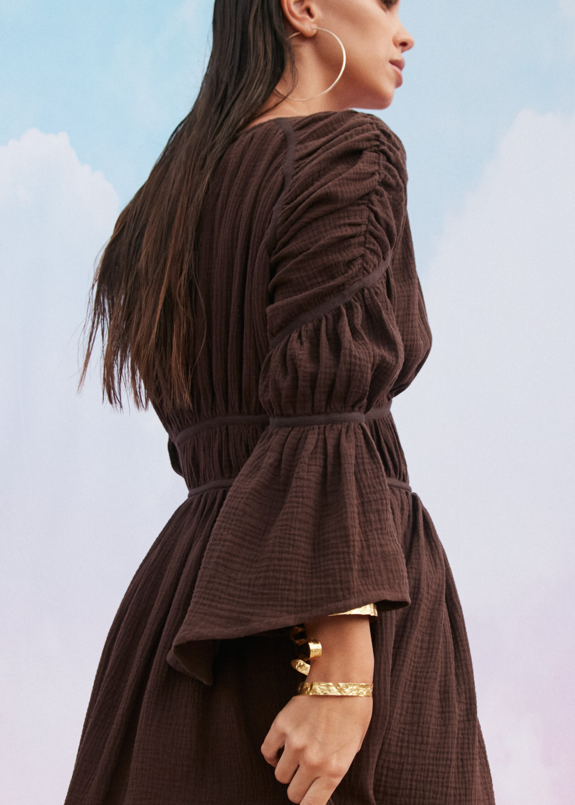 Sukienka z miękkiego muślinu, marszczenia podkreślone bawełnianą taśmą, zamek z boku