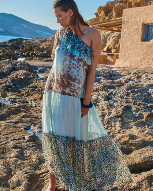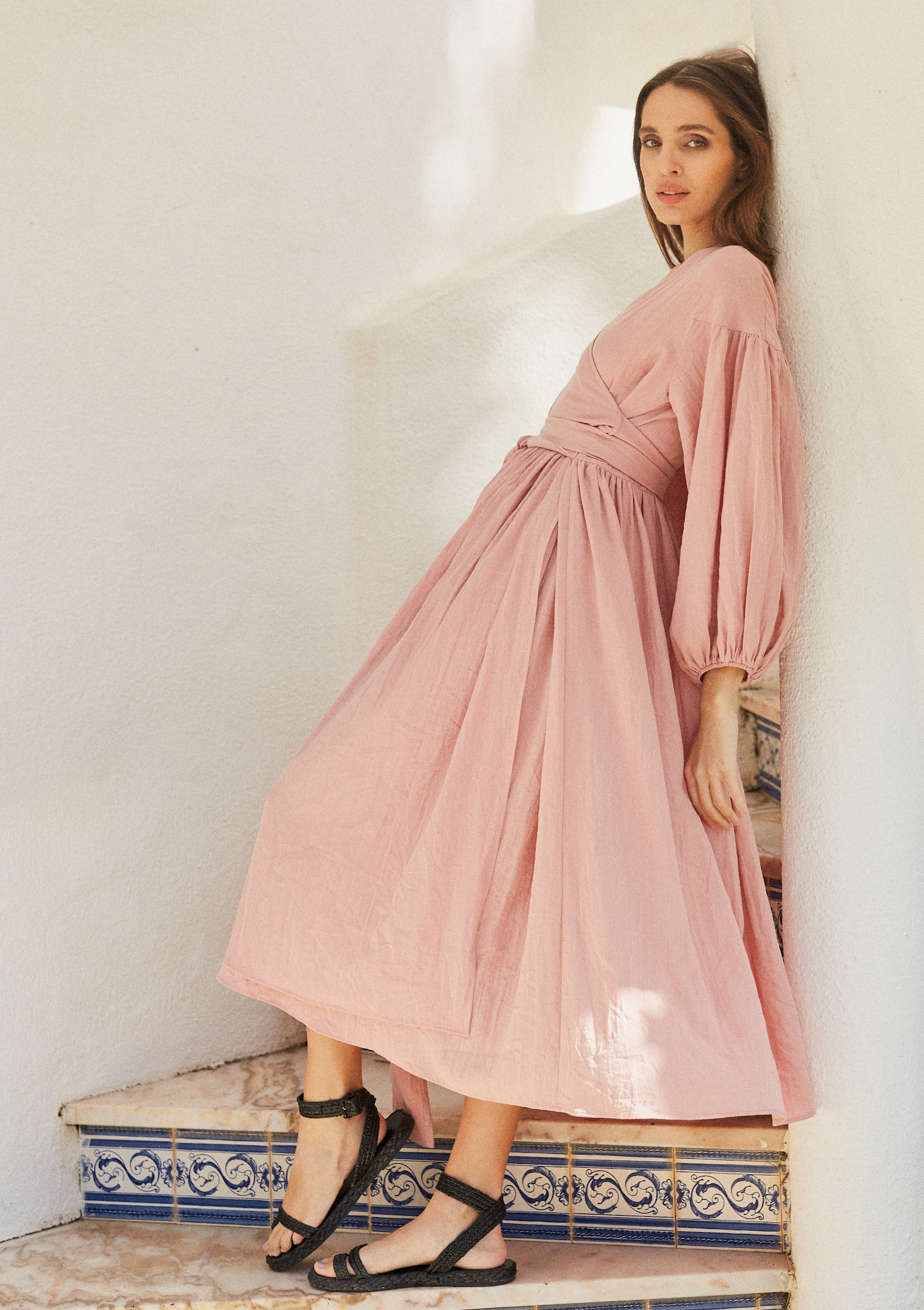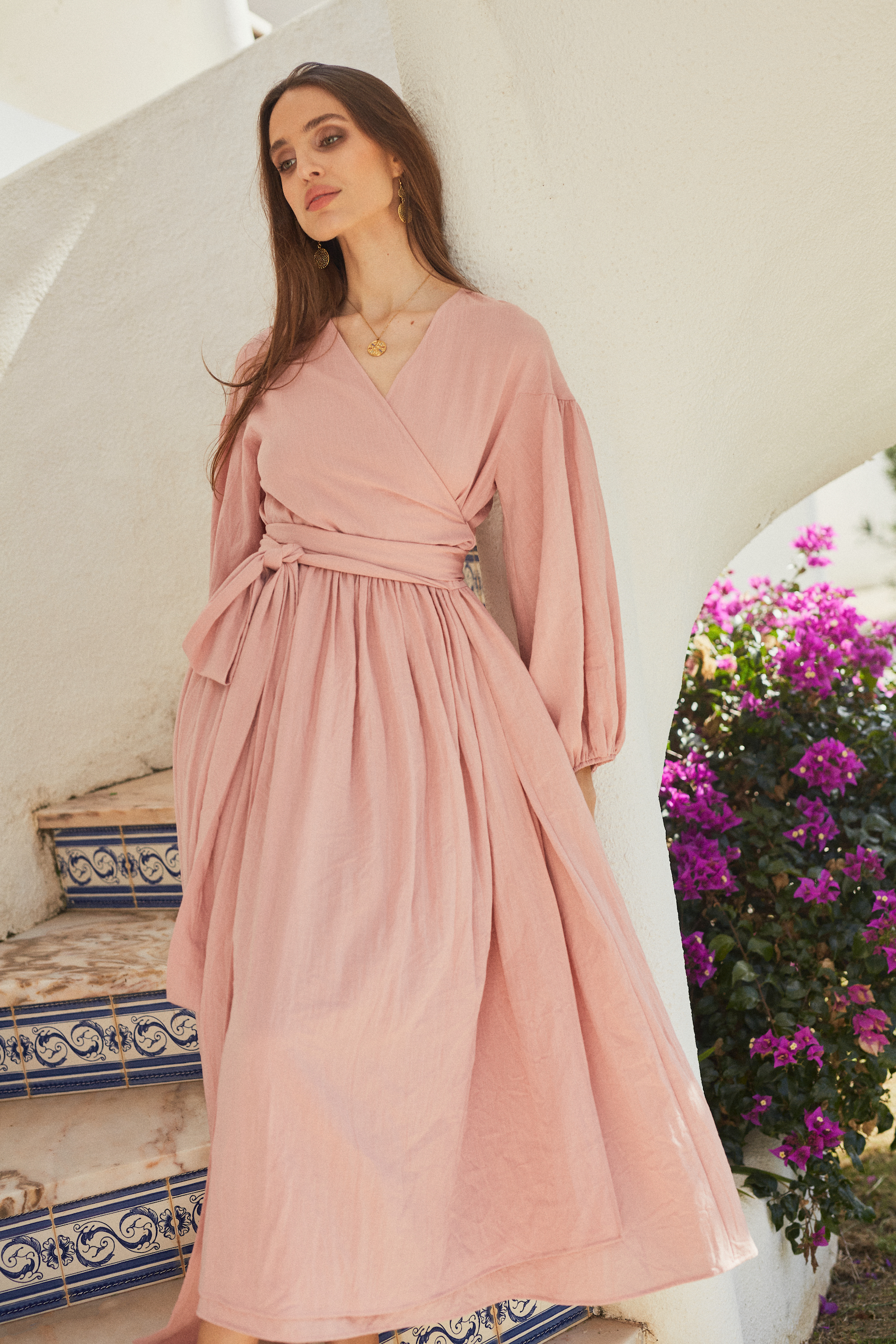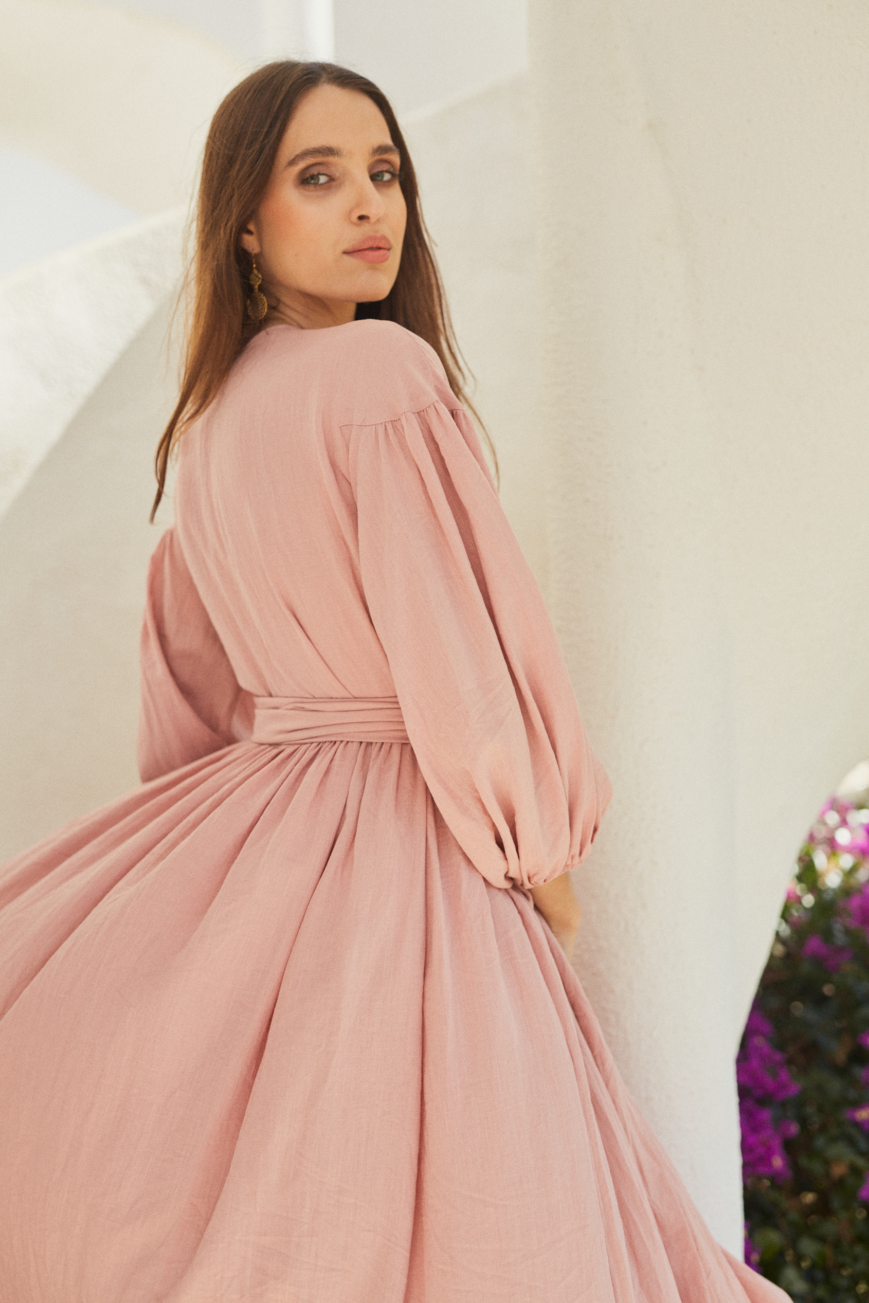Obszerna sukienka, jej długi pas należy kilka razy owinąć w talii.