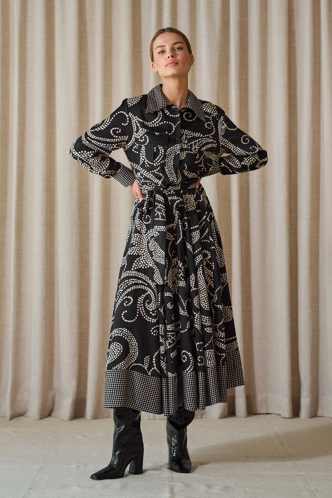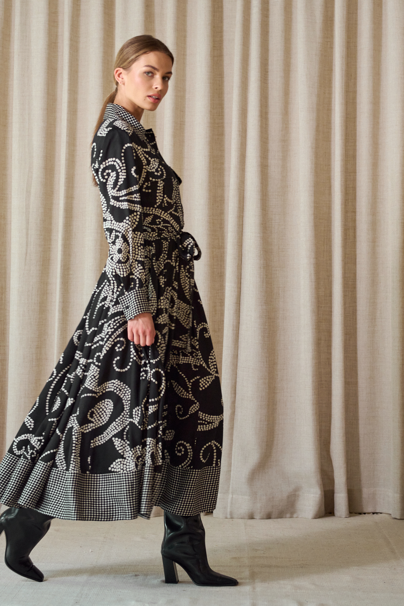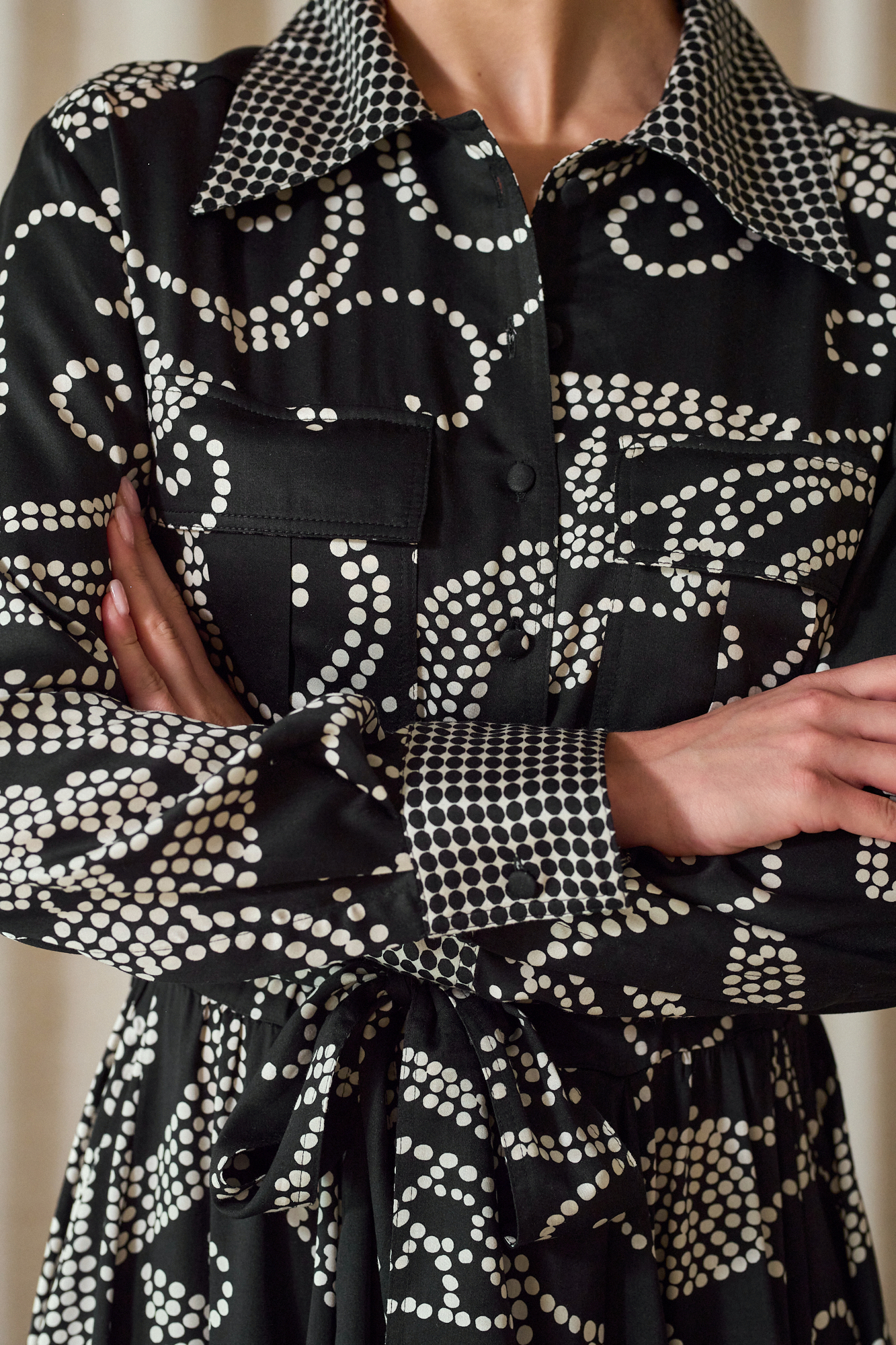 Obcigąne czarne guziczki, na mankietach po 2, dla lepszej regulacji, przewiązywana w pasie paskiem z tej samej tkaniny, który można zastąpić też paskiem skórzanym
