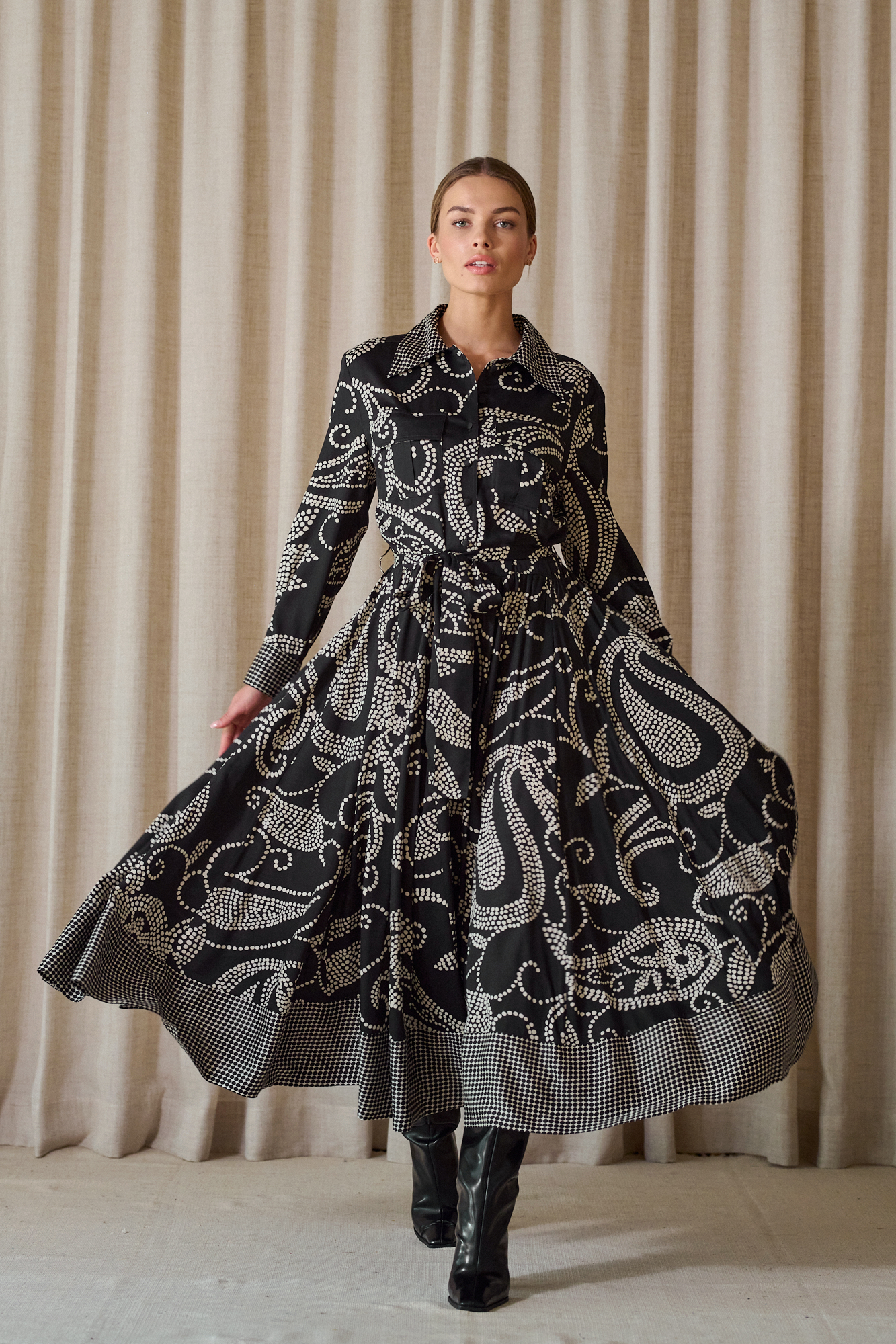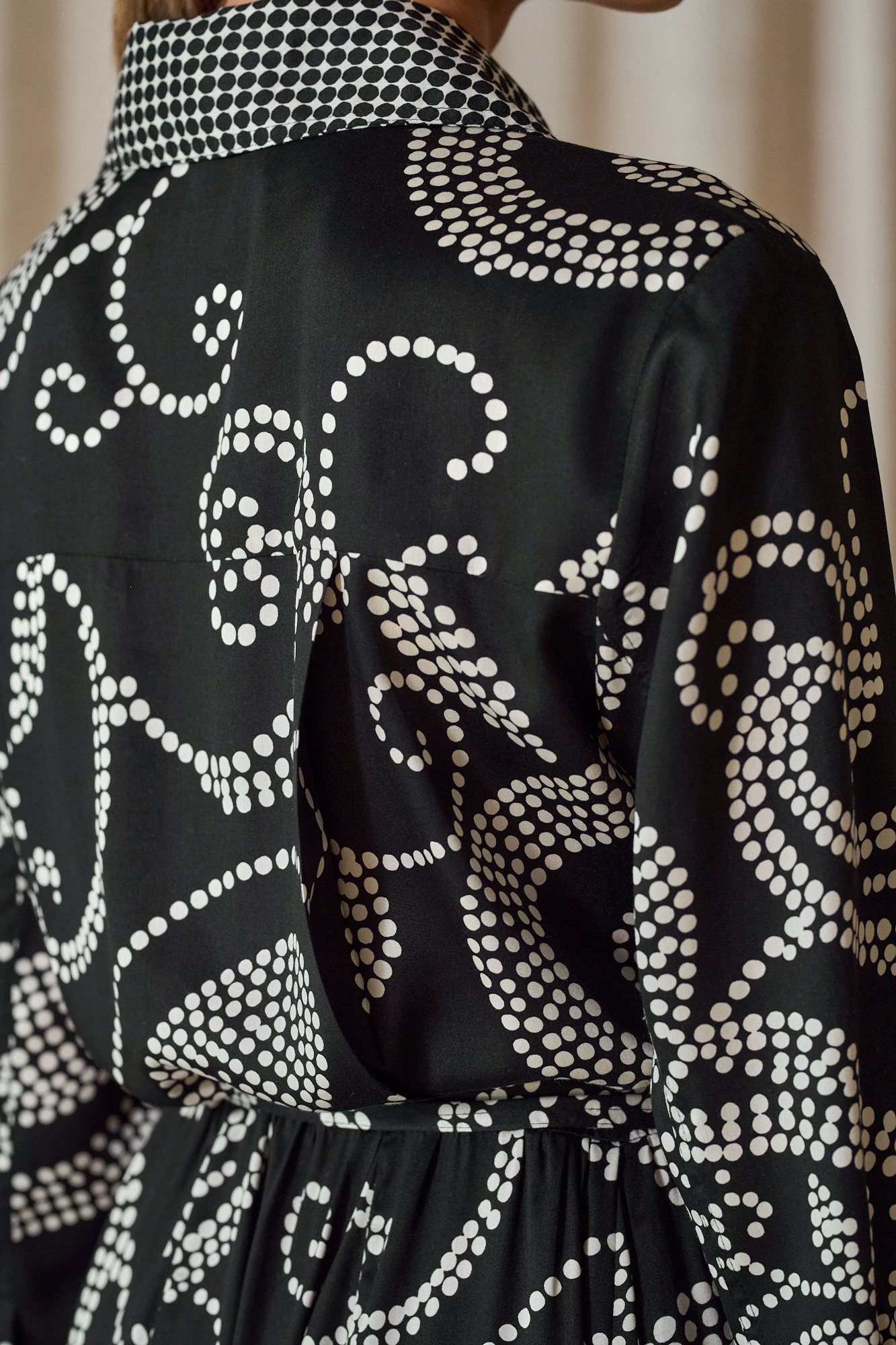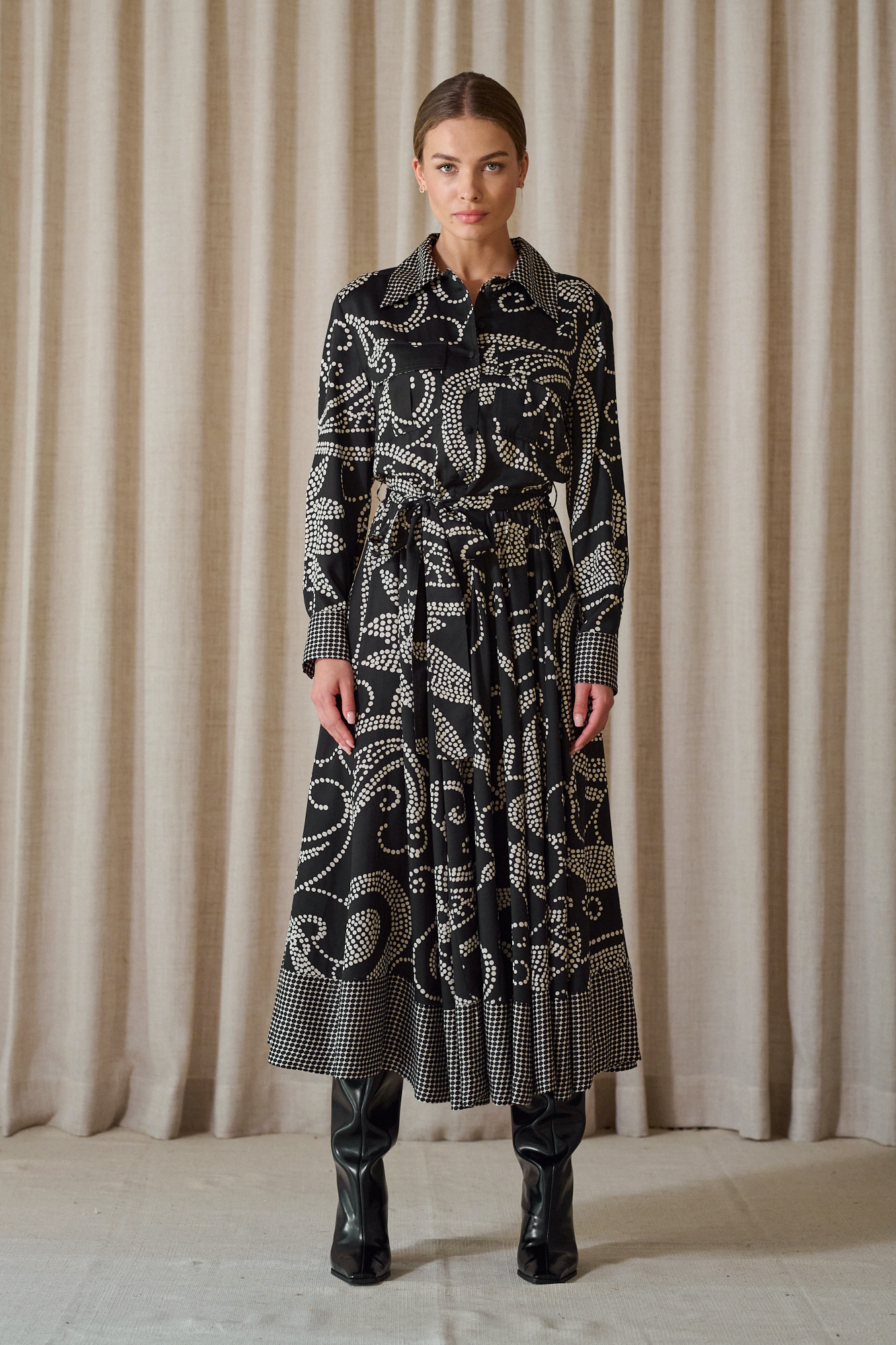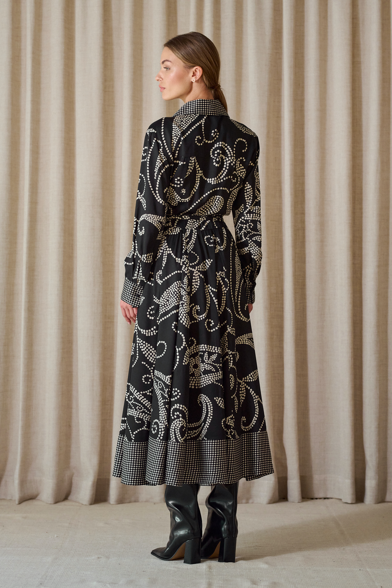 Obcigąne czarne guziczki, na mankietach po 2, dla lepszej regulacji, przewiązywana w pasie paskiem z tej samej tkaniny, który można zastąpić też paskiem skórzanym