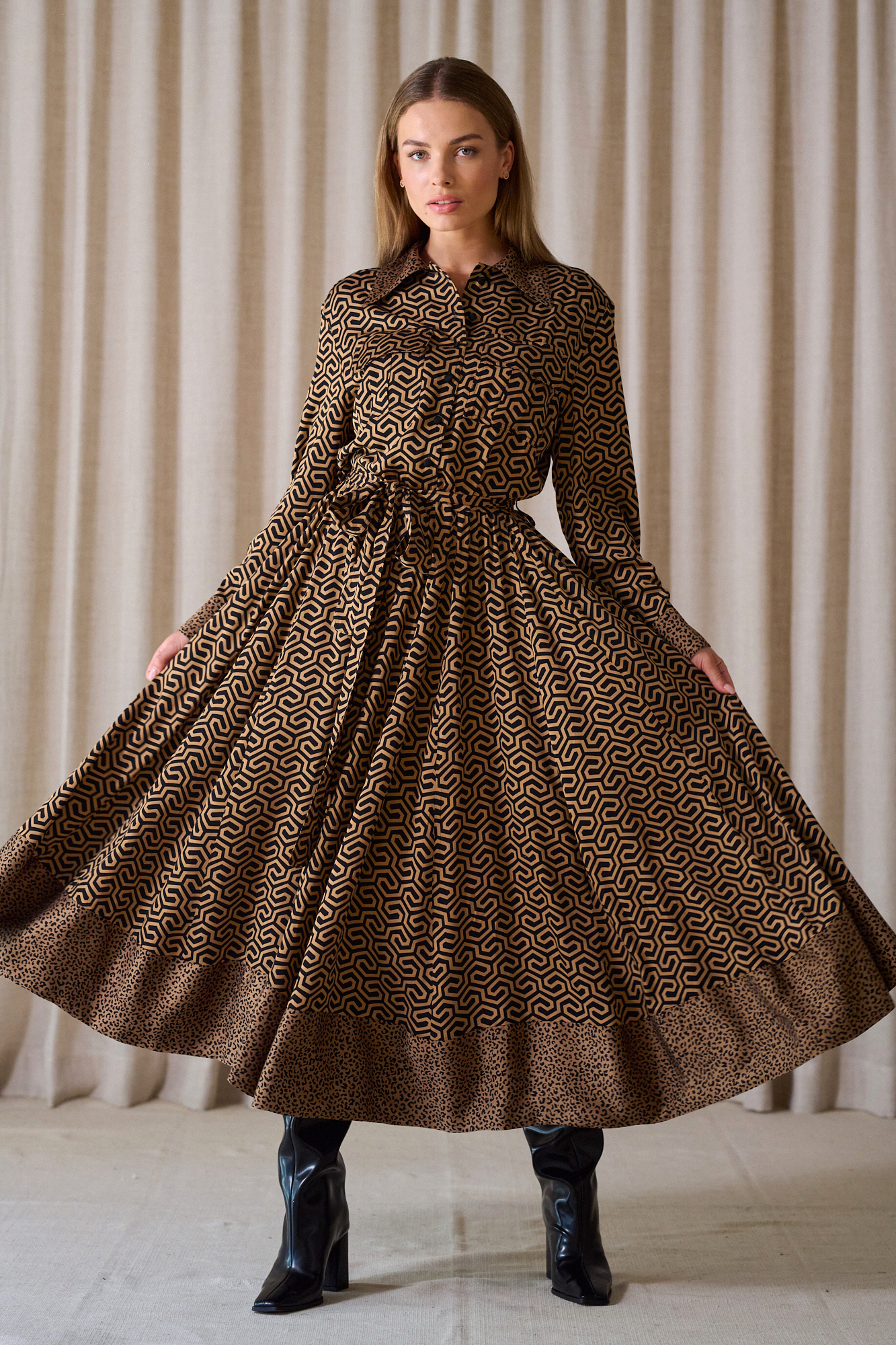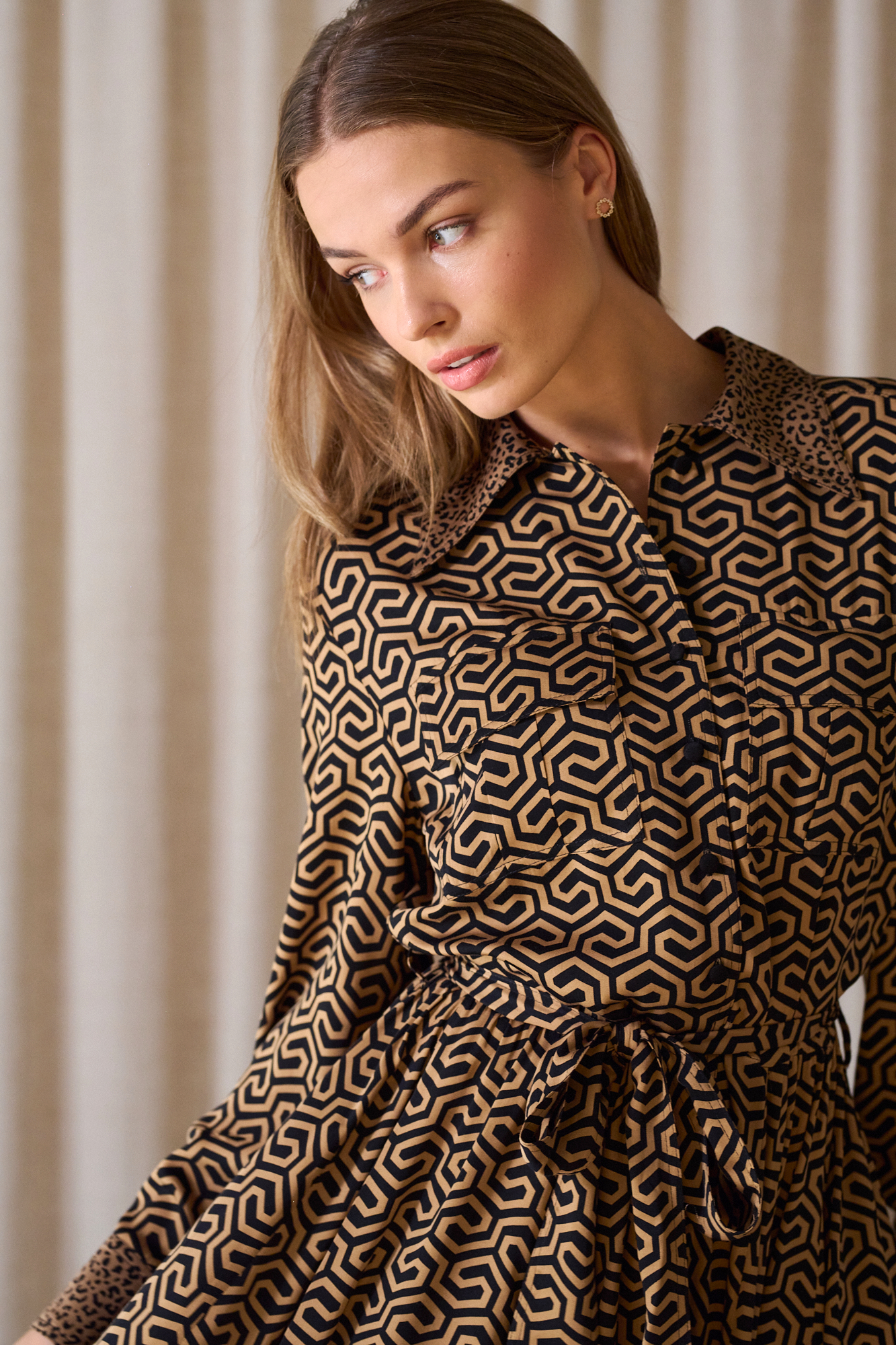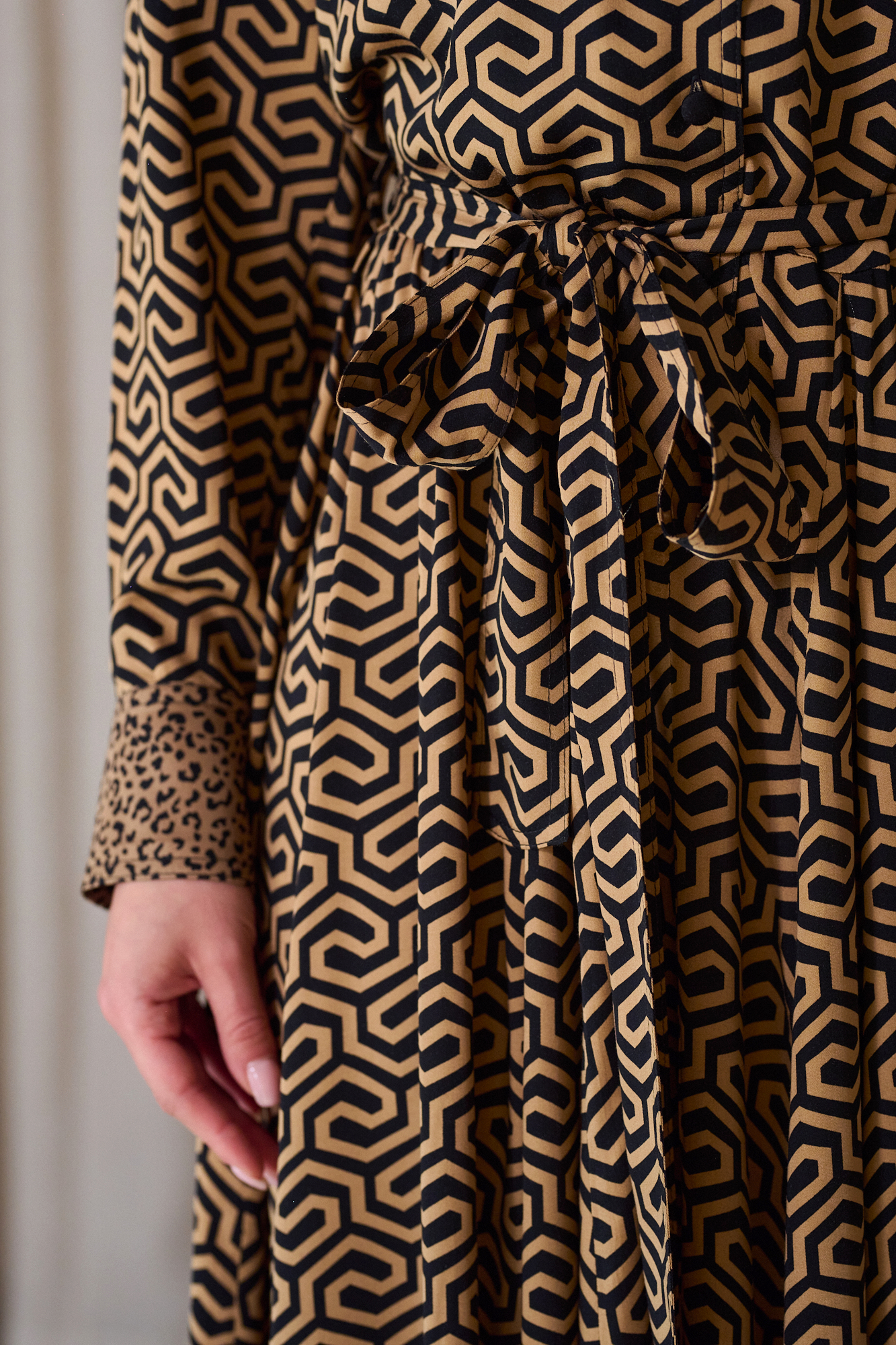 Obcigąne czarne guziczki, na mankietach po 2, dla lepszej regulacji, przewiązywana w pasie paskiem z tej samej tkaniny, który można zastąpić też paskiem skórzanym