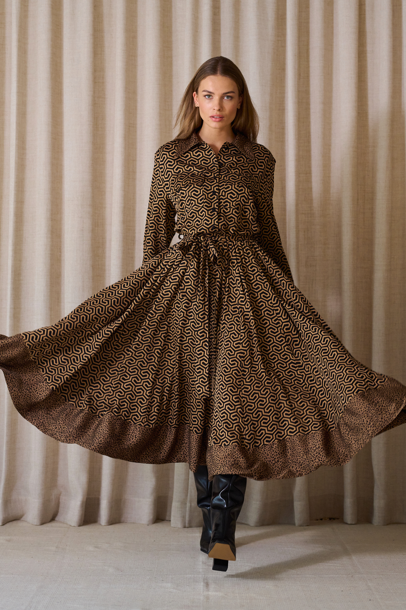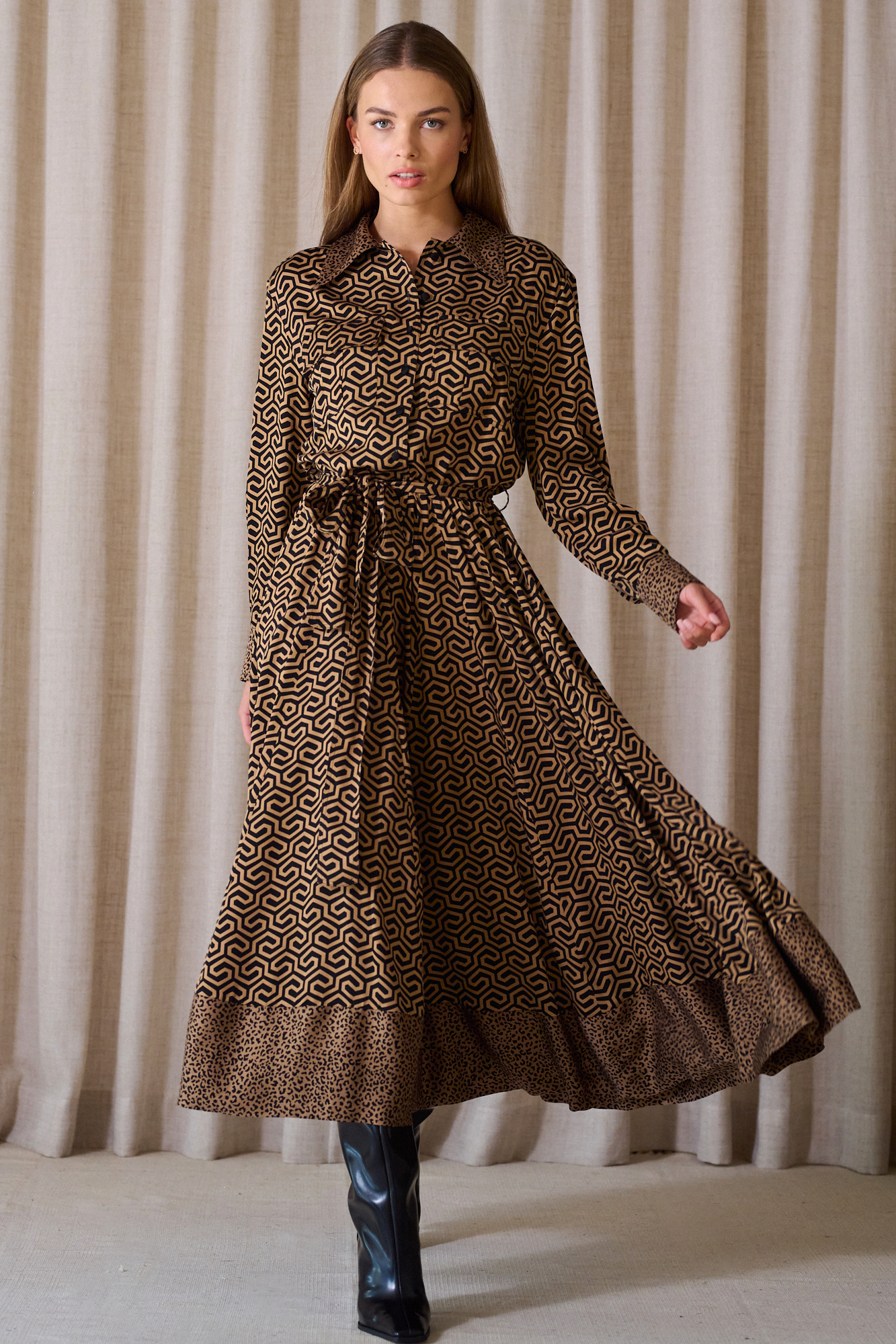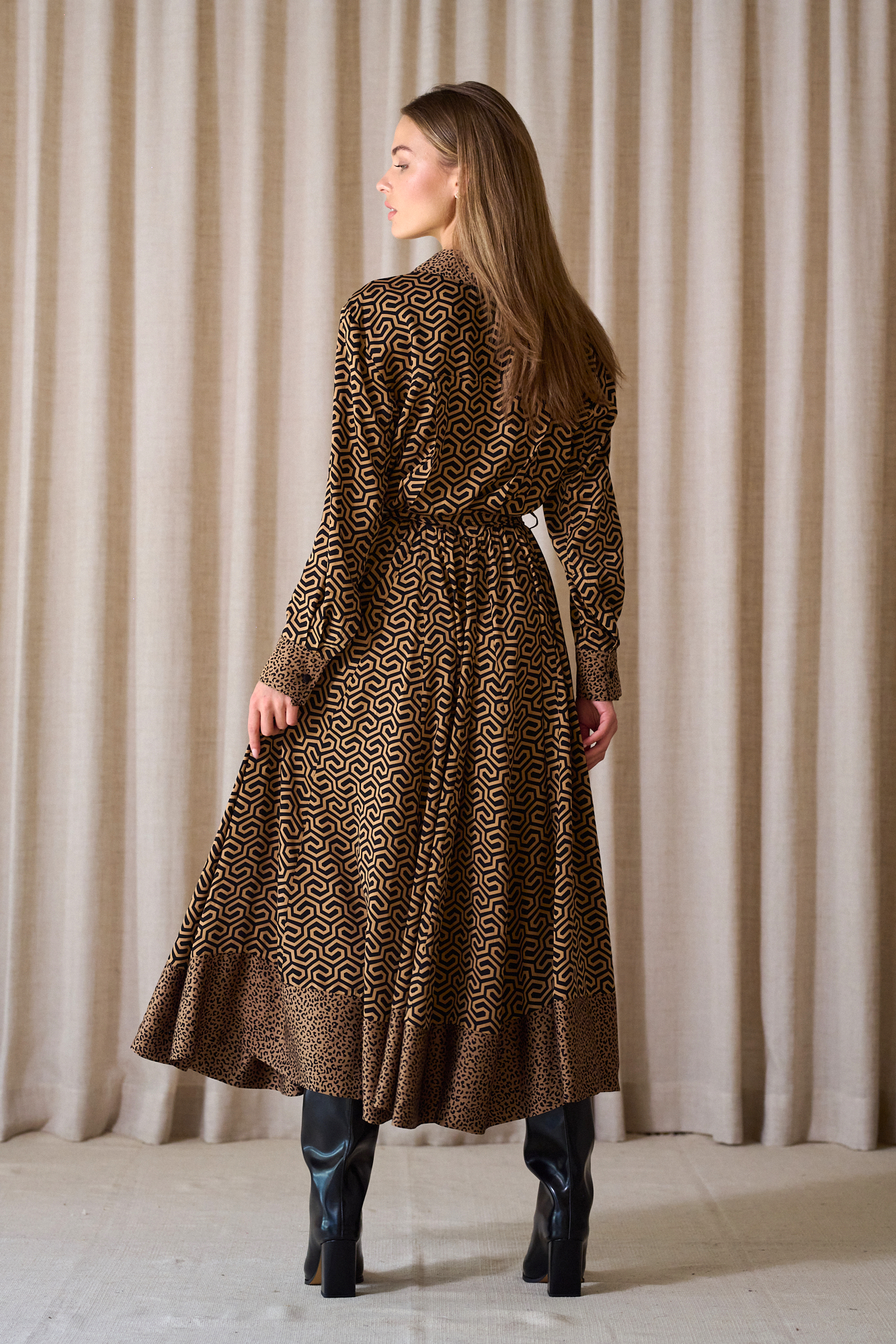 Obcigąne czarne guziczki, na mankietach po 2, dla lepszej regulacji, przewiązywana w pasie paskiem z tej samej tkaniny, który można zastąpić też paskiem skórzanym