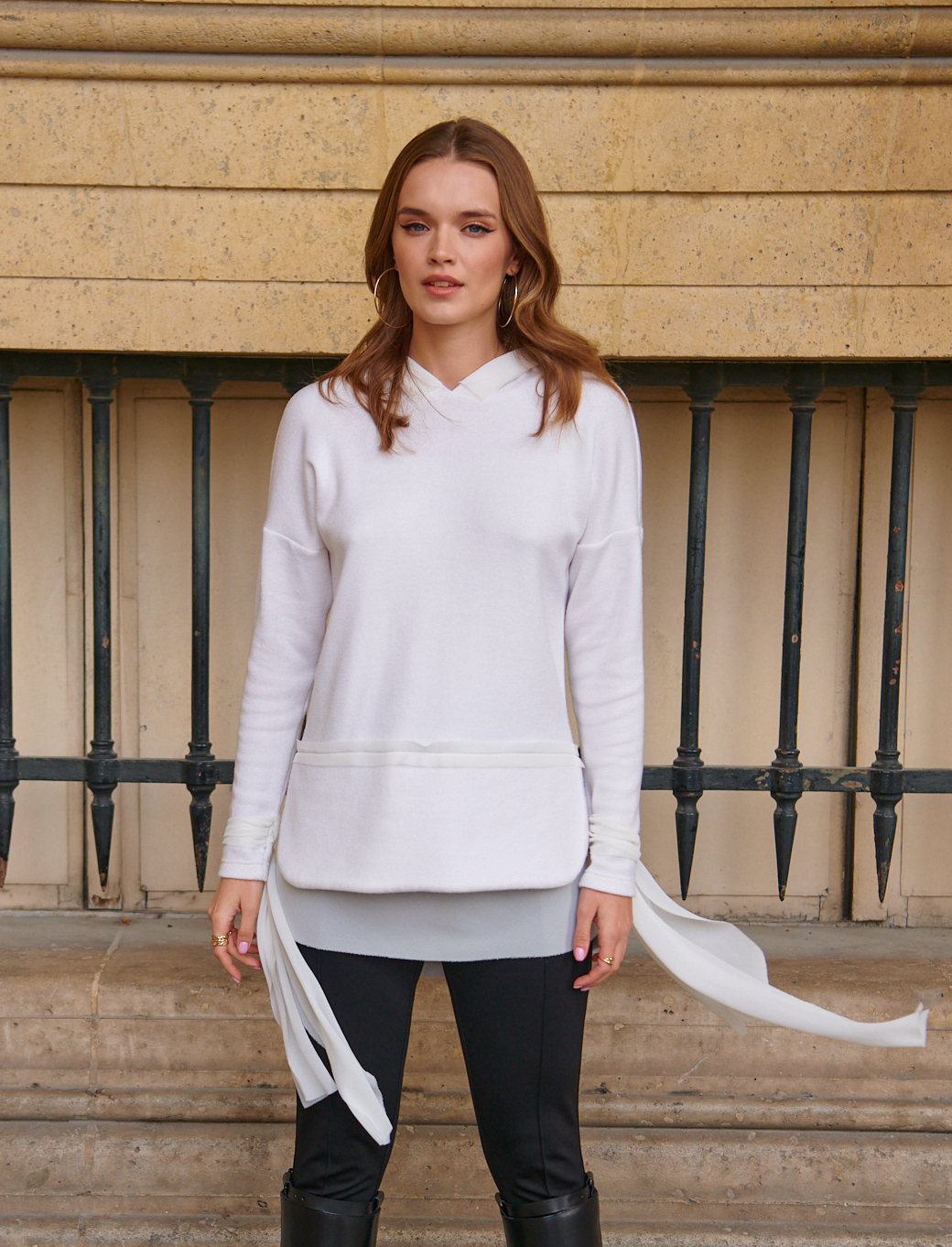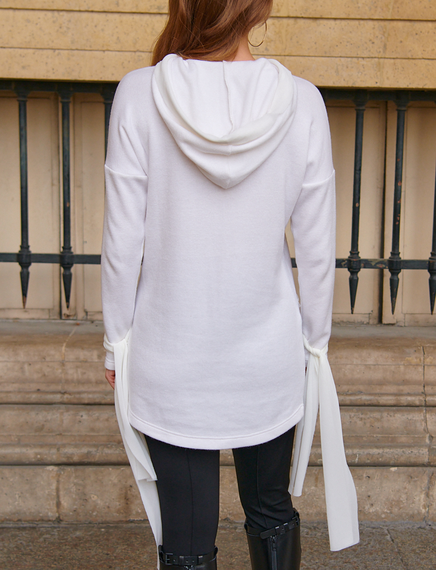 Model ma lekko wydłużony krój, który subtelnie opływa sylwetkę. Dekolt wykończony jest delikatnym kapturem, nadającym całości sportowo-elegancki charakter. Długie rękawy zostały wzbogacone o efektowne, szyfonowe wiązania przy mankietach, które wprowadzają lekkość i oryginalny akcent stylistyczny.