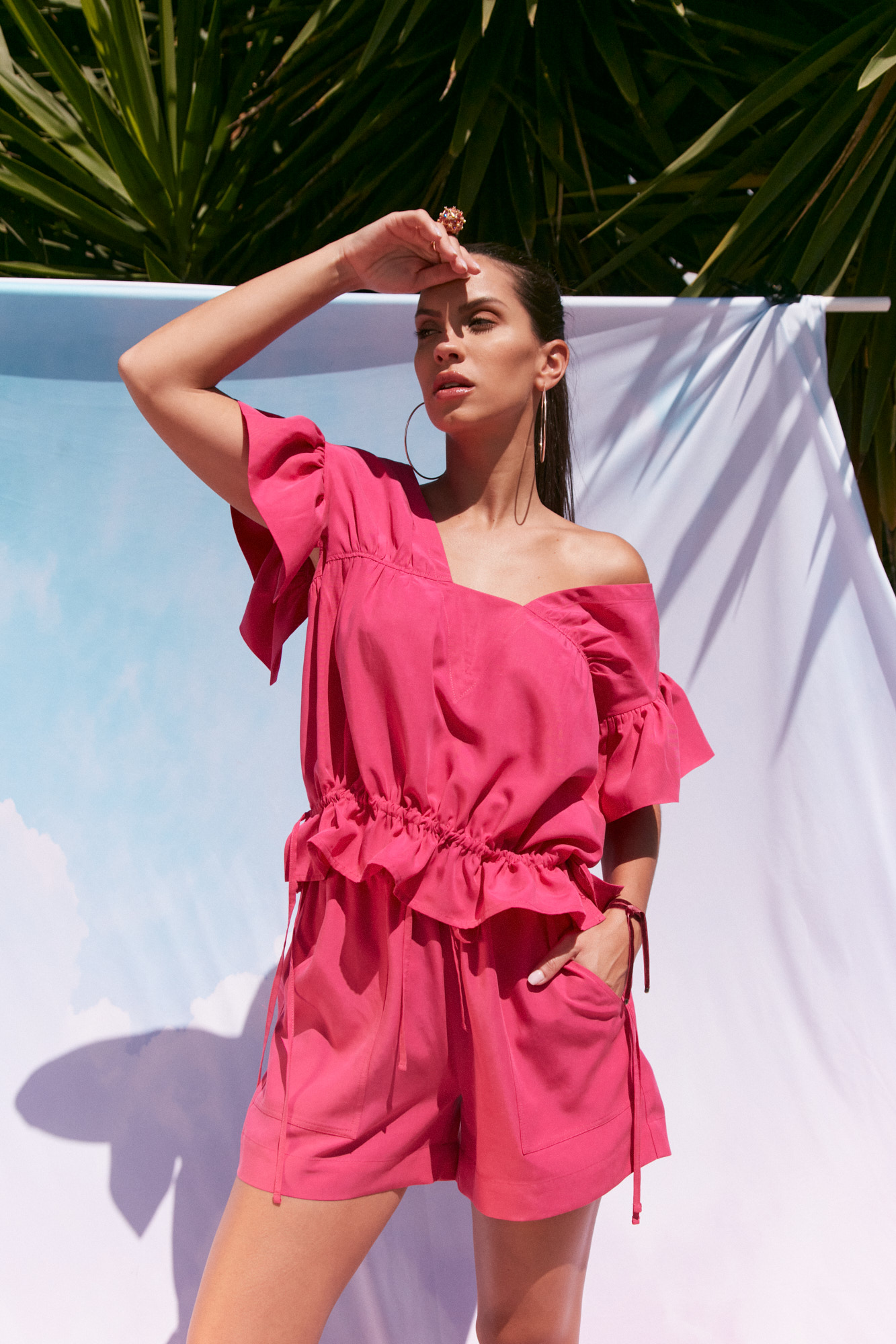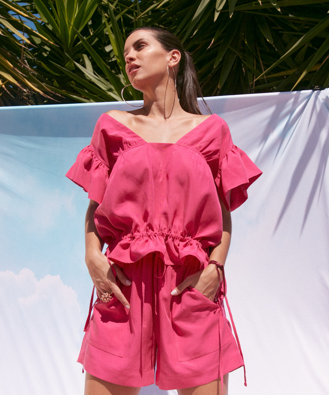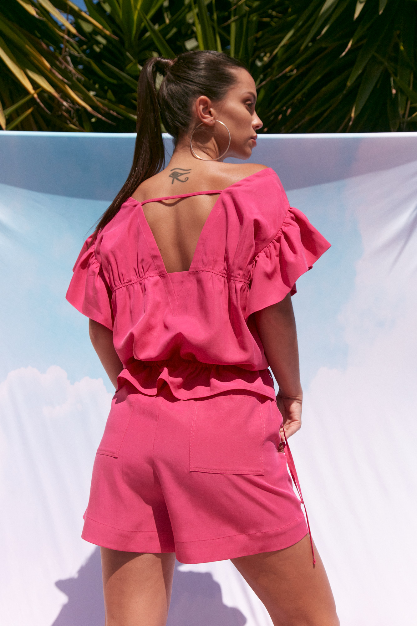 Szorty mają w talii szeroką gumę z dodatkowym troczkiem w pasie, naszywane kieszenie z przodu i z tyłu.