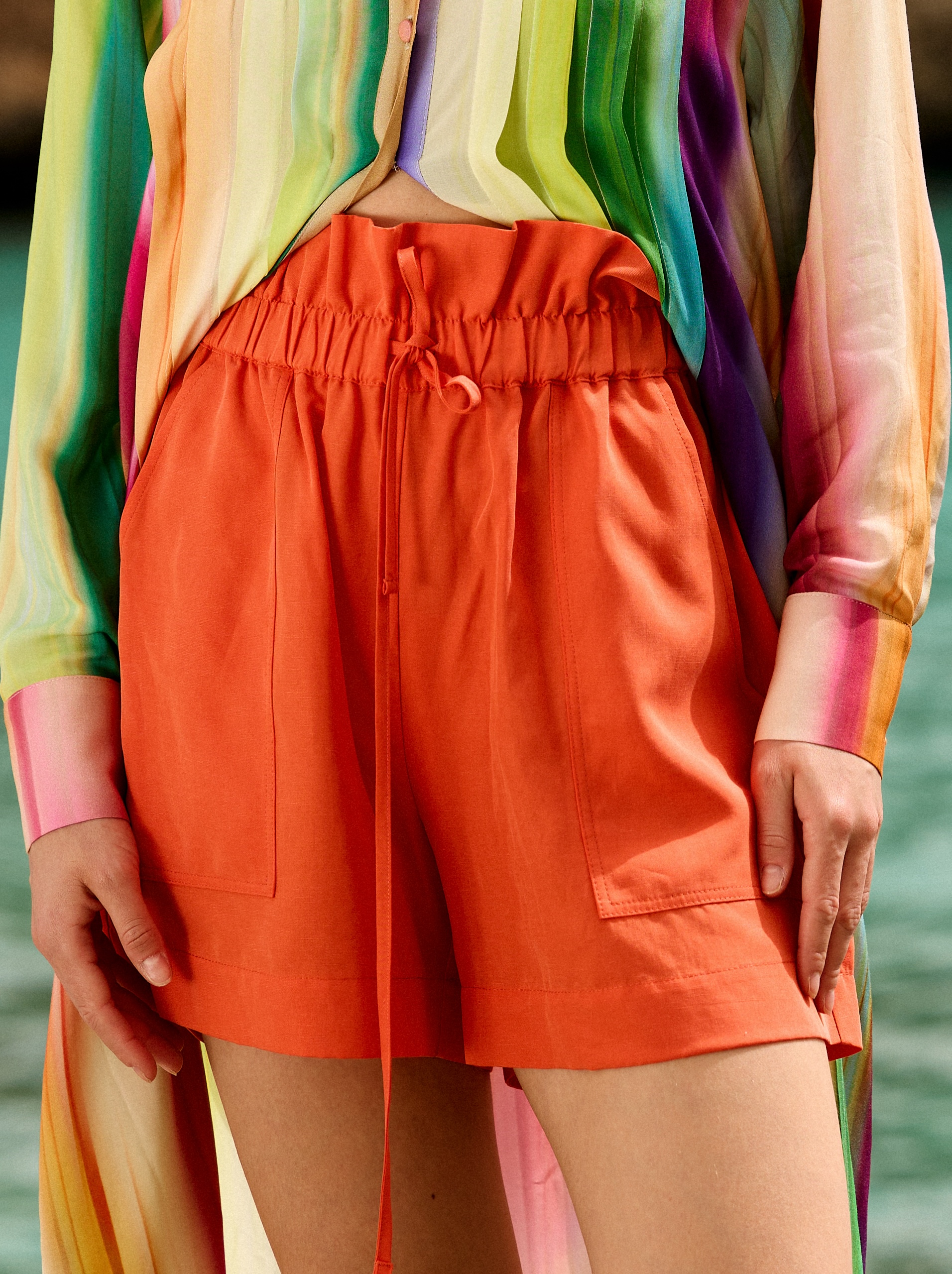 Szorty mają w talii szeroką gumę z dodatkowym troczkiem w pasie, naszywane kieszenie z przodu i z tyłu.