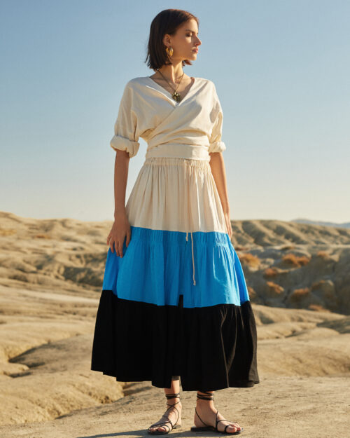 Duży rozporek z przodu podkreśla jej wakacyjny urok, doskonale wygląda z naszym topem CALI w komplecie.