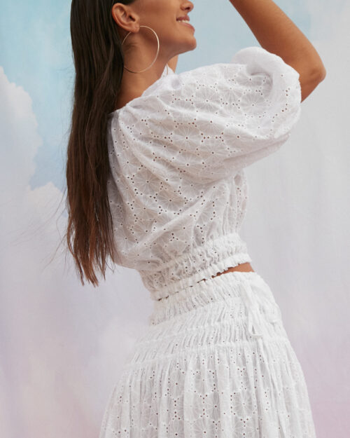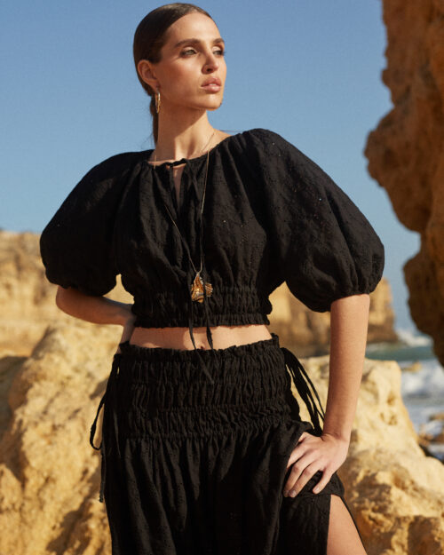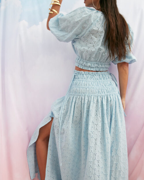 800,00 złKomplet bluzka ze spódnicą w haftowanej tkaninie. Szerokie rękawy, bufki, top zakończony w pasie gumkami, co stanowi idealną całość ze spódnicą, która ma rząd gumek na biodrach.