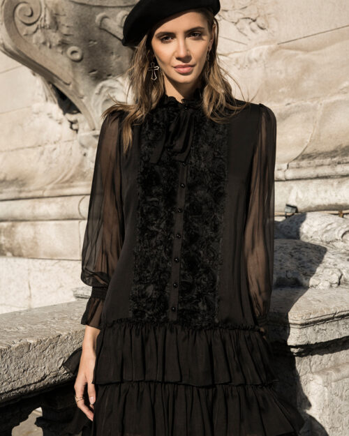 Góra sukienki została zaprojektowana z dekoracyjną stójką oraz długą, miękką szarfą przy dekolcie, którą można swobodnie układać lub zawiązać, nadając stylizacji indywidualny charakter. Rękawy są długie, lekko bufiaste, zakończone elastycznymi, marszczonymi mankietami, co dodaje całości kobiecej finezji.
