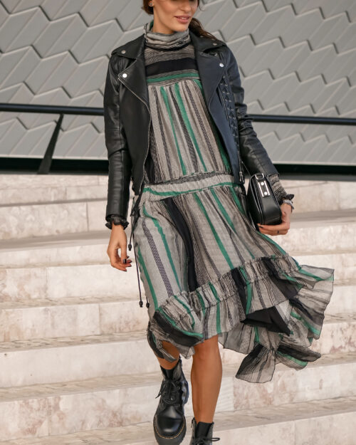 1280,00 złPierwotna cena wynosiła: 1280,00 zł.480,00 złAktualna cena wynosi: 480,00 zł.Ta jedwabna sukienka midi zachwyca lekkością i swobodą, łącząc naturalny komfort z wyrafinowanym stylem. Delikatna tkanina układa się miękko na sylwetce, a wzór pasków w odcieniach zieleni, czerni i szarości dodaje jej charakteru i subtelnej elegancji. Luźny krój z odcinaną talią i asymetryczną falbaną tworzy płynny, kobiecy kształt, który porusza się z każdym krokiem. Długie, lekko bufiaste rękawy zakończone elastycznymi mankietami oraz miękka stójka podkreślają harmonijną, nieco romantyczną linię sukienki. To model, który sprawdzi się zarówno na co dzień, jak i podczas wyjątkowych okazji — wystarczy dobrać ulubione kozaki lub minimalistyczne dodatki, by stworzyć stylizację pełną klasy i naturalnego szyku.
