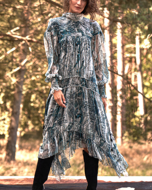 1280,00 złPierwotna cena wynosiła: 1280,00 zł.480,00 złAktualna cena wynosi: 480,00 zł.Ta jedwabna sukienka midi zachwyca oryginalnym, inspirowanym naturą wzorem, w którym przeplatają się odcienie błękitu, szarości i turkusu, tworząc nowoczesną interpretację motywów zwierzęcych. Delikatny jedwab miękko układa się na sylwetce, nadając całości lekkości i subtelnej elegancji. Luźny, swobodny krój z odcięciem w talii i wielowarstwowymi falbanami tworzy efekt płynnego, nieco romantycznego ruchu. Bufiaste rękawy zakończone marszczonym mankietem oraz miękka stójka podkreślają kobiecy charakter sukienki, dodając jej finezyjnego wykończenia. To model idealny na wyjątkowe okazje, spotkania czy wieczorne wyjścia — wyrazisty, a jednocześnie niezwykle lekki i komfortowy w noszeniu.Sukienka jedwabna LOLA