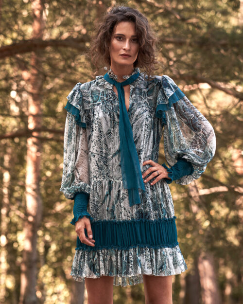Ta jedwabna sukienka midi zachwyca oryginalnym, inspirowanym naturą wzorem, w którym przeplatają się odcienie błękitu, szarości i turkusu, tworząc nowoczesną interpretację motywów zwierzęcych. Delikatny jedwab miękko układa się na sylwetce, nadając całości lekkości i subtelnej elegancji. Luźny, swobodny krój z odcięciem w talii i wielowarstwowymi falbanami tworzy efekt płynnego, nieco romantycznego ruchu. Bufiaste rękawy zakończone marszczonym mankietem oraz miękka stójka podkreślają kobiecy charakter sukienki, dodając jej finezyjnego wykończenia. To model idealny na wyjątkowe okazje, spotkania czy wieczorne wyjścia — wyrazisty, a jednocześnie niezwykle lekki i komfortowy w noszeniu.